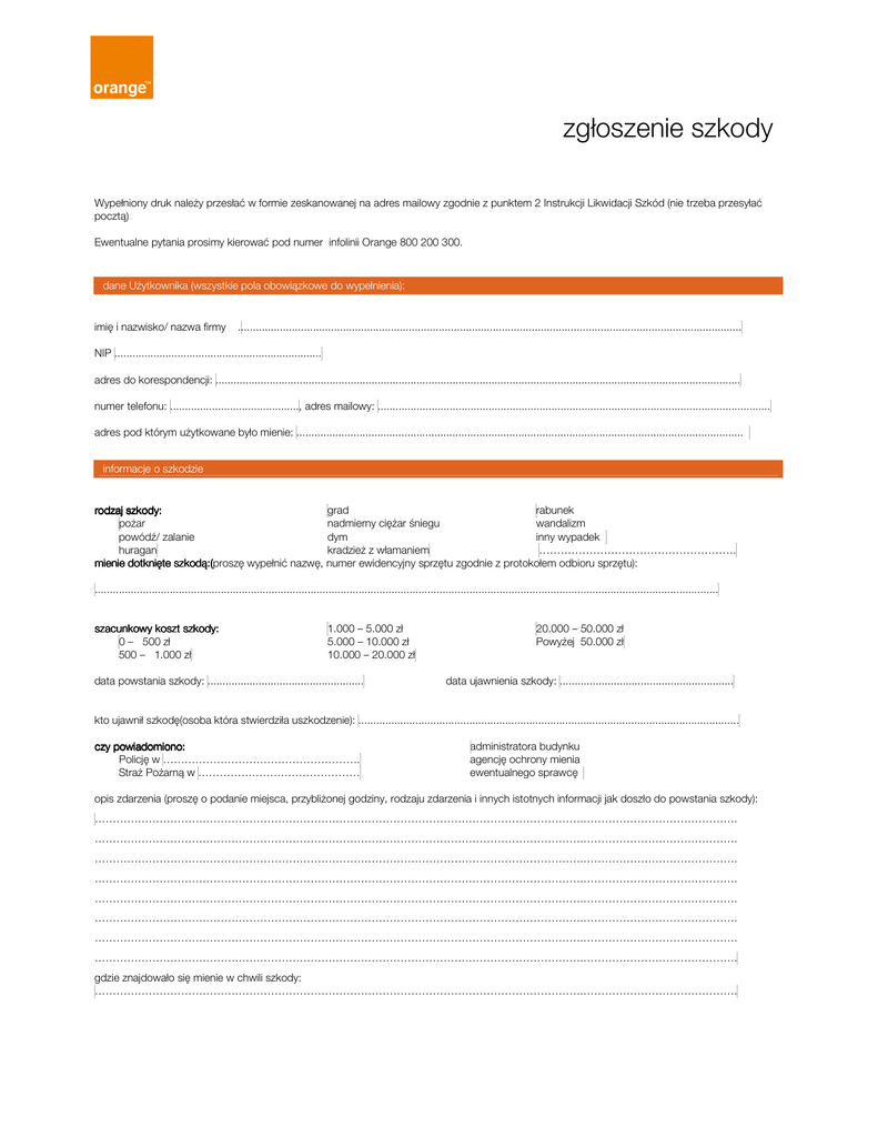zgłoszenie szkody Wypełniony druk należy przesłać w formie zeskanowanej na adres mailowy zgodnie z punktem 2 Instrukcji Likwidacji Szkód (nie trzeba przesyłać pocztą) Ewentualne pytania prosimy kierować pod numer infolinii Orange 800 200 300. dane Użytkownika (wszystkie pola obowiązkowe do wypełnienia): imię i nazwisko/ nazwa firmy ........................................................................................................................................................................ NIP ..................................................................... adres do korespondencji: ............................................................................................................................................................................... numer telefonu: ..........................................., adres mailowy: ................................................................................................................................... adres pod którym użytkowane było mienie: ..................................................................................................................................................... informacje o szkodzie rodzaj szkody: grad rabunek pożar nadmierny ciężar śniegu wandalizm powódź/ zalanie dym inny wypadek huragan kradzież z włamaniem ………………………………………………. mienie dotknięte wypełnić nazwę, numer ewidencyjny sprzętu zgodnie z protokołem odbioru sprzętu): dotknięte szkodą:(proszę szkodą:( ................................................................................................................................................................................................................ szacunkowy koszt szkody: 0 – 500 zł 500 – 1.000 zł 1.000 – 5.000 zł 5.000 – 10.000 zł 10.000 – 20.000 zł data powstania szkody: .................................................... 20.000 – 50.000 zł Powyżej 50.000 zł data ujawnienia szkody: .......................................................... kto ujawnił szkodę(osoba która stwierdziła uszkodzenie): ............................................................................................................................... czy powiadomiono: Policję w ………………………………………………. Straż Pożarną w ……………………………………… administratora budynku agencję ochrony mienia ewentualnego sprawcę opis zdarzenia (proszę o podanie miejsca, przybliżonej godziny, rodzaju zdarzenia i innych istotnych informacji jak doszło do powstania szkody): ……………………………………………………………………………………………………………………….……………………………………. ……………………………………………………………………………………………………………………….……………………………………. ……………………………………………………………………………………………………………………….……………………………………. ……………………………………………………………………………………………………………………….……………………………………. ……………………………………………………………………………………………………………………….……………………………………. ……………………………………………………………………………………………………………………….……………………………………. ……………………………………………………………………………………………………………………….……………………………………. ……………………………………………………………………………………………………………………….……………………………………. gdzie znajdowało się mienie w chwili szkody: ……………………………………………………………………………………………………………………….……………………………………. opis zabezpieczeń obiektu: czujniki dymu system tryskaczy alarm lokalny alarm z powiadomieniem monitoring agencji ochr. opis zabezpieczeń w pojeździe: pojazd był w garażu pojazd był na parkingu strzeżonym pojazd miał twardy kabriolet) sprzęt był w bagażniku stały dozór agencji ochr. szyby antywłamaniowe żaluzje, kraty, rolety inny dach (nie sprzęt był w innym miejscu niż bagażnik – jakim? ................................................................ w przypadku zaznaczenia „inny”– proszę opisać: ………………………………………………………………… czy system uaktywniony: zabezpieczeń był tak nie czy system zadziałał? zabezpieczeń tak nie informacje dodatkowe dane ewentualnego sprawcy zdarzenia (jeśli jest znany): ……………………………………………………………………………………………………………………….……………………………………. dane ubezpieczyciela sprawcy zdarzenia i numer polisy sprawcy: ……………………………………………………………………………………………………………………….……………………………………. Do niniejszego niniejszego Zgłoszenia należy załączyć wszystkie dostępne dokumenty, które mogą być przydatne przy likwidacji szkody: Wykaz strat. Zdjęcia uszkodzonego mienia i/lub zdjęcia wykonane na miejscu dokumentujące zdarzenie np. Zalanie. W przypadku szkody typu: pożar, kradzież z włamaniem bądź rabunek dodatkowo: − potwierdzenie zgłoszenia zdarzenia na policję / prokuraturę / straż pożarną (w przypadku braku takiej możliwości, zebrać dane adresowe 