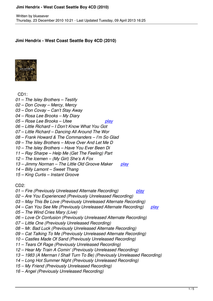 Jimi Hendrix - West Coast Seattle Boy 4CD (2010) Written by bluesever Thursday, 23 December 2010 10:21 - Last Updated Tuesday, 09 April 2013 16:25 Jimi Hendrix - West Coast Seattle Boy 4CD (2010) CD1: 01 – The Isley Brothers – Testify 02 – Don Covay – Mercy, Mercy 03 – Don Covay – Can’t Stay Away 04 – Rosa Lee Brooks – My Diary 05 – Rose Lee Brooks – Utee play 06 – Little Richard – I Don’t Know What You Got 07 – Little Richard – Dancing All Around The Wor 08 – Frank Howard & The Commanders – I’m So Glad 09 – The Isley Brothers – Move Over And Let Me D 10 – The Isley Brothers – Have You Ever Been Di 11 – Ray Sharpe – Help Me (Get The Feeling) Part 12 – The Icemen – (My Girl) She’s A Fox 13 – Jimmy Norman – The Little Old Groove Maker play 14 – Billy Lamont – Sweet Thang 15 – King Curtis – Instant Groove CD2: 01 – Fire (Previously Unreleased Alternate Recording) play 02 – Are You Experienced (Previously Unreleased Recording) 03 – May This Be Love (Previously Unreleased Alternate Recording) 04 – Can You See Me (Previously Unreleased Alternate Recording) play 05 – The Wind Cries Mary (Live) 06 – Love Or Confusion (Previously Unreleased Alternate Recording) 07 – Little One (Previously Unreleased Recording) 08 – Mr. Bad Luck (Previously Unreleased Alternate Recording) 09 – Cat Talking To Me (Previously Unreleased Alternate Recording) 10 – Castles Made Of Sand (Previously Unreleased Recording) 11 – Tears Of Rage (Previously Unreleased Recording) 12 – Hear My Train A Comin’ (Previously Unreleased Recording) 13 – 1983 (A Merman I Shall Turn To Be) (Previously Unreleased Recording) 14 – Long Hot Summer Night (Previously Unreleased Recording) 15 – My Friend (Previously Unreleased Recording) 16 – Angel (Previously Unreleased Recording) 1/5 Jimi Hendrix - West Coast Seattle Boy 4CD (2010) Written by bluesever Thursday, 23 December 2010 10:21 - Last Updated Tuesday, 09 April 2013 16:25 17 – Calling All The Devil’s Children (Previously Unreleased Recording) 18 – New Rising Sun (Previously Unreleased Alternate Recording) CD3: 01 – Hear My Freedom (Previously Unreleased Recording) 02 – Room Full Of Mirrors (Previously Unreleased Recording) play 03 – Shame, Shame, Shame (Previously Unreleased Recording) 04 – Messenger (Previously Unreleased Recording) 05 – Hound Dog Blues (Previously Unreleased Recording) 06 – Untitled Basic Track (Previously Unreleased Recording) 07 – Star Spangled Banner (Live) (Previously Unreleased Original Mix) 08 – Purple Haze (Live) (Previously Unreleased Original Mix) 09 – YoungHendrix (Previously Unreleased Alternate Recording) 10 – Mastermind (Previously Unreleased Recording) 11 – Message To Love (Previously Unreleased Alternate Recording) 12 – Fire (Live) (Previously Unreleased Recording) 13 – Foxey Lady (Live) (Previously Unreleased Recording) CD4: 01 – Stone Free (Live) (Previously Unreleased Recording) 02 – Burning Desire (Previously Unreleased Recording) 03 – Lonely Avenue (Previously Unreleased Recording) 04 – Everlasting First (Previously Unreleased Alternate Recording) 05 – Freedom (Previously Unreleased Recording) 06 – Peter GunnCatastrophe (Previously Unreleased Alternate Recording) 07 – In From The Storm (Previously Unreleased Alternate Recording) play 08 – All God’s Children (Previously Unreleased Recording) play 09 – Red House (Live) (Previously Unreleased Recording) 10 – Play That Riff (Previously Unreleased Recording) 11 – Bolero (Previously Unreleased Alternate Recording) 12 – Hey Baby (New Rising Sun) (Previously Unreleased Alternate Recording) 13 – Suddenly November Morning (Previously Unreleased Recording) "West Coast Seattle Boy: The Jimi Hendrix Anthology" to unikalny zbiór stanowiący niezapomnianą podróżą przez artystyczną karierę Jimi'ego od początku jego przygody z muzyką aż do chwili, kiedy zdobył światowe uznanie. Antologia po raz pierwszy prezentuje najbardziej poszukiwane nagrania sprzed powstania zespołu The Jimi Hendrix Experience z czasów, gdy Jimi grywał jako sideman dla takich gwiazd Rhytm & Bluesa jak The Isley Brothers, Don Covay, Little Richard i wielu innych. 2/5 Jimi Hendrix - West Coast Seattle Boy 4CD (2010) Written by bluesever Thursday, 23 December 2010 10:21 - Last Updated Tuesday, 09 April 2013 16:25 Album DVD przedstawia historię życia Jimi'ego, opowiedzianą jego własnymi słowami. Legendarny funkowy basista Bootsy Collins przywraca do życia słowa i historię Jimi'ego. Materiał zawiera niezwykłe ,nigdy wcześniej nie oglądane materiały filmowe oraz zdjęcia min. rodzinne archiwum Henrix'ów , własnoręczne rysunki Jimiego, pocztówki wysyłane do ojca, brudnopisy piosenek, szkice tekstów. Ta wyjątkowa 90 minutowa prezentacja to prawdziwa kopalnia wiedzy dla wszystkich fanów Wirtuoza Gitary. The long-awaited career-spanning box set tracks Hendrix’s remarkable journey from little known R&B sideman to international stardom through an unprecedented assemblage of previously unavailable recordings. West Coast Seattle Boy – The Jimi Hendrix Anthology is not a collection of existing Jimi Hendrix albums but instead 45 unreleased Jimi Hendrix live and studio recordings including demos and alternate versions of songs from Are You Experienced, Axis: Bold As Love, and Electric Ladyland. West Coast Seattle Boy includes Hendrix’s never before heard version of Bob Dylan’s ‘Tears Of Rage,” solo acoustic recordings of Electric Ladyland favorites like “Long Hot Summer Night” and “1983 (A Merman I Shall Turn To Be)” as well as never before heard live performances from Berkeley and the legendary Band Of Gypsys Fillmore East concert on New Year’s Eve 1969 combined together with such new Hendrix songs as “Hear My Freedom,” “Hound Dog Blues,” “Lonely Avenue” and more. A centerpiece achievement in Legacy Recordings’ monumental Jimi Hen
