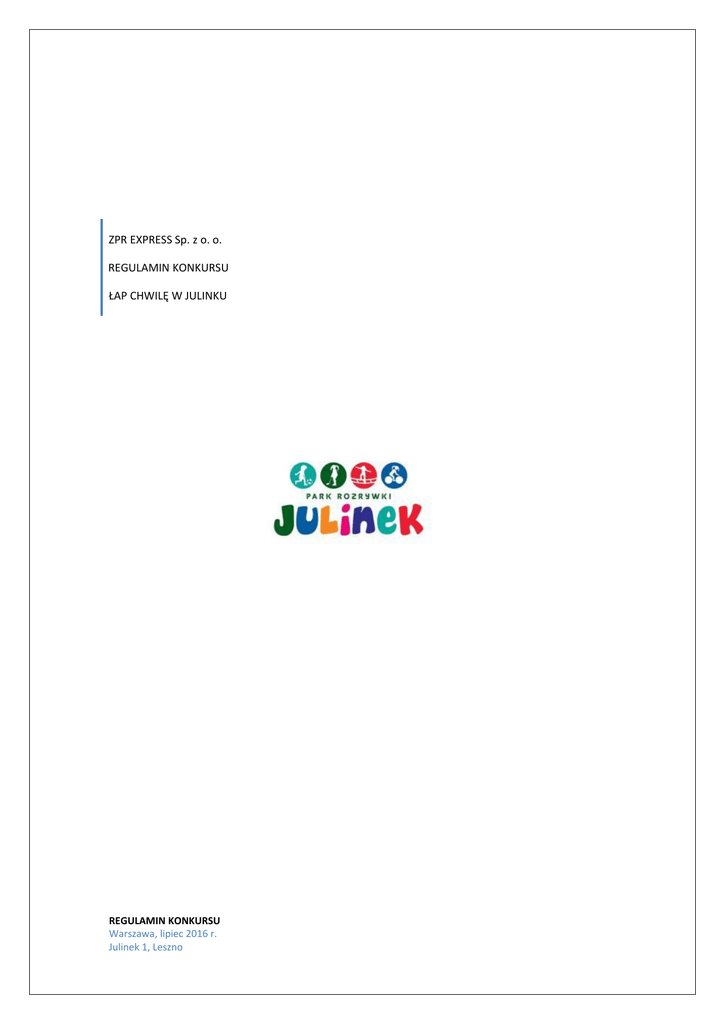 ZPR EXPRESS Sp. z o. o. REGULAMIN KONKURSU ŁAP CHWILĘ W JULINKU REGULAMIN KONKURSU Warszawa, lipiec 2016 r. Julinek 1, Leszno „Łap chwilę w Julinku” §1 Definicje 1. 2. 3. 4. 5. Konkurs: Konkurs organizowany jest pod nazwą „Łap chwilę w Julinku”; Organizator: ZPR EXPRESS Spółką z ograniczoną odpowiedzialnością, z siedzibą w Warszawie, adres: ul. Jubilerska 10, 04-190 Warszawa, wpisaną do Rejestru Przedsiębiorców Krajowego Rejestru Sądowego pod nr KRS 0000023083, zwana dalej „Organizatorem”. Wydarzenia: Wydarzenia w Parku Rozrywki Julinek odbywające się w każdą sobotę i niedzielę od 16.07.2016r. do 04.09.2016r. Portal Facebook - portal internetowy działający w domenie http://www.facebook.pl/; Profil Organizatora – oficjalny profil Organizatora utworzony na Portalu Facebook „Par Rozrywki Julinek” (https://www.facebook.com/julinekpark). §2 Postanowienia ogólne 1. 2. 3. 4. 5. Regulamin określa warunki, zakres i zasady uczestnictwa w Konkursie. Informacje na temat Konkursu oraz treść niniejszego Regulaminu jest dostępna dla wszystkich Uczestników Konkursu na stronie internetowej www.julinek.com.pl. Konkurs rozpoczyna się w dniu 16 lipca 2016 roku o godzinie 10.00 i kończy się w dniu 4 września 2016 o godzinie 19.00. Konkurs dotyczy opisanych w niniejszym Regulaminie wydarzeń. Konkurs zostanie przeprowadzony na podstawie zasad opisanych w niniejszym Regulaminie. §3 Uczestnictwo w konkursie 1. 2. 3. 4. 5. 6. 7. Przystąpienie do Konkursu i udział w Konkursie są całkowicie dobrowolne. Zgłoszenie udziału w Konkursie jest równoznaczne z zaakceptowaniem niniejszego Regulaminu i wyrażeniem przez Uczestnika zgody na przetwarzanie przez Organizatora danych osobowych na potrzeby Konkursu oraz w celach marketingowych, zgodnie z ustawą o ochronie danych osobowych z dnia 29.08.1997 roku, a także z wyrażeniem przez Uczestnika zgody na opublikowanie jego wizerunku w związku z Konkursem. W Konkursie nie mogą brać udziału pracownicy Organizatora oraz pracownicy podmiotów współpracujących przy przygotowaniu i realizacji Konkursu, lub inne osoby biorące udział w jakikolwiek sposób w organizacji i przeprowadzeniu Konkursu. Uczestnikiem Konkursu może być każda pełnoletnia osoba fizyczna, posiadająca pełną zdolność do czynności prawnych, która w dniu rozpoczęcia Konkursu posiada miejsce stałego zamieszkania na terytorium Rzeczypospolitej Polskiej. Biorąc udział w Konkursie Uczestnik akceptuje Regulamin. Organizator zastrzega sobie prawo do weryfikacji spełnienia przez Uczestnika warunków uczestnictwa, w tym zastrzega sobie prawo do odmowy wyrażenia zgody na uczestnictwo danej osoby w Konkursie. Portal Facebook nie jest organizatorem Konkursu. §4 Zasady konkursu 1. 2. 3. Warunkiem udziału w Konkursie jest: a. Wykonanie autorskiego zdjęcia z własnym wizerunkiem Uczestnika, tzw. Selfie w Parku Rozrywki Julinek, Julinek 1, Leszno k/Warszawy 05-084 podczas wydarzeń odbywających się w Parku Rozrywki Julinek do 4 września 2016r., bądź w trakcie odwiedzin, korzystania z atrakcji Parku w dowolnym dniu, do końca sierpnia 2016. b. Dodanie zdjęcia (selfie) w komentarzu pod postem o Konkursie na profilu Parku Rozrywki Julinek na Facebooku (facebook.com/noclegijulinek) Każdy Uczestnik może przesłać maksymalnie jedno zdjęcie w ciągu jednego weekendu (sobota, niedziela). Uczestnik konkursu wysyłając Zdjęcie oświadcza, iż przysługują mu wyłączne i nieograniczone prawa autorskie do wstawionych zdjęć i nie naruszają one w żaden sposób dóbr osób trzecich. Ponadto oświadcza, że wyraża zgodę na publikowanie nagrodzonego Zdjęcia oraz opublikowanie jego imienia i nazwiska w materiałach promocyjnych związanych z 1 4. 5. 6. Konkursem na stronie internetowej Organizatora, a także na profilu Facebook, w tym w szczególności rozpowszechniania poprzez publiczne udostępnianie w taki sposób, aby każdy mógł mieć do niego dostęp w miejscu i w czasie przez siebie wybranym, w szczególności w sieciach komputerowych oraz Internecie. W przypadku, gdy na Zdjęciu został utrwalony wizerunek innych niż Uczestnik osób, Uczestnik oświadcza, że posiada zgody powyższych osób na rozpowszechnianie ich wizerunku utrwalonego na Zdjęciu wraz z prawem do udzielenia powyższej zgody Organizatorowi. Uczestnik przejmuje na siebie pełną odpowiedzialność w przypadku, gdy osoba trzecia będzie formułowała roszczenia dotyczące pracy zgłoszonej do Konkursu. Niedopuszczalne jest zgłoszenie przez Uczestnika do Konkursu, które zawiera treści sprzeczne z prawem, uznawane powszechnie za społecznie niewłaściwe, obraźliwe, wulgarne, sprzeczne z dobrymi obyczajami, sprzeczne z zasadami współżycia społecznego, które mogą być odebrane jako społecznie naganne. Zdjęcia niespełniające wymogów Regulaminu, w tym zawierające treści niedopuszczalne zgodnie z postanowieniami z Regulaminu, nie biorą udziału w Konkursie. Organizator zastrzega sobie prawo do usunięcia wszelkich zdjęć nie spełniających warunków najniższego regulaminu. §5 Nagrody 1. 2. 3. 4. Nagrodą w konkursie jest podwójny karnet upoważniający zwycięzcę z osobą towarzyszącą, do całodniowego, nieodpłatnego korzystania z atrakcji Parku Rozrywki Julinek, do wykorzystania w sezonie 2016r/2017r. Organizator wyłoni 8 zwycięzców nagród po jednym zwycięscy tygodniowo w ciągu 5 dni roboczych od danego wydarzenia w każdym tygodniu. Organizator zastrzega sobie prawo do wyłonienia zwycięzcy poprzez 3 osobową komisję powołaną przez organizatora. Zwycięzcą zostanie właściciel wyłonionego przez komisję zdjęcia, które według komisji jest najbardziej ciekawym zdjęciem o nietypowym uchwyceniu tematyki związanej z Parkiem Rozrywki Julinek. §6 Postanowienia końcowe 1. Uczestnictwa w konkursie, jak i praw i obowiązków z nim związanych, w tym prawa żądania do wydania nagród, nie można przenosić na osoby trzecie. 