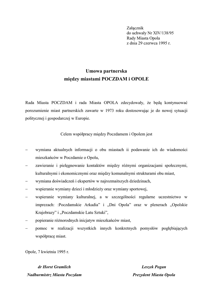 Załącznik do uchwały Nr XIV/138/95 Rady Miasta Opola z dnia 29 czerwca 1995 r. Umowa partnerska między miastami POCZDAM i OPOLE Rada Miasta POCZDAM i rada Miasta OPOLA zdecydowały, że będą kontynuować porozumienie miast partnerskich zawarte w 1973 roku dostosowując je do nowej sytuacji politycznej i gospodarczej w Europie. Celem współpracy między Poczdamem i Opolem jest wymiana aktualnych informacji o obu miastach ii podawanie ich do wiadomości mieszkańców w Poczdamie o Opolu, zawieranie i pielęgnowanie kontaktów między różnymi organizacjami społecznymi, kulturalnymi i ekonomicznymi oraz między komunalnymi strukturami obu miast, wymiana doświadczeń i ekspertów w najrozmaitszych dziedzinach, wspieranie wymiany dzieci i młodzieży oraz wymiany sportowej, wspieranie wymiany kulturalnej, a w szczególności regularne uczestnictwo w imprezach: :Poczdamskie Arkadia” i „Dni Opola” oraz w plenerach „Opolskie Krajobrazy” i „Poczdamskie Latu Sztuki”, popieranie różnorodnych inicjatyw mieszkańców miast, pomoc w realizacji wszystkich innych konkretnych pomysłów pogłębiających współpracę miast. Opole, 7 kwietnia 1995 r. dr Horst Gramlich Leszek Pogan Nadburmistrz Miasta Poczdam Prezydent Miasta Opola Partnerschaftsvertrag zwischen den Stadten Potsdam und Opole Die Stadtverordnetenversammlung der Stadt Potsdam und der Rat der Stadt Opole haben sich dazu entschlossen, die seit 1973 bestehende Stadtepartnerschaft mit einer neuen, an die veranderen politischen und gesselschaftlichen Verhaltnisse in Europa angepaßten Vereinbarung fortzufuhren und zu festigen. Ziel der Partnerschaftsarbeit zwischen Potsdam und Opole ist es aktuelle Informationen uber die beiden Stadte auszutauschen und się so bei den Einwohnern in Potsdam und Opole bekannt zu machen, Kontakte zwischen den gesellschaftlichen, kulturellen und okonomischen Organisatonenden und den kommunalen Strukturen der beiden Stadte aufzunehmen und bestehende Beziehungen zu pflegen, der Erfahrungs und Expertenaustausch in den verschiedensten Bereichen zu entwickeln, der Kinder und Jugendaustausch sowie den sportlichen Austausch zu fordern, den kulturellen Austauch zu unterstutzen. Hierbei sind insbesondere die „Potsdamer Arkadien” und die „Tage Opoles” sowie das Plenair „Opoler Landschaften” und der „Potsdamer Kunstomer” als regelmaBige Foren zu nutzen, die partnerschaftlichen Eigeninitiativen der Bevolkerung zu unterstutzen, die Verwirklichung jedweder aderer konkreter Zusammenarbeit zu fordern. Opole, den 7 kwietnia 1995 r. Leszek Pogan Dr Horst Gramlich Stadtprasident der Stadt Opole Oberburgermeister der Stadt Potsdam