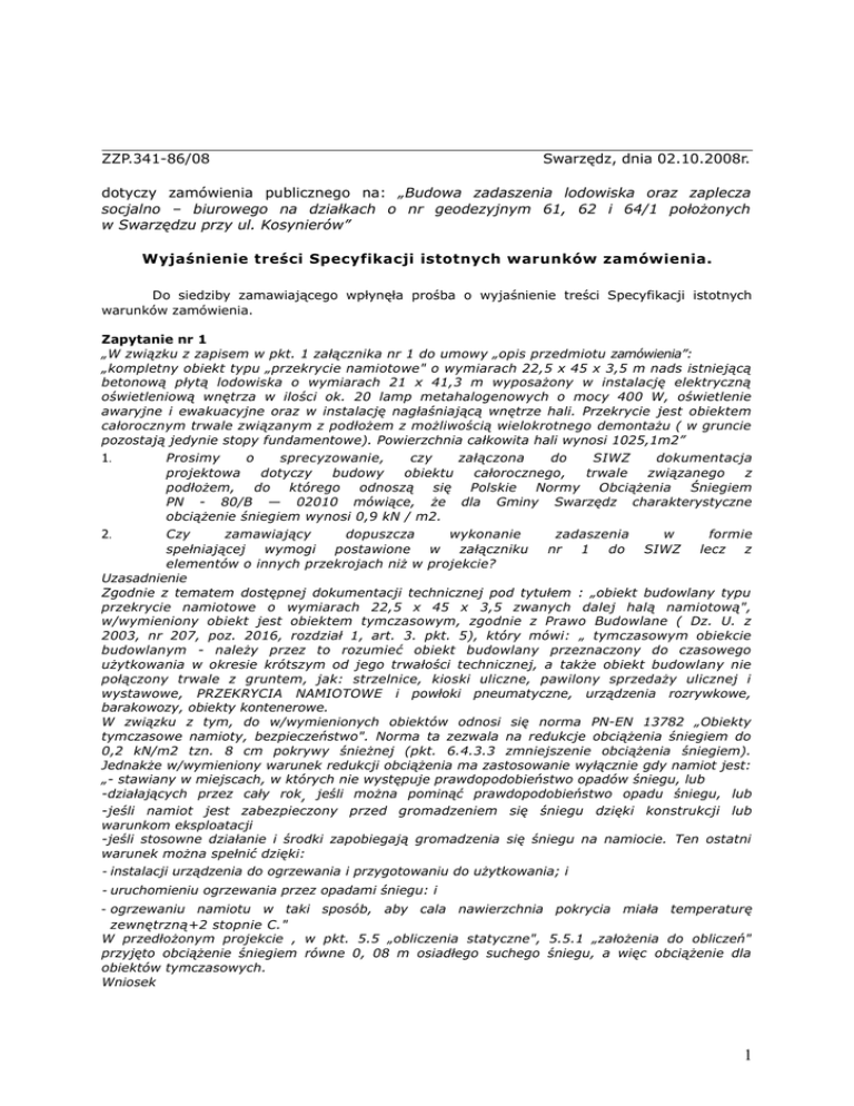 ZZP.341-86/08 Swarzędz, dnia 02.10.2008r. dotyczy zamówienia publicznego na: „Budowa zadaszenia lodowiska oraz zaplecza socjalno – biurowego na działkach o nr geodezyjnym 61, 62 i 64/1 położonych w Swarzędzu przy ul. Kosynierów” Wyjaśnienie treści Specyfikacji istotnych warunków zamówienia. Do siedziby zamawiającego wpłynęła prośba o wyjaśnienie treści Specyfikacji istotnych warunków zamówienia. Zapytanie nr 1 „W związku z zapisem w pkt. 1 załącznika nr 1 do umowy „opis przedmiotu zamówienia”: „kompletny obiekt typu „przekrycie namiotowe" o wymiarach 22,5 x 45 x 3,5 m nads istniejącą betonową płytą lodowiska o wymiarach 21 x 41,3 m wyposażony w instalację elektryczną oświetleniową wnętrza w ilości ok. 20 lamp metahalogenowych o mocy 400 W, oświetlenie awaryjne i ewakuacyjne oraz w instalację nagłaśniającą wnętrze hali. Przekrycie jest obiektem całorocznym trwale związanym z podłożem z możliwością wielokrotnego demontażu ( w gruncie pozostają jedynie stopy fundamentowe). Powierzchnia całkowita hali wynosi 1025,1m2” 1. Prosimy o sprecyzowanie, czy załączona do SIWZ dokumentacja projektowa dotyczy budowy obiektu całorocznego, trwale związanego z podłożem, do którego odnoszą się Polskie Normy Obciążenia Śniegiem PN - 80/B — 02010 mówiące, że dla Gminy Swarzędz charakterystyczne obciążenie śniegiem wynosi 0,9 kN / m2. 2. Czy zamawiający dopuszcza wykonanie zadaszenia w formie spełniającej wymogi postawione w załączniku nr 1 do SIWZ lecz z elementów o innych przekrojach niż w projekcie? Uzasadnienie Zgodnie z tematem dostępnej dokumentacji technicznej pod tytułem : „obiekt budowlany typu przekrycie namiotowe o wymiarach 22,5 x 45 x 3,5 zwanych dalej halą namiotową", w/wymieniony obiekt jest obiektem tymczasowym, zgodnie z Prawo Budowlane ( Dz. U. z 2003, nr 207, poz. 2016, rozdział 1, art. 3. pkt. 5), który mówi: „ tymczasowym obiekcie budowlanym - należy przez to rozumieć obiekt budowlany przeznaczony do czasowego użytkowania w okresie krótszym od jego trwałości technicznej, a także obiekt budowlany nie połączony trwale z gruntem, jak: strzelnice, kioski uliczne, pawilony sprzedaży ulicznej i wystawowe, PRZEKRYCIA NAMIOTOWE i powłoki pneumatyczne, urządzenia rozrywkowe, barakowozy, obiekty kontenerowe. W związku z tym, do w/wymienionych obiektów odnosi się norma PN-EN 13782 „Obiekty tymczasowe namioty, bezpieczeństwo". Norma ta zezwala na redukcje obciążenia śniegiem do 0,2 kN/m2 tzn. 8 cm pokrywy śnieżnej (pkt. 6.4.3.3 zmniejszenie obciążenia śniegiem). Jednakże w/wymieniony warunek redukcji obciążenia ma zastosowanie wyłącznie gdy namiot jest: „- stawiany w miejscach, w których nie występuje prawdopodobieństwo opadów śniegu, lub -działających przez cały rok, jeśli można pominąć prawdopodobieństwo opadu śniegu, lub -jeśli namiot jest zabezpieczony przed gromadzeniem się śniegu dzięki konstrukcji lub warunkom eksploatacji -jeśli stosowne działanie i środki zapobiegają gromadzenia się śniegu na namiocie. Ten ostatni warunek można spełnić dzięki: - instalacji urządzenia do ogrzewania i przygotowaniu do użytkowania; i - uruchomieniu ogrzewania przez opadami śniegu: i - ogrzewaniu namiotu w taki sposób, aby cala nawierzchnia pokrycia miała temperaturę zewnętrzną+2 stopnie C." W przedłożonym projekcie , w pkt. 5.5 „obliczenia statyczne", 5.5.1 „założenia do obliczeń" przyjęto obciążenie śniegiem równe 0, 08 m osiadłego suchego śniegu, a więc obciążenie dla obiektów tymczasowych. Wniosek 1 Uznajemy, że przedłożona dokumentacja techniczna nie spełnia wymagań sprecyzowanych w przedmiocie zamówienia, w załączniku 1 „ przekrycie jest obiektem całorocznym trwałe związanym z ziemią...”, ponieważ dotyczy obiektów tymczasowych i nic gwarantuje przyjętego przez PN -80 / B — 02010 dla Swarzędza obciążenia śniegiem wynoszącego 0,9 kN / m2, a tym samym tworzy zagrożenie dla zdrowia i życia użytkowników lodowiska.” Odpowiedź nr 1 1. Tak - załączona do SIWZ dokumentacja projektowa dotyczy budowy obiektu całorocznego, trwale związanego z podłożem, do którego odnoszą się Polskie Normy Obciążenia Śniegiem PN - 80/B — 02010 mówiące, że dla Gminy Swarzędz charakterystyczne obciążenie śniegiem wynosi 0,9 kN / m2. Przedmiotowa dokumentacja projektowa zawiera błąd w pisowni. W związku z tym wprowadza się następujące zmiany do załącznika „Dokumentacja techniczna”: Na stronie 10 podpunkt 5.5.1. było: „- śnieg ze względu na charakter konstrukcji obiektu obciążenie śniegiem zredukowano do warstwy grubości grubości: 0,16 m świeżo spadłego (do kilku godzin), 0,08 m osiadłego suchego (do kilku dni) Użytkownik jest zobowiązany do niezwłocznego usuwania z połaci dachu pokrywy śniegu o grubości przekraczającej podaną wyżej”. Jest: - śnieg ze względu na charakter konstrukcji obiektu obciążenie śniegiem zredukowano do wartości grubości: 0,50 m świeżo spadłego (do kilku godzin). Użytkownik jest zobowiązany do niezwłocznego usuwania z połaci dachu pokrywy śniegu o grubości przekraczającej podaną wyżej”. 2. Zamawiający nie może odnieść się do zapytania postawionego w przedmiotowej formie. W celu umożliwienia udzielenia odpowiedzi prosimy o wyspecyfikowanie elementów, których mają dotyczyć ewentualne zmiany wraz z informacją na temat proponowanych rozwiązań technicznych. 2