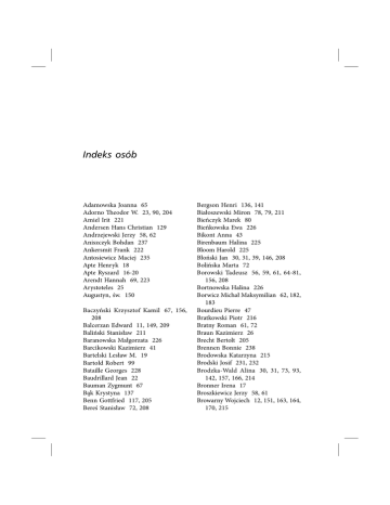 Indeks osób Adamowska Joanna 65 Adorno Theodor W. 23, 90, 204 Amiel Irit 221 Andersen Hans Christian 129 Andrzejewski Jerzy 58, 62 Aniszczyk Bohdan 237 Ankersmit Frank 222 Antosiewicz Maciej 235 Apte Henryk 18 Apte Ryszard 16-20 Arendt Hannah 69, 223 Arystoteles 25 Augustyn, św. 150 Baczyński Krzysztof Kamil 67, 156, 208 Balcerzan Edward 11, 149, 209 Baliński Stanisław 211 Baranowska Małgorzata 226 Barcikowski Kazimierz 41 Bartelski Lesław M. 19 Bartołd Robert 99 Bataille Georges 228 Baudrillard Jean 22 Bauman Zygmunt 67 Bąk Krystyna 137 Benn Gottfried 117, 205 Bereś Stanisław 72, 208 Bergson Henri 136, 141 Białoszewski Miron 78, 79, 211 Bieńczyk Marek 80 Bieńkowska Ewa 226 Bikont Anna 43 Birenbaum Halina 225 Bloom Harold 225 Błoński Jan 30, 31, 39, 146, 208 Bolińska Marta 72 Borowski Tadeusz 56, 59, 61, 64-81, 156, 208 Bortnowska Halina 226 Borwicz Michał Maksymilian 62, 182, 183 Bourdieu Pierre 47 Bratkowski Piotr 216 Bratny Roman 61, 72 Braun Kazimierz 26 Brecht Bertolt 205 Brennen Bonnie 238 Brodowska Katarzyna 215 Brodski Josif 231, 232 Brodzka-Wald Alina 30, 31, 73, 93, 142, 157, 166, 214 Bronner Irena 17 Broszkiewicz Jerzy 58, 61 Browarny Wojciech 12, 151, 163, 164, 170, 215 INDEKS Brzękowski Jan 117 Brzozowski Jacek 209 Brzozowski Tadeusz 217 Buczkowski Leopold 78 Burek Tomasz 26 Burkot Stanisław 73, 209 Burska Lidia 72, 231 Buryła Sławomir 19, 59, 68, 79, 84, 142 Celan Paul 101, 102, 159, 202, 204, 221 Céline Louis-Ferdinand 117, 202, 203 Cichowicz Stanisław 226 Cichy Michał 216, 227 Cieślak Robert 135, 177, 234-236 Cooper James Fenimore 61 Cvetkovski Branko 137 Czapliński Przemysław 11 Czarnacka Agata 67 Czechowicz Józef 107, 121, 122 Dąbrowska Maria 58-60, 86 Dedecius Karl 12 Derrida Jacques 150 Detka Janusz 72 Didi-Huberman Georges 20, 239 Dmitrów Edmund 66 Domańska Ewa 222, 236 Drewnowski Tadeusz 19, 31, 38, 40, 59, 67, 82, 83, 106, 156, 158, 159, 161, 162, 169, 170, 173, 174, 185, 186, 208, 210 Dunikowski Xavery 118, 120, 224 Dzierżyńska Aleksandra 49 Dziewulska Małgorzata 223 Edelman Marek 82 Eichmann Adolf 69 Eliot Thomas Stearns 200, 202 Feldhorn Juliusz 17 Filipowicz Halina 26 OSÓB 241 Forecki Piotr 171 Franciszek Józef I, cesarz austriacki 197 Frącz Stanisław 214 Garlicka Zofia 59 Gilman Sander 49 Ginczanka Zuzanna 62, 64 Ginsberg Allen 201 Głowiński Michał 57, 134, 166 Głuchowski Piotr 16, 17 Goffman Erving 49 Gomulicki Juliusz Wiktor 225 Gomułka Władysław 66 Gosk Hanna 75 Górska Halina 56 Górski Konrad 43 Grass Günter 204, 205 Grochowiak Stanisław 208 Grosman (volksdeutsch z magistratu w Radomsku) 33, 40, 41 Gross Jan Tomasz 127 Gross Natan 17, 158, 160, 166, 174, 211, 221 Grynberg Henryk 51, 99 Gutkowska Katarzyna 237 Gutorow Jacek 225 Hampel Simka 36 Handke Kwiryna 134 Hardt Hanno 238 Hartwig Julia 80 Heidegger Martin 66, 117, 202 Hensel Jürgen 99 Herbert Zbigniew 80, 223 Herling-Grudziński Gustaw 51, 68 Hirsch Marianne 235 Hitler Adolf 39, 117 Hölderlin Friedrich 28, 202 Holland Agnieszka 152 Hopfinger Maryla 50 Horkheimer Max 23 242 INDEKS Höss Rudolf 168 Huelle Paweł 80 Hume David 107 Husserl Edmund 107, 109, 112 Ingarden Roman 109 Iwaszkiewicz Anna (Hania) 62 Iwaszkiewicz Jarosław 58, 62 Janczewska Marta 61 Janicka Elżbieta 31 Janion Maria 21, 23, 24, 31, 43, 72, 82, 147, 157, 158, 161, 234 Janowska Katarzyna 148 Jarema (Jaremianka) Maria 217 Jaskółowa Ewa 219 Jastrun Mieczysław 64, 78 Jaworski Stanisław 216 Jeziorski Ireneusz 180 Joyce James 200 Judt Tony 99, 100 Jung Carl Gustav 196 Jünger Ernst 117, 203 Kafka Franz 159 Kamieńska Anna 80, 211 Kanert Max (Niemiec, hitlerowski urzędnik) 34, 36, 40, 41 Kantor Tadeusz 216, 217 Karasek Krzysztof 203 Kawafis Konstandinos 204 Keff Bożena 49 Kępiński Antoni 13 Kiedaisch Petra 205 Kiepura Eliza 156 Kiernicka Joanna 72, 208 Kirchner Hanna 77 Kisiel Marian 23, 25, 27 Klee Paul 140 Kłak Tadeusz 90 Kłosiński Krzysztof 86, 151, 225 OSÓB Konwicki Tadeusz 79 Kopaliński Władysław 183 Korczak Janusz, właśc. Henryk Goldszmit 57 Kornhauser Julian 237 Korzeniewska Ewa 59, 60 Kossak Zofia 56 Kott Jan 58 Kowalski Marcin 16, 17 Kowalski Władysław 59 Kozłowska Wiesława 208 Krall Hanna 80, 178 Kraskowska Ewa 75 Krawcewicz Barbara 73 Krawczyńska Dorota 31, 55, 70, 73, 93, 98, 142, 157, 214 Krowicki Leszek 71 Królak Sławomir 22 Krupa Bartłomiej 211, 222 Kruszewski Wojciech 93 Krynicki Ryszard 200 Kubiak Ho-Chi Mai 20, 239 Kucia Marek 172 Kuczyńska-Koschany Katarzyna 134 Kundera Milan 152 Kunz Tomasz 26-28, 234 Lachendro Jacek 96 Lawaty Andreas 65 Le Goff Jacques 136 Lec Stanisław Jerzy 55, 57, 211 Leociak Jacek 31, 55, 61, 73, 93, 142, 157, 214 Leonidas, król Sparty 92 Levi Primo 69 Libera Zbigniew 236 Ligęza Wojciech 214 Linde Samuel Bogumił 22, 24 Lisowski Zbigniew 238 Losh Liber 36 INDEKS Ławski Jarosław 133 Łoś Andrzej 237 Łoś Ewa 122 Łukasiewicz Jacek 15, 68, 170, 206, 233 Łukasiewicz Małgorzata 23 Łukaszczyk (volksdeutsch z magistratu w Radomsku) 33, 34, 40, 41 Mach Anna 17 Maciejewska Irena 57, 58, 156, 166, 167, 211 Madejski Jerzy 163, 214, 215 Majchrowski Zbigniew 106, 135, 177, 209, 234 Makarewicz Henryk 228-230 Malraux André 205 Marciniak Hanna 237 Markowski Andrzej 183 Markowski Michał Paweł 100, 150 Masłoń Krzysztof 51 Matejko Jan 217 Matywiecki Piotr 55, 63 Mayewski Paweł 163 Michalski Hieronim 15 Mickiewicz Adam 25, 43, 182 Mikulski Tadeusz 64, 65 Milchman Alan 70, 71 Miłosz Czesław 30, 31, 58, 61, 64, 68, 69, 78, 161 Minski Yisokhar 36 Mitzner Piotr 206, 207 Molisak Alina 9, 161 Morawiec Arkadiusz 56, 63, 80, 87, 96, 97, 171 Morawska Maria 62 Morawski Franciszek 43 Mrugalski Michał 225 Mucharski Piotr 148 Muszkatowie, ród 62 OSÓB 243 Nałęcz Daria 63 Nałkowska Zofia 58, 61, 67, 77, 78, 98, 99 Nietzsche Friedrich 202, 219 Niewiadomski Andrzej 151 Nogaj Stanisław 56 Norwid Cyprian Kamil 116, 123, 219, 223, 225, 231 Nowak Tadeusz 80 Nowosielski Jerzy 72, 217, 231 Nycz Ryszard 28, 100 Olszewski Krystyn 64 Orska Jo