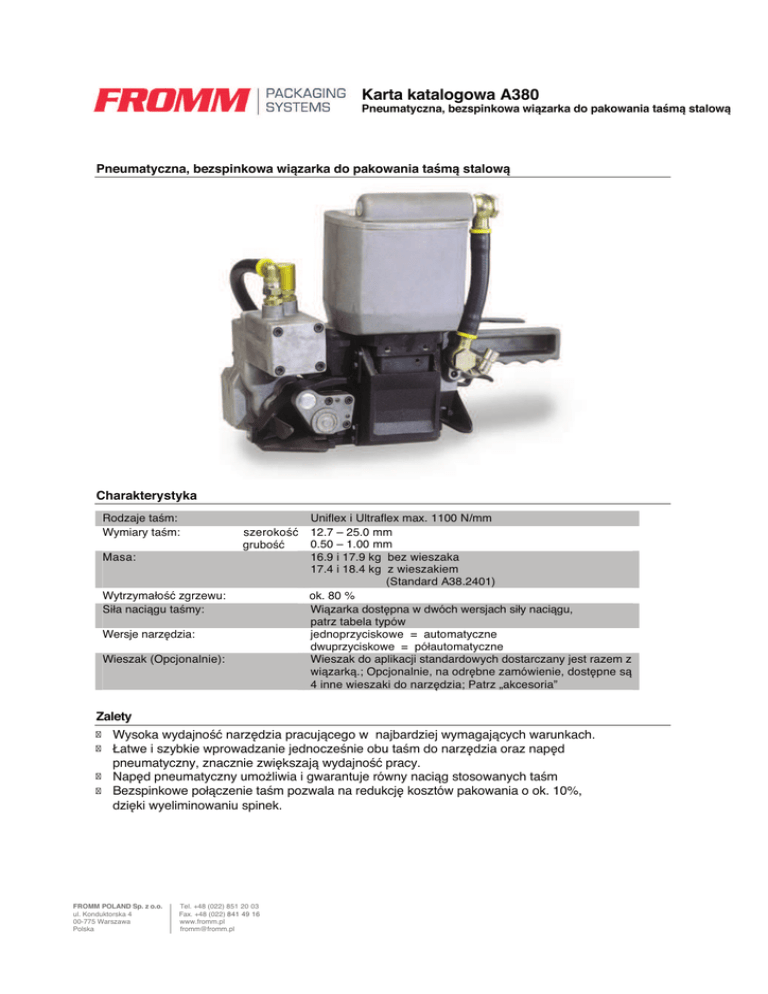 Karta katalogowa A380 Pneumatyczna, bezspinkowa wiązarka do pakowania taśmą stalową Pneumatyczna, bezspinkowa wiązarka do pakowania taśmą stalową Charakterystyka Rodzaje taśm: Wymiary taśm: szerokość grubość Masa: Wytrzymałość zgrzewu: Siła naciągu taśmy: Wersje narzędzia: Wieszak (Opcjonalnie): Uniflex i Ultraflex max. 1100 N/mm 12.7 – 25.0 mm 0.50 – 1.00 mm 16.9 i 17.9 kg bez wieszaka 17.4 i 18.4 kg z wieszakiem (Standard A38.2401) ok. 80 % Wiązarka dostępna w dwóch wersjach siły naciągu, patrz tabela typów jednoprzyciskowe = automatyczne dwuprzyciskowe = półautomatyczne Wieszak do aplikacji standardowych dostarczany jest razem z wiązarką.; Opcjonalnie, na odrębne zamówienie, dostępne są 4 inne wieszaki do narzędzia; Patrz „akcesoria” Zalety Wysoka wydajność narzędzia pracującego w najbardziej wymagających warunkach. Łatwe i szybkie wprowadzanie jednocześnie obu taśm do narzędzia oraz napęd pneumatyczny, znacznie zwiększają wydajność pracy. Napęd pneumatyczny umożliwia i gwarantuje równy naciąg stosowanych taśm Bezspinkowe połączenie taśm pozwala na redukcję kosztów pakowania o ok. 10%, dzięki wyeliminowaniu spinek. FROMM POLAND Sp. z o.o. ul. Konduktorska 4 00-775 Warszawa Polska Tel. +48 (022) 851 20 03 Fax. +48 (022) 841 49 16 www.fromm.pl [email protected] Karta katalogowa A380 Pneumatyczna, bezspinkowa wiązarka do pakowania taśmą stalową Tabela typów modeli A380 Półautomat Nr katalog. Model Szerokość taśmy Grubość taśmy mm mm Max. siła naciągu Prędkość naciągania N mm/s 13.6273 A380/12.7/0.50-0.63/4.5 12.7 0.50-0.63 4500 320 13.6274 A380/12.7/0.50-0.63/6.5 12.7 0.50-0.63 6500 220 13.6283 A380/13/0.50-0.63/4.5 13 0.50-0.63 4500 320 13.6284 A380/13/0.50-0.63/6.5 13 0.50-0.63 6500 220 13.6293 A380/16/0.50-0.63/4.5 16 0.50-0.63 4500 320 13.6294 A380/16/0.50-0.63/6.5 16 0.50-0.63 6500 220 13.6295 A380/16/0.50-0.63/7.5 16 0.50-0.63 7500 180 13.6314 A380/19/0.50-0.63/4.5 19 0.50-0.63 4500 320 13.6315 A380/19/0.50-0.63/6.5 19 0.50-0.63 6500 220 13.6516 A380/19/0.70-0.80/7.5 19 0.70-0.80 7500 180 13.6517 A380/19/0.70-0.80/9.5 19 0.70-0.80 9500 150 13.6518 A380/19/0.90-1.00/UNI/7.5 19 0.90-1.00 7500 180 13.6519 A380/19/0.80-1.00/UNI/9.5 19 0.90-1.00 9500 150 13.6330 A380/20/0.50-0.63/4.5 20 0.50-0.63 4500 320 13.6331 A380/20/0.50-0.63/6.5 20 0.50-0.63 6500 220 13.6532 A380/20/0.70-0.80/7.5 20 0.70-0.80 7500 180 13.6533 A380/20/0.70-0.80/9.5 20 0.70-0.80 9500 150 13.6534 A380/20/0.90-1.00/UNI/7.5 20 0.90-1.00 7500 180 13.6535 A380/20/0.80-1.00/UNI/9.5 20 0.90-1.00 9500 150 13.6613 A380/25/0.70-0.80/7.5 25 0.70-0.80 7500 180 13.6614 A380/25/0.70-0.80/9.5 25 0.70-0.80 9500 150 13.6615 A380/25/0.90-1.00/UNI/7.5 25 0.90-1.00 7500 180 13.6616 A380/25/0.80-1.00/UNI/9.5 25 0.90-1.00 9500 150 Uniflex = Taśma standardowa o wytrzymałości max . 850 N/mm2 2 Ultraflex = Taśma o podwyższonych parametrach wytrzymałościowych do max. 1100 N/mm Masa narzędzia: Wiązarka do taśm o grubości 0,5 do 0,63 mm: Wiązarka do taśm o grubości 0,7 do 0,80 mm: Wiązarka do taśm o grubości 0,9 do 1,00 mm: 17.4 kg 18.4 kg 18.4 kg Podane wartości obejmują masę narzędzia wraz ze standardowym wieszakiem FROMM POLAND Sp. z o.o. ul. Konduktorska 4 00-775 Warszawa Polska Tel. +48 (022) 851 20 03 Fax. +48 (022) 841 49 16 www.fromm.pl [email protected] Karta katalogowa A380 Pneumatyczna, bezspinkowa wiązarka do pakowania taśmą stalową Tabela typów modeli A380 Automat Nr katalog. Model Szerokość taśmy Grubość taśmy mm mm Max. siła naciągu Prędkość naciągania N mm/s 13.6275 A380/12.7/0.50-0.63/4.5/A 12.7 0.50-0.63 4500 320 13.6276 A380/12.7/0.50-0.63/6.5/A 12.7 0.50-0.63 6500 220 13.6285 A380/13/0.50-0.63/4.5/A 13 0.50-0.63 4500 320 13.6286 A380/13/0.50-0.63/6.5/A 13 0.50-0.63 6500 220 13.6296 A380/16/0.50-0.63/4.5/A 16 0.50-0.63 4500 320 13.6297 A380/16/0.50-0.63/6.5/A 16 0.50-0.63 6500 220 13.6298 A380/16/0.50-0.63/7.5/A 16 0.50-0.63 7500 180 13.6324 A380/19/0.50-0.63/4.5/A 19 0.50-0.63 4500 320 13.6325 A380/19/0.50-0.63/6.5/A 19 0.50-0.63 6500 220 13.6526 A380/19/0.70-0.80/7.5/A 19 0.70-0.80 7500 180 13.6527 A380/19/0.70-0.80/9.5/A 19 0.70-0.80 9500 150 13.6528 A380/19/0.90-1.00/UNI/7.5/A 19 0.90-1.00 7500 180 13.6529 A380/19/0.80-1.00/UNI/9.5/A 19 0.90-1.00 9500 150 13.6336 A380/20/0.50-0.63/4.5/A 20 0.50-0.63 4500 320 13.6337 A380/20/0.50-0.63/6.5/A 20 0.50-0.63 6500 220 13.6538 A380/20/0.70-0.80/7.5/A 20 0.70-0.80 7500 180 13.6539 A380/20/0.70-0.80/9.5/A 20 0.70-0.80 9500 150 13.6540 A380/20/0.90-1.00/UNI/7.5/A 20 0.90-1.00 7500 180 13.6541 A380/20/0.80-1.00/UNI/9.5/A 20 0.90-1.00 9500 150 13.6617 A380/25/0.70-0.80/7.5/A 25 0.70-0.80 7500 180 13.6618 A380/25/0.70-0.80/9.5/A 25 0.70-0.80 9500 150 13.6619 A380/25/0.90-1.00/UNI/7.5/A 25 0.90-1.00 7500 180 13.6620 A380/25/0.80-1.00/UNI/9.5/A 25 0.90-1.00 9500 150 Uniflex = Taśma standardowa o wytrzymałości max . 850 N/mm Ultraflex = Taśma o podwyższonych parametrach wytrzymałościowych do max. 1100 N/mm Masa narzędzia: Wiązarka do taśm o grubości 0,5 do 0,63 mm: Wiązarka do taśm o grubości 0,7 do 0,80 mm: Wiązarka do taśm o grubości 0,9 do 1,00 mm: 17.4 kg 18.4 kg 18.4 kg Podane wartości obejmują masę narzędzia wraz ze standardowym wieszakiem Akcesoria A38.1431 Wieszak standardowy w załączeniu A38.1428 Wieszak pionowy opcjonalnie A38.1408 Wieszak poziomy opcjonalnie A38.1434 Wieszak universalny (standardowy, pionowy i poziomy) opcjonalnie A38.1411 Wieszak uniwersalny (z możliwością szybkiego dostosowania do wiązań standardowych, pionowych i poziomych, idealny w przypadku częstych zmian aplikacji, zawierający przyłacze pneumatyczne). opcjonalnie FROMM POLAND Sp. z o.o. ul. Konduktorska 4 00-775 Warszawa Polska Tel. +48 (022) 851 20 03 Fax. +48 (022) 841 49 16 www.fromm.pl [email protected]