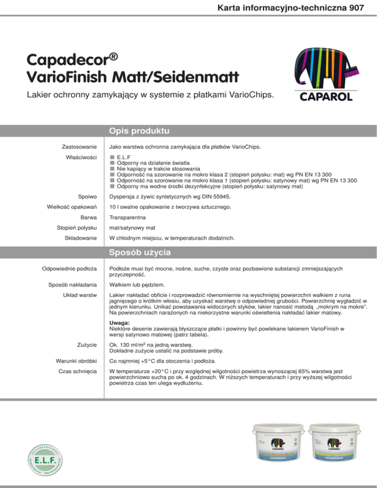 Karta informacyjno-techniczna 907 Capadecor® VarioFinish Matt/Seidenmatt Lakier ochronny zamykający w systemie z płatkami VarioChips. Opis produktu Zastosowanie Właściwości Jako warstwa ochronna zamykająca dla płatków VarioChips. ■ ■ ■ ■ ■ ■ E.L.F Odporny na działanie światla Nie kapiący w trakcie stosowania Odporność na szorowanie na mokro klasa 2 (stopień połysku: mat) wg PN EN 13 300 Odporność na szorowanie na mokro klasa 1 (stopień połysku: satynowy mat) wg PN EN 13 300 Odporny ma wodne środki dezynfekcyjne (stopień połysku: satynowy mat) Spoiwo Dyspersja z żywic syntetycznych wg DIN 55945. Wielkość opakowań 10 l owalne opakowanie z tworzywa sztucznego. Barwa Stopień połysku Składowanie Transparentna mat/satynowy mat W chłodnym miejscu, w temperaturach dodatnich. Sposób użycia Odpowiednie podłoża Sposób nakładania Układ warstw Podłoże musi być mocne, nośne, suche, czyste oraz pozbawione substancji zmniejszających przyczepność. Wałkiem lub pędzlem. Lakier nakładać obficie i rozprowadzić równomiernie na wyschniętej powierzchni wałkiem z runa jagnięcego o krótkim włosiu, aby uzyskać warstwę o odpowiedniej grubości. Powierzchnię wygładzić w jednym kierunku. Unikać powstawania widocznych styków, lakier nanosić metodą „mokrym na mokre”. Na powierzchniach narażonych na niekorzystne warunki oświetlenia nakładać lakier matowy. Uwaga: Niektóre desenie zawierają błyszczące płatki i powinny być powlekane lakierem VarioFinish w wersji satynowo matowej (patrz tabela). Zużycie Warunki obróbki Czas schnięcia Ok. 130 ml/m2 na jedną warstwę. Dokładne zużycie ustalić na podstawie próby. Co najmniej +5°C dla otoczenia i podłoża. W temperaturze +20°C i przy względnej wilgotności powietrza wynoszącej 65% warstwa jest powierzchniowo sucha po ok. 4 godzinach. W niższych temperaturach i przy wyższej wilgotności powietrza czas ten ulega wydłużeniu. Karta informacyjno-techniczna 907 Czyszczenie narzędzi Wodą natychmiast po użyciu. Wskazówki Uwaga (stan na dzień wydania) Utylizacja Dopuszczalna zawartośc LZO Kod produktu farby i lakiery Deklarowany skład produktu Doradztwo techniczne Infolinia Chronić przed dziećmi. Zanieczyszczone oczy przemyć natychmiast dużą ilością wody. Podczas natryskiwania nie wdychać oparów. Stosować wyłącznie w dobrze wentylowanych pomieszczeniach. Nie wprowadzać do kanalizacji. Unikać zrzutów do środowiska. Całkowicie opróżnione opakowania nadają się do utylizacji. Resztki materiału po wyschnięciu traktować jako odpady budowlane lub domowe. Utylizacja zgodnie z lokalnie obowiązującymi przepisami. (Kat.A/a): 30g/l (2010) Produkt ten zawiera maksymalnie 1g/l LZO. M-KH01 Żywica poliakrylanu, siliziumdioxid, woda, dodatki, konserwanty. W karcie niniejszej niemożliwe jest opisanie sposobów przygotowania wszystkich występujących w praktyce podłoży. W przypadkach, które nie zostały opisane powyżej, pomocnym może okazać się kontakt z naszym Działem technicznym. Chętnie udzielimy Państwu szczegółowych informacji związanych z konkretnym obiektem. Doradztwo techniczne: Tel. (22) 544 20 40 Fax (22) 544 20 41 [email protected] Karta informacyjno-techniczna 907, stan na lipiec 2012 Niniejsza karta informacyjna została sporządzona na bazie najnowszych osiągnięć techniki i naszych doświadczeń. Ze względu na różnorodność możliwych podłoży i warunków wykonawstwa każdorazowy Kupujący / Użytkownik jest zobowiązany sprawdzić na własną odpowiedzialność przydatność naszych produktów do zamierzonego celu przy każdorazowym uwzględnieniu warunków obiektowych wykonawstwa oraz wymogów i zasad sztuki i rzemiosła. Po ukazaniu się następnej wersji niniejsza karta traci swoją ważność. Caparol Polska Sp. z o. o. ul. · Baletowa 5C · PL – 02-867 Warszawa · tel. 022 544 20 40, faks 022 544 20 41 · internet: www.caparol.pl Caparol Farben Lacke Bautenschutz GmbH · Roßdörfer Straße 50 · D – 64372 Ober Ramstadt · tel. +49 6154 71-0, faks +49 6154 711391 · internet: www.caparol.de