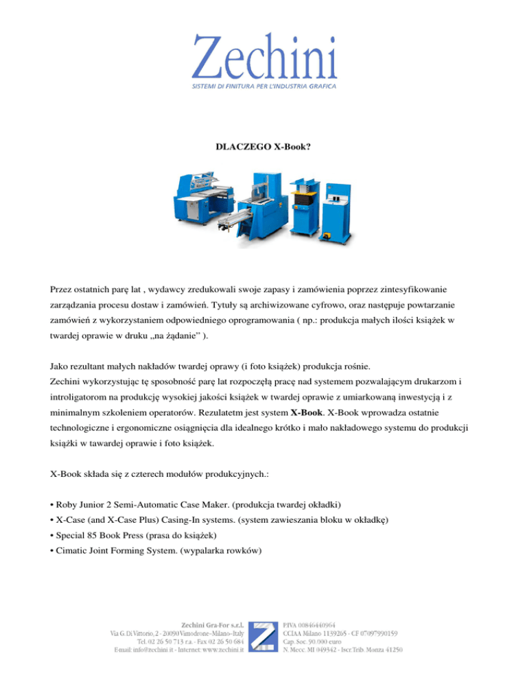 DLACZEGO X-Book? Przez ostatnich parę lat , wydawcy zredukowali swoje zapasy i zamówienia poprzez zintesyfikowanie zarządzania procesu dostaw i zamówień. Tytuły są archiwizowane cyfrowo, oraz następuje powtarzanie zamówień z wykorzystaniem odpowiedniego oprogramowania ( np.: produkcja małych ilości książek w twardej oprawie w druku „na żądanie” ). Jako rezultant małych nakładów twardej oprawy (i foto książek) produkcja rośnie. Zechini wykorzystując tę sposobność parę lat rozpoczęłą pracę nad systemem pozwalającym drukarzom i introligatorom na produkcję wysokiej jakości książek w twardej oprawie z umiarkowaną inwestycją i z minimalnym szkoleniem operatorów. Rezulatetm jest system X-Book. X-Book wprowadza ostatnie technologiczne i ergonomiczne osiągnięcia dla idealnego krótko i mało nakładowego systemu do produkcji książki w tawardej oprawie i foto książek. X-Book składa się z czterech modułów produkcyjnych.: • Roby Junior 2 Semi-Automatic Case Maker. (produkcja twardej okładki) • X-Case (and X-Case Plus) Casing-In systems. (system zawieszania bloku w okładkę) • Special 85 Book Press (prasa do książek) • Cimatic Joint Forming System. (wypalarka rowków) Poniżej opis systemu X-Book: Roby Junior 2 i Mephisto: mają wszystko to co jest potrzebne do sprawnej (i szybkiej) produkcji okładek dla twardej produkcji i foto książek. Zechini zbadało uważnie rynek i wprowadziło to wszytko co jest potrzebne w kompaktowych maszynach. Roby Junior 2 pół-automatyczny podajnik tektury pozwala na szybką produkcję okładki . Operator kładzie oklejkę z klejem na napowietrzanym stole , naciska przycisk i tektura jest precycyjne umieszczana na oklejce. Sekcja klejenia może używać zarówno kleju na gorąco (zwierzęcego) lub na zimno (PVA). Zbiornik na klej może być szybko przystosowany do jednego lub drugiego rodzaju kleju a elementy podgrzewające zapewniają precyzyjne sterowanie temperaturą dla kleju na gorąco. Oklejka jest podawana i odwracana tak aby operator położył ją na napowietrzanym stole klejem do góry. Zintegrowany obcinacz naroży łatwo tnie kąty 45° na narożach oklejki. Zamykanie końcówek okleiny (i naroży) na tekturze i okładka potrzebują dwóch ruchów operatora. Automatyczne zawijanie robi resztę i nie potrzebuje regulacji podczas pracy z różnymi grubościami tektury. Dla bardzo krótkich nakładów , Roby Junior 2 ma “ręczny” szablon, który pozwala na bardzo szybką regulację do odpowiedniego formatu tektury. Roby Junior 2 pozwala dodatkowo na: • Roby Junior 2 może produkować trzy-, cztero-,pięcio- częściowe okładki, jak również pojedyncze plansze do gier i display’e produktów. • Podajnik tektury może być ładowany podczas pracy maszyny. • Dla małych nakładów potrzebna jest zmiana formatu, Roby Junior 2 ma szablon do szybkiego pozycjonowania tektury. • Maszyna potrzebuje mało powierzchni i konsumpcji prądu. Jakość: Zechini ma surowy system kontroli budowy maszyn. Ramy są solidne z mocno kalibrowanej stali. Używanie masywnych stalowych ram pozwala Zechini na budowę maszyn wolnych od wad i problemów na wiele lat. X-Case: X-Case, i X-Case Plus to dwa moduły zawieszające , zaprojektowane dla łatwej i wydajnej obsługi. X-Case jest jedno skrzydłową maszyną ze spaecjalnie zaprojektowanymi aplikatorami i zbiornikami kleju. X-Case i X-Case Plus. Mają podwójne zbiorniki kleju z nakładaczami oraz extra nakładacz kleju na grzbiecie książki. Obydwa systemy używają kleju zimnego PVA co jest standardem dla zawieszania. Zbiorniki są “samo czyszczące.”, poprzez dodanie wody na zakończenie dziennej produkcji. X-Case Plus nadaje bloki książki automatycznie. Operator łatwo umieszcza bloki w stacji nadawania X-Case Plus nadaje klej na blok książki i później prasuje okładkę z blokiem. Przy pmocy dwóch pneumatycznych rolek. X-Case Plus może być także połączony z Zechini VIP Forming System dla skonfigurowania w pełni automatycznego zawieszania z prasowaniem i wypalaniem rowków. Zechini Special 85 Book Press prasuje książki z naciskiem ponad tonę. Specjalna sprężyna mechanizmu powoduje ciągły nacisk aż woda odparuje z kleju. Książki mogą potrzebować nacisku od pięciu do dwudziestu minut , w zależności od rodzaju wyklejki. Róznorodne stosy książek mogą być w ciągłym cyklu dokładane z i bez nacisku dla zmaksymalizowania produkcji. Cimatic: nasz moduł do wypalania rowków szybko je formuje z najwyższą jakością. Używając podgrzewanych mieczy i regulując nacisk , maszyna może być szybko narządzona do różnorodnych rodzajów oklejki. Zechini: Długa Historia w Twardej Oprawie: Zechini produkuje maszyny do twardej oprawy od 1952. Rodzinny biznes Zechini sprzedaje i wspomaga swoje sysytemy na całym świecie , stale rozwija i wprowadza innowacje do swojej produkcji reagując na zmieniający się rynek. Fabryka Zechini jest zlokalizowana w Vimodrome, we Włoszech, w Mediolanie. To jest miejsce, gdzie są maszyny projektowane, produkowane i gdzie jest dział badawczo-rozwojowy. Innowacyjność – stały proces w Zechini. Zechini ciągle szuka nowych rozwiązań dla mało nakładowej produkcji w twardej oprawie i foto książek. Ciągle wprowadzamy nowe systemy na rynek dla mało i średnionakładowej produkcji twardej oprawy w procesie wykończeniowym. Nowość! Capri: CAPRI jest automatyczną maszyną , łatwą w obsłudze do kapitałkowania i zakładania tasiemki. CAPRI łatwo aplikuje: • Kapitałkę - przód. • Kapitałkę przód I tył • Kapitałkę przód I tył plus tasiemkę. Jeżeli Państwo szukacie rozwiązań dla zwiększenia wydajności przy średnio i mało nakładowej produkcji lub chcecie produkować u siebie twardą oprawę , to właśnie rozwiązania Zechini pozwalają na zwiększenie oferty produkcji książek czy foto książek dla wielu różnorodnych introligatornii. Nawet lepiej, system