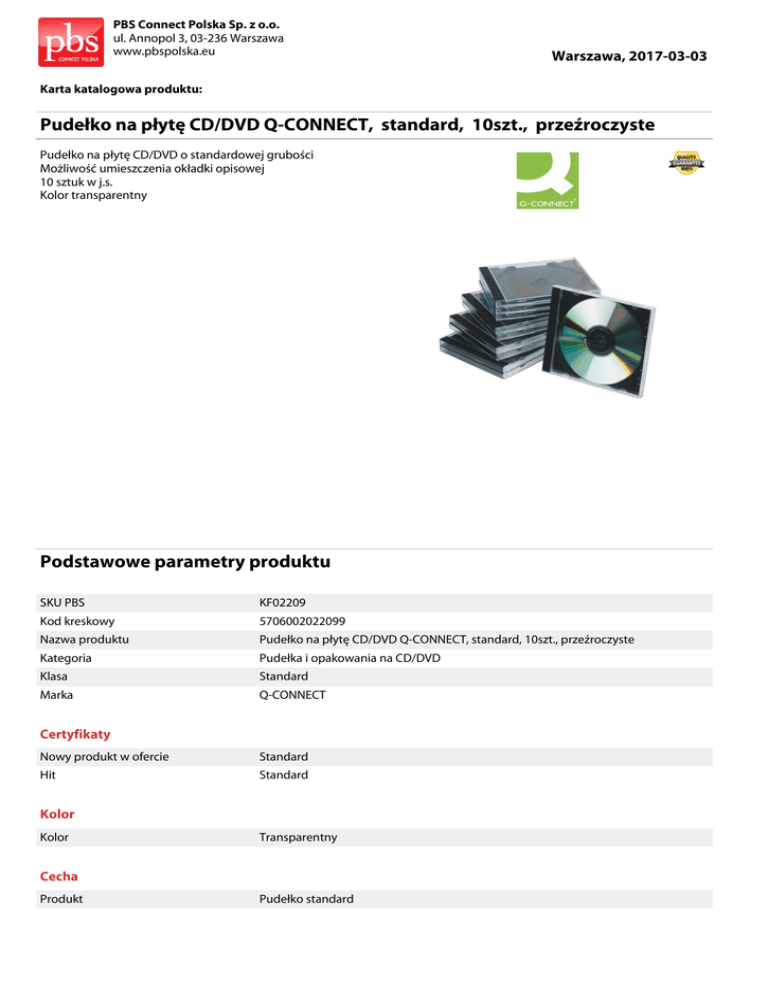 PBS Connect Polska Sp. z o.o. ul. Annopol 3, 03-236 Warszawa www.pbspolska.eu Warszawa, 2017-03-03 Karta katalogowa produktu: Pudełko na płytę CD/DVD Q-CONNECT, standard, 10szt., przeźroczyste Pudełko na płytę CD/DVD o standardowej grubości Możliwość umieszczenia okładki opisowej 10 sztuk w j.s. Kolor transparentny Podstawowe parametry produktu SKU PBS KF02209 Kod kreskowy 5706002022099 Nazwa produktu Pudełko na płytę CD/DVD Q-CONNECT, standard, 10szt., przeźroczyste Kategoria Pudełka i opakowania na CD/DVD Klasa Standard Marka Q-CONNECT Certyfikaty Nowy produkt w ofercie Standard Hit Standard Kolor Kolor Transparentny Cecha Produkt Pudełko standard PBS Connect Polska Sp. z o.o. ul. Annopol 3, 03-236 Warszawa www.pbspolska.eu Warszawa, 2017-03-03 Karta katalogowa produktu cd. Pudełko na płytę CD/DVD Q-CONNECT, standard, 10szt., przeźroczyste Podstawowe parametry produktu Typ Standard Materiał Polistyren W ofercie od 2013-01 Wspólny słownik zamówień CPV 30199500-5 Segregatory, pudełka na listy, pudełka do przechowywania i podobne wyroby Jednostki logistyczne Opakowanie 1 20 szt Opakowanie 2 600 szt