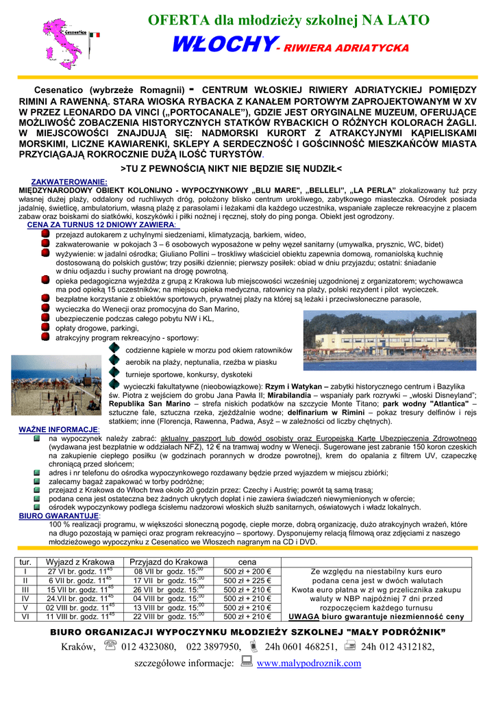 OFERTA dla młodzieży szkolnej NA LATO WŁOCHY- RIWIERA ADRIATYCKA WIEK UCZESTNIKÓW 9 – 18 LAT - Cesenatico (wybrzeże Romagnii) CENTRUM WŁOSKIEJ RIWIERY ADRIATYCKIEJ POMIĘDZY RIMINI A RAWENNĄ. STARA WIOSKA RYBACKA Z KANAŁEM PORTOWYM ZAPROJEKTOWANYM W XV W PRZEZ LEONARDO DA VINCI („PORTOCANALE”), GDZIE JEST ORYGINALNE MUZEUM, OFERUJĄCE MOŻLIWOŚĆ ZOBACZENIA HISTORYCZNYCH STATKÓW RYBACKICH O RÓŻNYCH KOLORACH ŻAGLI. W MIEJSCOWOŚCI ZNAJDUJĄ SIĘ: NADMORSKI KURORT Z ATRAKCYJNYMI KĄPIELISKAMI MORSKIMI, LICZNE KAWIARENKI, SKLEPY A SERDECZNOŚĆ I GOŚCINNOŚĆ MIESZKAŃCÓW MIASTA PRZYCIĄGAJĄ ROKROCZNIE DUŻĄ ILOŚĆ TURYSTÓW. >TU Z PEWNOŚCIĄ NIKT NIE BĘDZIE SIĘ NUDZIŁ< ZAKWATEROWANIE: MIĘDZYNARODOWY OBIEKT KOLONIJNO - WYPOCZYNKOWY „BLU MARE", „BELLELI”, „LA PERLA” zlokalizowany tuż przy własnej dużej plaży, oddalony od ruchliwych dróg, położony blisko centrum urokliwego, zabytkowego miasteczka. Ośrodek posiada jadalnię, świetlicę, ambulatorium, własną plażę z parasolami i leżakami dla każdego uczestnika, wspaniałe zaplecze rekreacyjne z placem zabaw oraz boiskami do siatkówki, koszykówki i piłki nożnej i ręcznej, stoły do ping ponga. Obiekt jest ogrodzony. CENA ZA TURNUS 12 DNIOWY ZAWIERA: przejazd autokarem z uchylnymi siedzeniami, klimatyzacją, barkiem, wideo, zakwaterowanie w pokojach 3 – 6 osobowych wyposażone w pełny węzeł sanitarny (umywalka, prysznic, WC, bidet) wyżywienie: w jadalni ośrodka; Giuliano Pollini – troskliwy właściciel obiektu zapewnia domową, romaniolską kuchnię dostosowaną do polskich gustów; trzy posiłki dziennie; pierwszy posiłek: obiad w dniu przyjazdu; ostatni: śniadanie w dniu odjazdu i suchy prowiant na drogę powrotną. opieka pedagogiczna wyjeżdża z grupą z Krakowa lub miejscowości wcześniej uzgodnionej z organizatorem; wychowawca ma pod opieką 15 uczestników; na miejscu opieka medyczna, ratownicy na plaży, polski rezydent i pilot wycieczek. bezpłatne korzystanie z obiektów sportowych, prywatnej plaży na której są leżaki i przeciwsłoneczne parasole, wycieczka do Wenecji oraz promocyjna do San Marino, ubezpieczenie podczas całego pobytu NW i KL, opłaty drogowe, parkingi, atrakcyjny program rekreacyjno - sportowy: codzienne kąpiele w morzu pod okiem ratowników aerobik na plaży, neptunalia, rzeźba w piasku turnieje sportowe, konkursy, dyskoteki wycieczki fakultatywne (nieobowiązkowe): Rzym i Watykan – zabytki historycznego centrum i Bazylika św. Piotra z wejściem do grobu Jana Pawła II; Mirabilandia – wspaniały park rozrywki – „włoski Disneyland”; Republika San Marino – strefa niskich podatków na szczycie Monte Titano; park wodny "Atlantica" – sztuczne fale, sztuczna rzeka, zjeżdżalnie wodne; delfinarium w Rimini – pokaz tresury delfinów i rejs statkiem; inne (Florencja, Rawenna, Padwa, Asyż – w zależności od liczby chętnych). WAŻNE INFORMACJE: na wypoczynek należy zabrać: aktualny paszport lub dowód osobisty oraz Europejską Kartę Ubezpieczenia Zdrowotnego (wydawana jest bezpłatnie w oddziałach NFZ), 12 € na tramwaj wodny w Wenecji. Sugerowane jest zabranie 150 koron czeskich na zakupienie ciepłego posiłku (w godzinach porannych w drodze powrotnej), krem do opalania z filtrem UV, czapeczkę chroniącą przed słońcem; adres i nr telefonu do ośrodka wypoczynkowego rozdawany będzie przed wyjazdem w miejscu zbiórki; zalecamy bagaż zapakować w torby podróżne; przejazd z Krakowa do Włoch trwa około 20 godzin przez: Czechy i Austrię; powrót tą samą trasą; podana cena jest ostateczna bez żadnych ukrytych dopłat i nie zawiera świadczeń niewymienionych w ofercie; ośrodek wypoczynkowy podlega ścisłemu nadzorowi włoskich służb sanitarnych, oświatowych i władz lokalnych. BIURO GWARANTUJE: 100 % realizacji programu, w większości słoneczną pogodę, ciepłe morze, dobrą organizację, dużo atrakcyjnych wrażeń, które na długo pozostają w pamięci oraz program rekreacyjno – sportowy. Dysponujemy relacją filmową oraz zdjęciami z naszego młodzieżowego wypoczynku z Cesenatico we Włoszech nagranym na CD i DVD. tur. I II III IV V VI Wyjazd z Krakowa 27 VI br. godz. 1145 6 VII br. godz. 1145 15 VII br. godz. 1145 24.VII br. godz. 1145 02 VIII br. godz. 1145 11 VIII br. godz. 1145 Przyjazd do Krakowa 08 VII br 17 VII br 26 VII br 04 VIII br 13 VIII br 22 VIII br godz. 15:00 godz. 15:00 godz. 15:00 godz. 15:00 godz. 15:00 godz. 15:00 cena 500 zł + 200 € 500 zł + 225 € 500 zł + 210 € 500 zł + 210 € 500 zł + 210 € 500 zł + 210 € Ze względu na niestabilny kurs euro podana cena jest w dwóch walutach Kwota euro płatna w zł wg przelicznika zakupu waluty w NBP najpóźniej 7 dni przed rozpoczęciem każdego turnusu UWAGA biuro gwarantuje niezmienność ceny BIURO ORGANIZACJI WYPOCZYNKU MŁODZIEŻY SZKOLNEJ "MAŁY PODRÓŻNIK” Kraków, ℡ 012 4323080, ª 24h 0601 468251, ¬ 24h 012 4312182, www.malypodroznik.com 022 3897950, szczegółowe informacje: