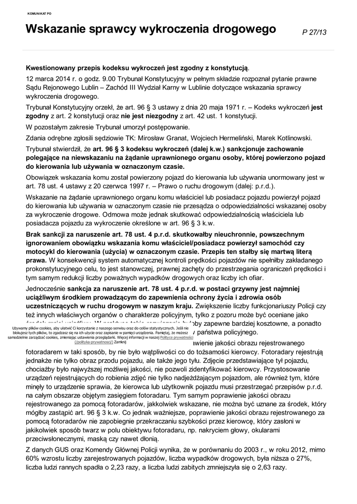 KOMUNIKAT PO Wskazanie sprawcy wykroczenia drogowego P 27/13 Kwestionowany przepis kodeksu wykroczeń jest zgodny z konstytucją. 12 marca 2014 r. o godz. 9.00 Trybunał Konstytucyjny w pełnym składzie rozpoznał pytanie prawne Sądu Rejonowego Lublin – Zachód III Wydział Karny w Lublinie dotyczące wskazania sprawcy wykroczenia drogowego. Trybunał Konstytucyjny orzekł, że art. 96 § 3 ustawy z dnia 20 maja 1971 r. – Kodeks wykroczeń jest zgodny z art. 2 konstytucji oraz nie jest niezgodny z art. 42 ust. 1 konstytucji. W pozostałym zakresie Trybunał umorzył postępowanie. Zdania odrębne zgłosili sędziowie TK: Mirosław Granat, Wojciech Hermeliński, Marek Kotlinowski. Trybunał stwierdził, że art. 96 § 3 kodeksu wykroczeń (dalej k.w.) sankcjonuje zachowanie polegające na niewskazaniu na żądanie uprawnionego organu osoby, której powierzono pojazd do kierowania lub używania w oznaczonym czasie. Obowiązek wskazania komu został powierzony pojazd do kierowania lub używania unormowany jest w art. 78 ust. 4 ustawy z 20 czerwca 1997 r. – Prawo o ruchu drogowym (dalej: p.r.d.). Wskazanie na żądanie uprawnionego organu komu właściciel lub posiadacz pojazdu powierzył pojazd do kierowania lub używania w oznaczonym czasie nie przesądza o odpowiedzialności wskazanej osoby za wykroczenie drogowe. Odmowa może jednak skutkować odpowiedzialnością właściciela lub posiadacza pojazdu za wykroczenie określone w art. 96 § 3 k.w. Brak sankcji za naruszenie art. 78 ust. 4 p.r.d. skutkowałby nieuchronnie, powszechnym ignorowaniem obowiązku wskazania komu właściciel/posiadacz powierzył samochód czy motocykl do kierowania (użycia) w oznaczonym czasie. Przepis ten stałby się martwą literą prawa. W konsekwencji system automatycznej kontroli prędkości pojazdów nie spełniłby zakładanego prokonstytucyjnego celu, to jest stanowczej, prawnej zachęty do przestrzegania ograniczeń prędkości i tym samym redukcji liczby poważnych wypadków drogowych oraz liczby ich ofiar. Jednocześnie sankcja za naruszenie art. 78 ust. 4 p.r.d. w postaci grzywny jest najmniej uciążliwym środkiem prowadzącym do zapewnienia ochrony życia i zdrowia osób uczestniczących w ruchu drogowym w naszym kraju. Zwiększenie liczby funkcjonariuszy Policji czy też innych właściwych organów o charakterze policyjnym, tylko z pozoru może być oceniane jako środek mniej uciążliwy. W praktyce takie rozwiązanie byłoby zapewne bardziej kosztowne, a ponadto Używamy plików cookies, aby ułatwić Ci korzystanie z naszego serwisu oraz do celów statystycznych. Jeśli nie blokujeszstwarzałoby tych plików, to zgadzasz się na ich użycie oraz zapisanie w pamięciw urządzenia. Pamiętaj, że możesz poczucie wprowadzania Polsce elementów państwa policyjnego. samodzielnie zarządzać cookies, zmieniając ustawienia przeglądarki. Więcej informacji w naszej Polityce prywatności (/polityka-prywatnosci/) Zamknij Pozornie mniej uciążliwym środkiem byłoby również poprawienie jakości obrazu rejestrowanego fotoradarem w taki sposób, by nie było wątpliwości co do tożsamości kierowcy. Fotoradary rejestrują jednakże nie tylko obraz przodu pojazdu, ale także jego tyłu. Zdjęcie przedstawiające tył pojazdu, chociażby było najwyższej możliwej jakości, nie pozwoli zidentyfikować kierowcy. Przystosowanie urządzeń rejestrujących do robienia zdjęć nie tylko nadjeżdżającym pojazdom, ale również tym, które minęły to urządzenie sprawia, że kierowca lub użytkownik pojazdu musi przestrzegać przepisów p.r.d. na całym obszarze objętym zasięgiem fotoradaru. Tym samym poprawienie jakości obrazu rejestrowanego za pomocą fotoradarów, jakkolwiek wskazane, nie można być uznane za środek, który mógłby zastąpić art. 96 § 3 k.w. Co jednak ważniejsze, poprawienie jakości obrazu rejestrowanego za pomocą fotoradarów nie zapobiegnie przekraczaniu szybkości przez kierowcę, który zasłoni w jakikolwiek sposób twarz w polu obiektywu fotoradaru, np. nakryciem głowy, okularami przeciwsłonecznymi, maską czy nawet dłonią. Z danych GUS oraz Komendy Głównej Policji wynika, że w porównaniu do 2003 r., w roku 2012, mimo 60% wzrostu liczby zarejestrowanych pojazdów, liczba wypadków drogowych, była niższa o 27%, liczba ludzi rannych spadła o 2,23 razy, a liczba ludzi zabitych zmniejszyła się o 2,63 razy. Bez wątpienia do poprawy bezpieczeństwa na drogach publicznych w naszym państwie przyczynił się rozwój sieci dróg ekspresowych, autostrad w ostatnich kilku latach oraz lepsze, bardziej bezpieczne samochody. Nie bez znaczenia było jednak również zainstalowanie sieci fotoradarów przy drogach oraz wprowadzenie do k.w. art. 96 § 3. Taka zmiana jest realizacją konstytucyjnego obowiązku organów państwa zapewnienia każdemu prawnej ochrony życia i ochrony zdrowia (art. 38 oraz art. 68 ust. 1 konstytucji). Art. 96 § 3 k.w. nie jest nadmiernie restrykcyjny. Wykroczenie określone w art. 96 § 3 k.w. zagrożone jest wyłącznie karą grzywny, która może wynosić – zgodnie z art. 24 § 1 k.w. – od 20 do 5000 zł. Ustawodawca spośród wielu możliwych sposobów sankcjonowania obowiązku wyznaczonego w art. 78 ust. 4 p.r.d. wybrał zatem taki, który jest umiarkowany i proporcjonalny do celu. Po pierwsze, ustawodawca wprowadził odpowiedzialność wykroczeniową, nie zaś karną. Po drugie, w ramach wprowadzonej odpowiedzialności wykroczeniowej, sięgnął wyłącznie do kary grzywny, rezygnując przy tym z surowszych kar za wykroczenia, jakimi są areszt i ograniczenie wolności. Odnosząc się zatem do zarzutu niezgodności art. 96 § 3 k.w. z zasadą zaufania obywatela do państwa i stanowionego przez nie prawa (art. 2 konstytucji), Trybunał stwierdził, że nie ma podstaw prawnych adresowanie do właściciela lub posiadacza pojazdu przez uprawniony organ alternatywnego żądania wskazania, komu został powierzony pojazd do kiero