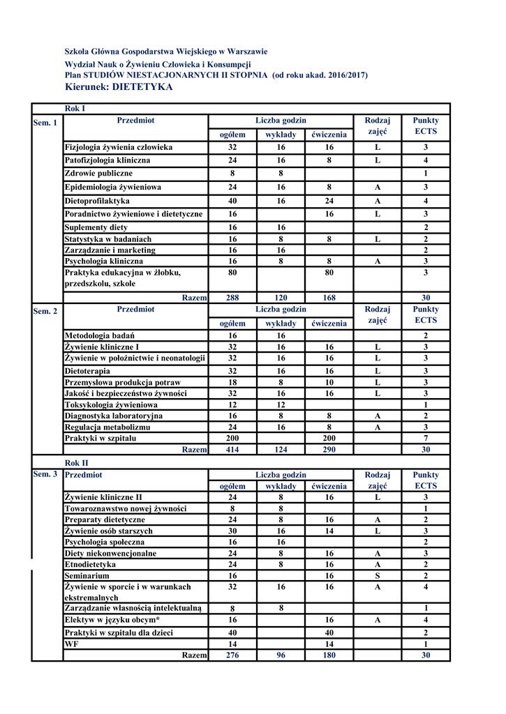 Szkoła Główna Gospodarstwa Wiejskiego w Warszawie Wydział Nauk o Żywieniu Człowieka i Konsumpcji Plan STUDIÓW NIESTACJONARNYCH II STOPNIA (od roku akad. 2016/2017) Kierunek: DIETETYKA Rok I Przedmiot Sem. 1 Liczba godzin Rodzaj zajęć Punkty ECTS L 3 L 4 ogółem 32 wykłady 16 ćwiczenia 16 Patofizjologia kliniczna 24 16 8 Zdrowie publiczne 8 8 Epidemiologia żywieniowa 24 16 8 A 3 Dietoprofilaktyka 40 16 24 A 4 Poradnictwo żywieniowe i dietetyczne 16 16 L 3 Suplementy diety Statystyka w badaniach Zarządzanie i marketing Psychologia kliniczna Praktyka edukacyjna w żłobku, przedszkolu, szkole 16 16 16 16 80 16 8 16 8 288 120 Liczba godzin 168 Fizjologia żywienia człowieka Razem Przedmiot Sem. 2 1 8 L 8 80 A Rodzaj zajęć 30 Punkty ECTS 2 3 3 ogółem 16 32 32 wykłady 16 16 16 ćwiczenia Metodologia badań Żywienie kliniczne I Żywienie w położnictwie i neonatologii 16 16 L L Dietoterapia Przemysłowa produkcja potraw Jakość i bezpieczeństwo żywności Toksykologia żywieniowa Diagnostyka laboratoryjna Regulacja metabolizmu Praktyki w szpitalu Razem 32 18 32 12 16 24 200 414 16 8 16 12 8 16 16 10 16 L L L 8 8 200 290 A A Rok II Sem. 3 Przedmiot Żywienie kliniczne II Towaroznawstwo nowej żywności Preparaty dietetyczne Żywienie osób starszych Psychologia społeczna Diety niekonwencjonalne Etnodietetyka Seminarium Żywienie w sporcie i w warunkach ekstremalnych Zarządzanie własnością intelektualną Elektyw w języku obcym* Praktyki w szpitalu dla dzieci WF Razem ogółem 24 8 24 30 16 24 24 16 32 8 16 40 14 276 124 Liczba godzin wykłady ćwiczenia 8 16 8 8 16 16 14 16 8 16 8 16 16 16 16 Rodzaj zajęć L 96 40 14 180 3 3 3 1 2 3 7 30 A A S A Punkty ECTS 3 1 2 3 2 3 2 2 4 A 1 4 A L 8 16 2 2 2 3 3 2 1 30 Sem. 4 Przedmiot ogółem 24 Zasady organizacji żywienia w szpitalach i sanatoriach Metabolizm białka i energii Przedmioty do wyboru ** 24 48 Seminarium Pracownia dyplomowa Liczba godzin wykłady ćwiczenia 8 16 8 48 16 Razem Ogółem 112 1090 64 404 Rodzaj zajęć A Punkty ECTS 3 16 L 3 6 16 S 2 20 34 124 48 686 * Elektywy w języku angielskim W przypadku braku znajomości języka angielskiego, student odbywa zajęcia z innego języka obcego (realizowanego na studiach I stopnia) Lp. 1 2 3 5 6 7 8 Tytuł elektywu Food chain development Food and nutrition policy Nutrition and health Food product development Ecological aspects of food and nutrition Consumer behaviour Organic food marketing ** Przedmioty do wyboru - semestr 4 Student na 2 semestrze wybiera 3 przedmioty z puli przemiotów ogólnowydziałowych, które realizuje w semestrze 3 (w wymiarze 16 godz. wykładów - 2 ECTS) Uruchomienie danego przedmiotu, zgodnie z decyzją Dziekana, nastąpi w momencie utworzenia grupy spełniającej określoną liczebność.