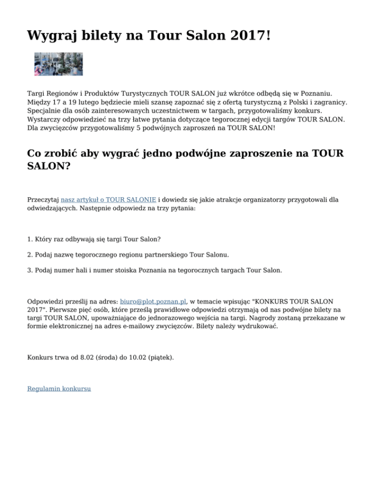 Wygraj bilety na Tour Salon 2017! Targi Regionów i Produktów Turystycznych TOUR SALON już wkrótce odbędą się w Poznaniu. Między 17 a 19 lutego będziecie mieli szansę zapoznać się z ofertą turystyczną z Polski i zagranicy. Specjalnie dla osób zainteresowanych uczestnictwem w targach, przygotowaliśmy konkurs. Wystarczy odpowiedzieć na trzy łatwe pytania dotyczące tegorocznej edycji targów TOUR SALON. Dla zwycięzców przygotowaliśmy 5 podwójnych zaproszeń na TOUR SALON! Co zrobić aby wygrać jedno podwójne zaproszenie na TOUR SALON? Przeczytaj nasz artykuł o TOUR SALONIE i dowiedz się jakie atrakcje organizatorzy przygotowali dla odwiedzających. Następnie odpowiedz na trzy pytania: 1. Który raz odbywają się targi Tour Salon? 2. Podaj nazwę tegorocznego regionu partnerskiego Tour Salonu. 3. Podaj numer hali i numer stoiska Poznania na tegorocznych targach Tour Salon. Odpowiedzi prześlij na adres: [email protected], w temacie wpisując "KONKURS TOUR SALON 2017". Pierwsze pięć osób, które prześlą prawidłowe odpowiedzi otrzymają od nas podwójne bilety na targi TOUR SALON, upoważniające do jednorazowego wejścia na targi. Nagrody zostaną przekazane w formie elektronicznej na adres e-mailowy zwycięzców. Bilety należy wydrukować. Konkurs trwa od 8.02 (środa) do 10.02 (piątek). Regulamin konkursu fot. Tour Salon