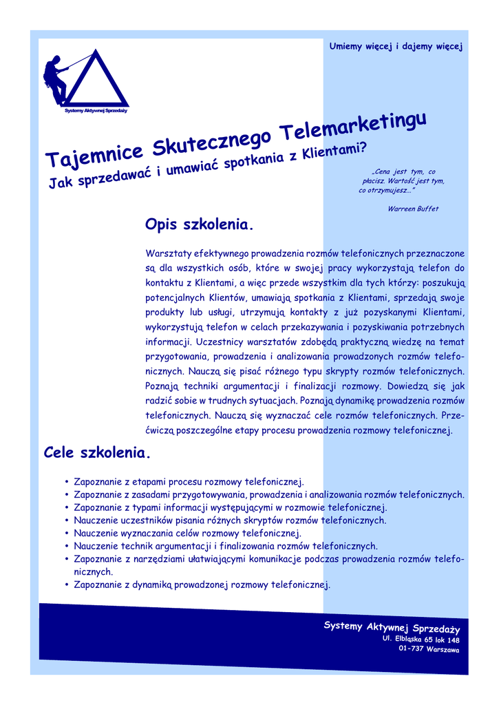 Umiemy wiêcej i dajemy wiêcej ngu i t e k r a m e Tel o g e n z c e Skut lientami? Systemy Aktywnej Sprzeda¿y e Tajemnic æ i umawiaæ spotkania z K dawa Jak sprze Opis szkolenia. Warsztaty efektywnego prowadzenia rozmów telefonicznych przeznaczone s¹ dla wszystkich osób, które w swojej pracy wykorzystaj¹ telefon do kontaktu z Klientami, a wiêc przede wszystkim dla tych którzy: poszukuj¹ potencjalnych Klientów, umawiaj¹ spotkania z Klientami, sprzedaj¹ swoje produkty lub us³ugi, utrzymuj¹ kontakty z ju¿ pozyskanymi Klientami, wykorzystuj¹ telefon w celach przekazywania i pozyskiwania potrzebnych informacji. Uczestnicy warsztatów zdobêd¹ praktyczn¹ wiedzê na temat przygotowania, prowadzenia i analizowania prowadzonych rozmów telefonicznych. Naucz¹ siê pisaæ ró¿nego typu skrypty rozmów telefonicznych. Poznaj¹ techniki argumentacji i finalizacji rozmowy. Dowiedz¹ siê jak radziæ sobie w trudnych sytuacjach. Poznaj¹ dynamikê prowadzenia rozmów telefonicznych. Naucz¹ siê wyznaczaæ cele rozmów telefonicznych. Przeæwicz¹ poszczególne etapy procesu prowadzenia rozmowy telefonicznej. Cele szkolenia. Zapoznanie z etapami procesu rozmowy telefonicznej. Zapoznanie z zasadami przygotowywania, prowadzenia i analizowania rozmów telefonicznych. Zapoznanie z typami informacji wystêpuj¹cymi w rozmowie telefonicznej. Nauczenie uczestników pisania ró¿nych skryptów rozmów telefonicznych. Nauczenie wyznaczania celów rozmowy telefonicznej. Nauczenie technik argumentacji i finalizowania rozmów telefonicznych. Zapoznanie z narzêdziami u³atwiaj¹cymi komunikacje podczas prowadzenia rozmów telefonicznych. Ÿ Zapoznanie z dynamik¹ prowadzonej rozmowy telefonicznej. Ÿ Ÿ Ÿ Ÿ Ÿ Ÿ Ÿ Systemy Aktywnej Sprzeda¿ y Ul. Elbl¹ska 65 lok 148 01-737 Warszawa Umiemy wiêcej i dajemy wiêcej Systemy Aktywnej Sprzeda¿y Korzyci: po szkoleniu uczestnik bêdzie potrafi³: Ÿ Ÿ Ÿ Ÿ Ÿ Ÿ Ÿ Ÿ Ÿ Ÿ Ÿ Ÿ budowaæ dobre relacje z rozmówc¹ w trakcie prowadzenia rozmowy telefonicznej, pisaæ ró¿nego typy skrypty rozmów telefonicznych, wyznaczaæ cele rozmów telefonicznych, wykorzystywaæ dynamikê rozmowy w celu osi¹gniêcia oczekiwanego rezultatu, umawiaæ spotkania z Klientami I sprzedawaæ swoje produkty/us³ugi, przygotowaæ siê w³aciwie do prowadzenia rozmów telefonicznych, analizowaæ prowadzone rozmowy telefoniczne, prowadziæ rozmowy telefoniczne, przekazaæ i pozyskaæ potrzebne informacje, stosowaæ techniki argumentowania i finalizowania rozmowy, stosowaæ skuteczne odpowiedzi na w¹tpliwoci Klienta, skutecznie reagowaæ w trudnych sytuacjach, i bêdzie zna³: Ÿ Ÿ Ÿ Ÿ Ÿ Ÿ Ÿ Ÿ Ÿ etapy procesu rozmowy telefonicznej, zasady przygotowywania, prowadzenia i analizowania rozmów telefonicznych, dynamikê prowadzenia rozmowy telefonicznej, typy informacji wystêpuj¹ce w rozmowie telefonicznej, zasady pisania ró¿nych typu skryptów do prowadzenia rozmów telefonicznych, narzêdzia u³atwiaj¹ce komunikacje podczas prowadzenia rozmów telefonicznych, metodê wyznaczania celów rozmowy telefonicznej, techniki argumentacji i finalizowania rozmów telefonicznych, modele radzenia sobie z w¹tpliwociami i zastrze¿eniami Klienta. Systemy Aktywnej Sprzeda¿ y Ul. Elbl¹ska 65 lok 148 01-737 Warszawa Umiemy wiêcej i dajemy wiêcej Program szkolenia: Systemy Aktywnej Sprzeda¿y 1. Podstawowe informacje na temat telemarketingu i prowadzenia rozmów telefonicznych. Ÿ Ÿ Ÿ Ÿ Ÿ Ÿ Definicja telemarketingu i jego rodzaje. Czynniki decyduj¹ce o sukcesie w procesie rozmowy telefonicznej. Rola i miejsce rozmowy telefonicznej w procesie sprzeda¿y - skuteczne umawianie spotkañ. Proces rozmowy telefonicznej, jej dynamika, fazy i struktura. Cele realizowane podczas rozmowy telefonicznej. Typy informacji w rozmowie telefonicznej. 2. Trzy etapy procesu rozmowy telefonicznej. Ÿ Etap przygotowania do prowadzenia rozmów telefonicznych (osobista postawa, miejsce, skrypt, baza Klientów). Ÿ Etap prowadzenia rozmów telefonicznych (sprzeda¿, umawianie spotkañ, struktura rozmowy). Ÿ Etap analizy przeprowadzonych rozmów telefonicznych (elementy skryptu, w¹tpliwoci i zastrze¿enia, baza Klientów). 3. Trzy fazy prowadzenia rozmowy telefonicznej. Ÿ Dynamika prowadzenia rozmowy i zachowañ Klienta. Ÿ Faza wprowadzenia - budowanie relacji z Klientem (identyfikacja Klienta, przedstawienie firmy, wzbudzenie wstêpnego zainteresowania). Ÿ Faza rozwiniêcia - badanie potrzeb i prezentacja oferty (zainteresowanie Klienta i przygotowanie do podjêcia decyzji). Ÿ Faza zakoñczenia - podsumowanie i zakoñczenie rozmowy (zamkniêcie rozmowy, zdobycie i przekazanie dodatkowych informacji). 4. Narzêdzia u³atwiaj¹ce prowadzenie rozmów telefonicznych. Ÿ Ÿ Ÿ Ÿ Ÿ Aktywne s³uchanie i wykorzystywanie zdobytych informacji. Zadawanie trafnych pytañ zmuszaj¹cych Klienta do mylenia i dzia³ania. U¿ywanie s³ów kluczy i zwrotów perswazyjnych wp³ywaj¹cych na zachowanie Klienta. Wykorzystywanie g³osu jako nonika informacji niewerbalnej i umiejêtne stosowanie pauzy. Techniki kierowania myleniem Klienta i przebiegiem rozmowy telefonicznej. Systemy Aktywnej Sprzeda¿ y Ul. Elbl¹ska 65 lok 48 01-737 Warszawa Umiemy wiêcej i dajemy wiêcej Program szkolenia: Systemy Aktywnej Sprzeda¿y 5. Struktura rozmowy i skrypty rozmów telefonicznych. Ÿ Ÿ Ÿ Ÿ Struktura czyli w³aciwy przebieg rozmowy telefonicznej. Rodzaje skryptów wykorzystywanych podczas rozmów telefonicznych. Tworzenie skryptów u³atwiaj¹cych osi¹gniêcie celu rozmowy. Korzystanie ze skryptów w trakcie prowadzenia rozmowy telefonicznej. 6. Techniki argumentacji i finalizowania rozmowy telefonicznej. Ÿ Ÿ Ÿ Ÿ Techniki argumentacji w rozmowie telefonicznej. Zakres i struktura przekonuj¹cej prezentacji. Stare i nowe modele prezentowania korzyci. Techniki finalizacji w rozmowie telefonicznej. 7. Trudne sytuacje w rozmowie telefonicznej. Ÿ Ÿ Ÿ Ÿ Reagowanie na otrzymywane informacje i kontynuowani
