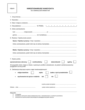 zdjęcie KWESTIONARIUSZ KANDYDATA DO GIMNAZJUM ANIMATOR 1. Imię (imiona)............................................................................................................................................... 2. Nazwisko:................................................................................................................................................... 3. Data i miejsce urodzenia:........................................................................................................................... 4. Obywatelstwo: .................................... Nr PESEL: I___I___I___I___I___I___I___I___I___I___I___I 5. Adres zamieszkania: kod ..................... miejscowość.....................................ul. ....................................................................... gmina: ................................................. tel. kontaktowy ........................................................................... 6. Rodzice / Opiekunowie prawni: Ojciec / Opiekun prawny / Imię i nazwisko:............................................................................................ Adres zamieszkania, jeżeli różni się od adresu kandydata:.................................................................... .................................................................................................................................................................. Matka / Opiekun prawny / Imię i nazwisko:........................................................................................... Adres zamieszkania, jeżeli różni się od adresu kandydata: .................................................................... ................................................................................................................................................................. 7. Wybór profilu: sprawnościowo obronny multimedialny dziennikarski ogólny W przypadku braku miejsc w klasie z wybranym profilem oświadczam, że jestem zainteresowana/ny przyjęciem na inny profil. 8. Deklaracja dotycząca wyboru zajęć nieobowiązkowych: religia katolicka wychowanie do życia w rodzinie: Gliwice , dnia ........................................... etyka tak żaden z tych przedmiotów nie czytelny podpis kandydata ………......................................... podpis rodzica (opiekuna) ………......................................... Załączniki: 1. 2 fotografie 2. świadectwo ukończenia szkoły podstawowej wraz z zaświadczeniem o wynikach sprawdzianu 3. orzeczenie lub opinia poradni psychologiczno-pedagogicznej (jeżeli dotyczy)