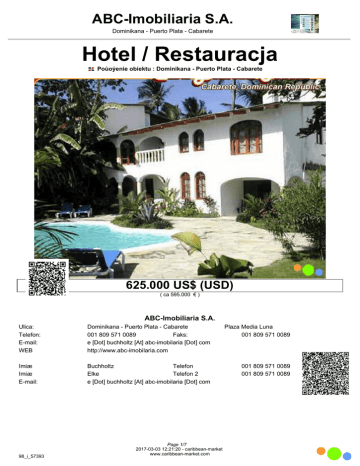 ABC-Imobiliaria S.A. Dominikana - Puerto Plata - Cabarete Hotel / Restauracja Poùoýenie obiektu : Dominikana - Puerto Plata - Cabarete 625.000 US$ (USD) ( ca 595.000 € ) ABC-Imobiliaria S.A. Ulica: Telefon: E-mail: WEB Dominikana - Puerto Plata - Cabarete 001 809 571 0089 Faks: e [Dot] buchholtz [At] abc-imobilaria [Dot] com http://www.abc-imobilaria.com Plaza Media Luna 001 809 571 0089 Imiæ Imiæ E-mail: Buchholtz Telefon Elke Telefon 2 e [Dot] buchholtz [At] abc-imobilaria [Dot] com 001 809 571 0089 001 809 571 0089 98_i_57393 Page 1/7 2017-03-03 12:21:20 - caribbean-market www.caribbean-market.com ABC-Imobiliaria S.A. Dominikana - Puerto Plata - Cabarete Numer kodu Typ budynku Poùoýenie Materiaùy Property Address 98_i_57393 Hotel / Restauracja Úródmieúcie Beton Numer kodu Nr referencyjny Status objektet Rok po uzgodnieniu potrzebne 2002 Powierzchnia dziaùki Firma Ýycie Kuchnia Sypialnie Zùy Opinie Toaleta 950 m2 Powierzchnia 800 m2 Dojazd: 30 Protokoùy 1 Samochód Biznes Inne Usùugi Garaý Carport zadaszony taras Lotnisko Akcesoria Dzierýawa Taras Balkon Jetty Pokój Party Klimatyzacja Resort Ogród Pralnia Goràcy zadaszony taras ogrodzony / murem 98_i_57393 Page 2/7 2017-03-03 12:21:20 - caribbean-market www.caribbean-market.com 1 ABC-Imobiliaria S.A. Dominikana - Puerto Plata - Cabarete 98_i_57393 Page 3/7 2017-03-03 12:21:20 - caribbean-market www.caribbean-market.com ABC-Imobiliaria S.A. Dominikana - Puerto Plata - Cabarete 98_i_57393 Page 4/7 2017-03-03 12:21:20 - caribbean-market www.caribbean-market.com ABC-Imobiliaria S.A. Dominikana - Puerto Plata - Cabarete 98_i_57393 Page 5/7 2017-03-03 12:21:20 - caribbean-market www.caribbean-market.com ABC-Imobiliaria S.A. Dominikana - Puerto Plata - Cabarete 98_i_57393 Page 6/7 2017-03-03 12:21:20 - caribbean-market www.caribbean-market.com ABC-Imobiliaria S.A. Dominikana - Puerto Plata - Cabarete 98_i_57393 Page 7/7 2017-03-03 12:21:20 - caribbean-market www.caribbean-market.com