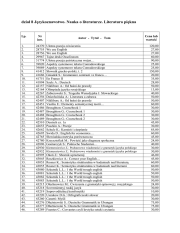 dział 8 Językoznawstwo. Nauka o literaturze. Literatura piękna Lp. Nr inw. 1. 2. 3. 4. 5. 6. 7. 8. 9. 10. 11. 12. 13. 14. 15. 16. 17. 18. 19. 20. 21. 22. 23. 24. 25. 26. 27. 28. 29. 30. 31. 32. 33. 34. 35. 36. 37. 38. 39. 40. 41. 42. 43. 44. 45. 46. 24370 28755 28756 29967 31774 39820 39889 41412 41686 41751 41894 42157 42164 42267 42356 42407 42451 42486 42487 42488 42489 42510 42653 42662 42695 42765 42780 42896 42930 42932 42995 43045 43053 43055 43080 43081 43082 43083 43215 43218 43219 43220 43260 43276 43277 43289 Autor - Tytuł - Tom Ulotna poezja oświecenia We use English We use English Tajne druki Ossolineum Ulotna poezja patriotyczna wojen… Aspekty systemowe tekstu Conradowskiego Aspekty systemowe tekstu Conradowskiego Słownik grecko-polski, t. 2 Gniadek S.: Grammaire contrasti ve franco… En France II Szulc A.: Deutsch Nikliborc A.: Od baśni do prawdy Olimpiada języka rosyjskiego Zabierowski S.: Tragedia Wenedyjska J. Słowackiego Dziechcińska A.: Literatura a zabawa Nikliborc A.: Od baśni do prawdy Vasiliu E.: Elementy semantycznej teorii… Broughton: Coursebook 1 Broughton G.: Coursebook 1 Broughton G.: Coursebook 2 Broughton G.: Coursebook 2 Deutsch cz. 1a Puszkin A.: Poezje Schulz K.: Kamień i cierpienie Swida D.: English for economics… Słowiańska metryka porównawcza Krzysztofiak M.: Powieść jako diagnoza społeczna Gontarczyk S.: Polnische Studenten… Klemensiewicz Z.: Podstawowe wiadomości z gramatyki języka polskiego Klemensiewicz Z.: Podstawowe wiadomości z gramatyki języka polskiego Okoń Z.: Sbornik uprażnenij Reszkiewicz A.: Correct your English… Rosner K.: Semiotyka strukturalna w badaniach nad literaturą Rosner K.: Semiotyka strukturalna w badaniach nad literami Szkutnik L.L.: 1 the World trough english Szkutnik L.L.: 1 the World trough english Szkutnik L.L.: 1 the World trough english Szkutnik L.L.: 1 the World trough english Olechnowicz M.: Ćwiczenia z gramatyki opisowej j. rosyjskiego Sovremiennyj ruskij jazyk Soprovoditelnyj kursfonetiki Uszakow D.G.: Orfograficzeski słowar Canetti: Myśli Dłużniewski S.: Deutsche Grammatik in Ubungen Dłużniewski S.: Deutsche Grammatik in Ubungen Fuentes C.: Cervantes czyli krytyka sztuki czytania Cena lub wartość 120,00 27,00 27,00 60,00 90,00 25,00 25,00 150,00 20,00 35,00 28,00 50,00 13,00 40,00 50,00 50,00 60,00 30,00 30,00 30,00 30,00 45,00 30,00 85,00 60,00 45,00 24,00 40,00 30,00 30,00 46,00 45,00 60,00 60,00 50,00 50,00 50,00 50,00 24,00 30,00 10,00 20,00 30,00 75,00 75,00 30,00 47. 48. 49. 50. 51. 52. 53. 54. 55. 56. 57. 58. 59. 60. 61. 62. 63. 64. 65. 66. 67. 68. 69. 70. 71. 72. 73. 74. 75. 76. 77. 78. 79. 80. 81. 82. 83. 84. 85. 86. 87. 88. 89. 90. 91. 92. 93. 94. 95. 96. 97. 98. 99. 43333 43334 43380 43467 43470 43503 43541 43560 43600 43615 43617 43718 43770 43841 43853 44140 44250 44326 44423 44424 44462 44464 44670 44671 44672 44674 44675 44676 44792 44798 44799 44802 44822 44823 44824 44914 44940 44946 44947 44967 45002 45008 45014 45099 45121 45126 45130 45235 45237 45238 45275 45292 45323 Kowalik J.: Programowana gramatyka języka polskiego Kowali J.: Programowana gramatyka języka polskiego Mroczkowski P.: Szekspir elżbietański i żywy Wawrzkowicz S.: Podręczny słownik hiszpańsko-polski Whorf B.L.: Język myśli i rzeczywistości Conetti E.: Myśli Kowalik J.: Programowana gramatyka języka polskiego Pani de Sevigne. Listy Spasowicz W.: Pisma krytyczno-literackie Wawrzkowicz S.: Podręczny słownik hiszpańsko-polski Whorf B.L.: Język myśli i rzeczywistości Balcerzan E.: Poezja polska w latach 1939-1965 Rymkiewicz M.J.: Juliusz Słowacki pyta o godzinę Jastrzębski J.: Czas relaksu Kowalik-Kaleta Z.; Staropolskie nazwy osobowe motywowane… Rogalski A.: Knut Hamsun Mann H.: Młodość Króla Henryka IV Współczesna literatura NRD Cząstka B.: Materiały pomocnicze… Cząstka B.: Materiały pomocnicze… Kaczmarski S. P.: Verb Forms in Billingual… Kapuściński W.J.: Człowiek czy humanista… Szerdahelyi T.: Esperanto, cz. 1 Szerdahelyi T.: Esperanto, cz. 1 Szerdahelyi T.: Esperanto, cz. 1 Szerdahelyi T.: Esperanto, cz. 2 Szerdahelyi T.: Esperanto, cz. 2 Szerdahelyi T.: Esperanto, cz. 2 Holderlin F.: Pod brzmieniem mego losu Jupp T.C.: Talk english Jupp T.C.: Talk english Kopcewicz A.: Historia literatury Stanów Zjednoczonych Łuszczyk S.: Gramatyka języka niemieckiego Łuszczyk S.: Gramatyka języka niemieckiego Łuszczyk S.: Gramatyka języka niemieckiego Rosyjskie kierunki literackie Helbig G.: Dzieje językoznawstwa nowożytnego Jupp T.C.: Talk english Jupp T.C.: Talk english Łuszczyk S.: Gramatyka języka niemieckiego Szkutnik L.L.: English Through Science… Troskolański A.T.: O twórczości… Wójcik T.: Podręcznik języka rosyjskiego… Problemy teorii literatury w Polsce międzywojennej Stępień M.: Poszukiwania i obserwacja Szkutnik L.L.: English Through Troskolańki A.T.: O twórczości … Grek-Pabisowa I.: Ilustrowany słownik dla dzieci… Michalak M.: Język francuski dla lektoratów… Michalak M.: Język francuski dla … Cymborska-Laboda: Dramaturgia Leonida Andriejewa Grek-Pabisowa I.: Ilustrowany słownik dla dzieci… Michalak M.: Język francuski dla … 106,00 106,00 70,00 450,00 199,00 30,00 106,00 150,00 160,00 450,00 100,00 120,00 130,00 80,00 45,00 50,00 220,00 60,00 20,00 20,00 100,00 55,00 87,00 87,00 87,00 74,00 74,00 74,00 250,00 95,00 95,00 220,00 130,00 130,00 130,00 200,00 180,00 95,00 95,00 130,00 80,00 120,00 130,00 230,00 90,00 80,00 120,00 200,00 120,00 120,00 120,00 200,00 120,00 100. 101. 102. 103. 104. 105. 106. 107. 108. 109. 110. 111. 112. 113. 114. 115. 116. 117. 118. 119. 120. 121. 122. 123. 124. 125. 126. 127. 128. 129. 130. 131. 132. 133. 134. 135. 136. 137. 138. 139. 140. 141. 142. 143. 144. 145. 146. 147. 148. 149. 150. 151. 152. 45347 45367 45370 45375 45376 45377 45378 45380 45388 45403 45404 45409 45418 45421 45422 45497 45507 45538 45539 45552 45615 45622 45664 45682 45683 45697 45699 45701 45703 45