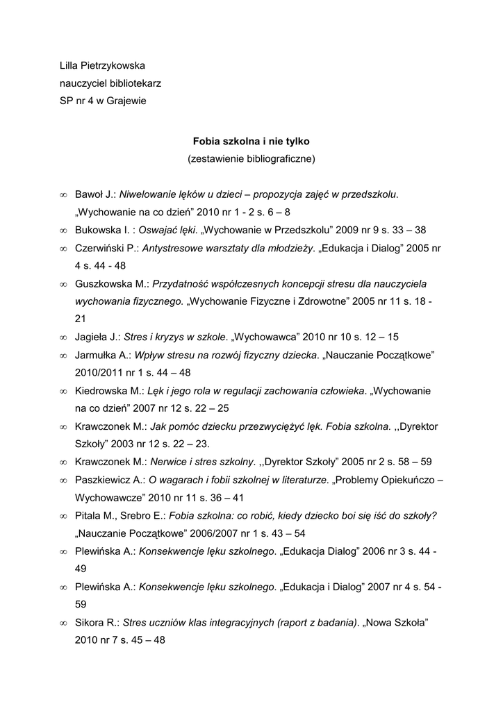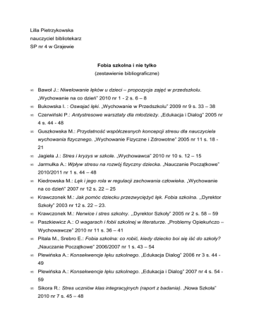 Lilla Pietrzykowska nauczyciel bibliotekarz SP nr 4 w Grajewie Fobia szkolna i nie tylko (zestawienie bibliograficzne) • Bawoł J.: Niwelowanie lęków u dzieci – propozycja zajęć w przedszkolu. „Wychowanie na co dzień” 2010 nr 1 - 2 s. 6 – 8 • Bukowska I. : Oswajać lęki. „Wychowanie w Przedszkolu” 2009 nr 9 s. 33 – 38 • Czerwiński P.: Antystresowe warsztaty dla młodzieŜy. „Edukacja i Dialog” 2005 nr 4 s. 44 - 48 • Guszkowska M.: Przydatność współczesnych koncepcji stresu dla nauczyciela wychowania fizycznego. „Wychowanie Fizyczne i Zdrowotne” 2005 nr 11 s. 18 21 • Jagieła J.: Stres i kryzys w szkole. „Wychowawca” 2010 nr 10 s. 12 – 15 • Jarmułka A.: Wpływ stresu na rozwój fizyczny dziecka. „Nauczanie Początkowe” 2010/2011 nr 1 s. 44 – 48 • Kiedrowska M.: Lęk i jego rola w regulacji zachowania człowieka. „Wychowanie na co dzień” 2007 nr 12 s. 22 – 25 • Krawczonek M.: Jak pomóc dziecku przezwycięŜyć lęk. Fobia szkolna. ,,Dyrektor Szkoły” 2003 nr 12 s. 22 – 23. • Krawczonek M.: Nerwice i stres szkolny. ,,Dyrektor Szkoły” 2005 nr 2 s. 58 – 59 • Paszkiewicz A.: O wagarach i fobii szkolnej w literaturze. „Problemy Opiekuńczo – Wychowawcze” 2010 nr 11 s. 36 – 41 • Pitala M., Srebro E.: Fobia szkolna: co robić, kiedy dziecko boi się iść do szkoły? „Nauczanie Początkowe” 2006/2007 nr 1 s. 43 – 54 • Plewińska A.: Konsekwencje lęku szkolnego. „Edukacja Dialog” 2006 nr 3 s. 44 49 • Plewińska A.: Konsekwencje lęku szkolnego. „Edukacja i Dialog” 2007 nr 4 s. 54 59 • Sikora R.: Stres uczniów klas integracyjnych (raport z badania). „Nowa Szkoła” 2010 nr 7 s. 45 – 48 • Stachowicz M., Łyczko A.: Problem lęku przed wodą. „Wychowanie Fizyczne i Zdrowotne” 2009 nr 7 s. 30 – 33 • Stańczak I.: Lęk szkolny dziecka na etapie wczesnej edukacji. „Nauczanie Początkowe” 2010/2011 nr 1 s. 14 – 19 • Wiesiołowska K.: Nie boję się lekarza. „Wychowanie w Przedszkolu” 2010 nr 11 s. 50 - 51 • Woźniak A.: Lęki – mit czy rzeczywistość? „Edukacja i Dialog” 2005 nr 4 s. 39 - 43 • Wróbel M.: Nie taki mrok straszny. „Wychowanie w Przedszkolu” 2010 nr 10 s. 48 - 49