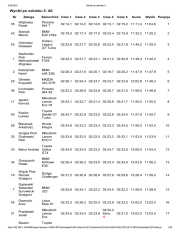 5.09.2015 Wyniki po odcinku 5 Wyniki po odcinku 5: All Nr Załoga Samochód Czas 1 Czas 2 Czas 3 Czas 4 Czas 5 Suma Wynik Pozycja 35 Wójtowicz Paweł Porsche 944 T 02:14,1 02:14,2 02:14,8 02:13,1 02:15,2 11:11,4 11:04,6 1 43 Staniak Marcin BMW E30 318is 02:18,0 02:17,4 02:17,5 02:23,4 02:15,9 11:32,2 11:25,2 2 53 Ostrowicz Oktawian Subaru Legacy GT Turbo 02:22,6 02:21,7 02:20,6 02:22,5 02:21,8 11:49,2 11:35,0 3 1 Szafrański Piotr Ferrari Niebrzydowski F355 Zbigniew 02:22,4 02:21,7 02:23,1 02:21,2 02:20,9 11:49,3 11:42,2 4 2 Kołodyński Kamil BMW e36 328i 02:26,3 02:21,6 02:20,1 02:19,7 02:20,2 11:47,9 11:47,9 5 29 Głowala Krzysztof MAZDA 323 GTR 02:26,1 02:24,4 02:24,7 02:23,7 02:23,9 12:02,8 11:48,3 6 36 Łochowski Piotr Porsche 944 S2 02:22,2 02:28,8 02:22,8 02:20,7 02:21,5 11:56,0 11:48,8 7 11 Jęczeń Konrad Mitsubishi Lancer Evo VII 02:24,1 02:22,7 02:21,4 02:20,6 02:21,7 11:50,5 11:50,5 8 40 Kopiec Łukasz Toyota Starlet GT Turbo 02:24,7 02:22,9 02:23,5 02:22,8 02:24,0 11:57,9 11:50,7 9 59 Błaszczyk Arkadiusz Honda Integra 02:24,8 02:23,2 02:23,4 02:23,3 02:24,5 11:59,2 11:52,0 10 30 Grząba Piotr Oczkowski Piotr Mitsubishi Lancer EVO V 02:23,6 02:22,5 02:22,5 02:23,2 02:22,1 11:53,9 11:53,9 11 33 Toyota Banul Andrzej Celica GT4 02:34,0 02:24,5 02:23,2 02:24,7 02:22,6 12:09,0 11:54,4 12 34 Goszczycki Paweł BMW M Power E36 02:26,4 02:26,2 02:23,5 02:23,4 02:24,0 12:03,5 11:56,2 13 16 Wojcik Piotr Reczek Grzegorz Dodge 02:31,2 02:30,9 02:28,9 02:27,8 02:29,6 12:28,4 11:58,4 Challenger 14 7 Gąsiewski Sebastian Surowiecki Grzegorz BMW 323 02:25,8 02:24,1 02:22,2 02:24,5 02:22,3 11:58,9 11:58,9 15 45 Gawryluk Artur Lotus Elise S1 02:23,3 02:26,2 02:25,4 02:23,9 02:23,2 12:02,0 12:02,0 16 31 Przeździak Jacek Mitsubishi Lancer Evo 02:24,2 02:24,5 02:24,0 02:23,8 Kara: 02:21,0 12:02,5 12:02,5 5 17 Siewior Toyota http://192.168.1.100:8080/report?param=%5B%7B%22checked%22%3Atrue%2C%22name%22%3A%22All%22%7D%2C%7B%22checked%22%3Atrue… 1/25 5.09.2015 Wyniki po odcinku 5 60 Michał MR2 02:28,2 02:26,7 02:26,9 02:29,0 02:27,4 12:18,2 12:03,4 18 79 Wojtowicz Mikołaj Mercedes AMG A45 02:25,5 02:26,7 02:25,0 02:24,6 02:23,9 12:05,7 12:05,7 19 69 Niebrzydowski Zbigniew Ferrari Szafrański F355 Piotr 02:26,4 02:27,2 02:27,2 02:25,3 02:27,3 12:13,4 12:06,0 20 39 Mielżyński Maksymilian BMW 323ti 02:32,2 02:31,4 02:31,1 02:32,8 02:31,7 12:39,2 12:08,8 21 44 Biały Mariusz BMW E30 320is 02:27,1 02:25,0 02:23,4 02:23,1 Kara: 02:26,4 12:20,0 12:12,7 15 22 14 Leśkiewicz Bartosz Peugeot 205 02:28,9 02:27,8 02:26,6 02:26,7 02:26,8 12:16,8 12:16,8 23 32 Kajdanowicz Marek Szafrański Piotr Subaru Impreza STI 02:24,8 02:41,1 02:26,5 02:23,3 02:23,0 12:18,7 12:18,7 24 Kaczmarek Andrzej BMW e36 325i 02:25,3 02:26,8 Kara: 02:26,2 02:23,9 02:26,5 Kara: 12:18,7 12:18,7 5 5 24 56 Mazurek Mirosław Porsche 944S 02:31,0 02:30,2 02:31,3 02:32,0 02:30,0 12:34,5 12:19,4 26 55 Augustyniak Adam BMW E30 325e 02:32,6 02:30,7 02:31,8 02:31,0 02:30,9 12:37,0 12:21,8 27 46 Mackiewicz Krzysztof Honda Civic 02:32,0 02:30,3 02:28,5 02:29,2 02:29,4 12:29,4 12:21,9 28 10 Całka Jakub Poszytek Kamil Subaru Impreza 02:28,5 02:30,4 02:28,4 02:27,4 02:27,4 12:22,1 12:22,1 29 76 Słomski Radosław Toyota Mr2 02:32,6 02:33,8 02:32,1 02:31,8 02:30,8 12:41,1 12:25,8 30 Legun Bartosz BMW E34 02:29,0 02:29,6 02:29,0 02:28,6 02:31,2 12:27,4 12:27,4 31 49 Świeboda Maciej Renault Clio 02:32,8 02:32,0 Kara: 02:32,0 02:26,5 02:26,6 12:34,9 12:27,4 5 32 57 Kaczmarek Filip BMW 02:33,4 02:32,4 02:31,4 02:33,8 02:32,3 12:43,3 12:28,0 325 (E-30) 33 58 Krakowski Grzegorz Krakowska Olga BMW E30 325i 02:43,3 02:31,1 02:30,8 02:31,8 02:30,9 12:47,9 12:32,5 34 Więcek Paweł Ford KolasaShelby Więcek Alicja gt500 02:34,0 02:32,2 02:30,6 02:30,9 02:30,9 12:38,6 12:38,6 35 Zawada Wiesław 02:33,3 02:33,6 02:35,8 02:33,3 02:31,4 12:47,4 12:39,7 36 9 6 5 22 Ford Mustang http://192.168.1.100:8080/report?param=%5B%7B%22checked%22%3Atrue%2C%22name%22%3A%22All%22%7D%2C%7B%22checked%22%3Atrue… 2/25 5.09.2015 Wyniki po odcinku 5 51 Sapinski Jacek Umgelter Dorota Porsche 911 02:35,7 02:36,1 02:34,0 02:30,5 02:33,2 12:49,5 12:41,8 37 68 Grzegory Konrad Opel Manta B 02:31,5 02:32,3 02:32,0 02:32,2 02:34,3 12:42,3 12:42,3 38 38 Słomska Agata Toyota Mr2 02:36,6 02:36,0 02:37,4 02:35,1 02:36,2 13:01,3 12:45,6 39 50 Siodmok Paweł Księżopolska Sylwia Renaul Clio 02:35,3 02:32,0 02:33,1 02:33,5 02:32,5 12:46,4 12:46,4 40 66 Lemieszek Marcin Mazda RX-7 02:30,2 02:36,7 02:30,9 02:41,0 02:29,3 12:48,1 12:48,1 41 47 Kacperek Marcin -- BMW 318 is 02:38,3 02:36,0 02:33,0 02:35,1 02:37,1 12:59,5 12:51,7 42 18 Zorga Krzysztof Wnuk Aleksandra Pontiac Trans Am 02:36,7 02:34,2 02:33,6 02:33,1 02:34,2 12:51,8 12:51,8 43 23 Machudera Andrzej Mercedes 450 SLC 02:41,8 02:43,8 02:40,3 02:40,9 02:41,3 13:28,1 12:55,7 44 70 Śliwka Waldemar Porsche 924 02:35,8 02:35,5 02:36,2 02:35,8 02:34,5 12:57,8 12:57,8 45 37 Słomski Radosław Porsche 944 S2 02:37,9 02:37,7 02:38,0 02:36,7 02:35,8 13:06,1 12:58,2 46 20 Zienkiewicz Jacek Pasik Urszula Ford Mustang SVT Cobra 02:38,2 02:36,6 02:36,4 02:37,0 02:37,8 13:06,0 13:06,0 47 61 Kurek Krzysztof Peugeot 205 GTI 02:42,0 02:41,1 02:38,3 02:42,0 02:39,2 13:22,6 13:06,5 48 54 Surowiecki Grzegorz Gąsiewski Sebastian BMW 323 02:38,6 02:36,7 02:34,8 02:43,0 02:33,5 13:06,6 13:06,6 49 17 Kamiński Aleksander Ford Mustang 02:35,5 02:44,4 02:36,9 02:35,5 02:35,0 13:07,3 13:07,3 50 41 Śliwka Michał Porsche 924 02:40,3 02:37,6 02:36,6 02:36,6 02:36,9 13:08,0 13:08,0 51 Wawer Mateusz Całka Piotr Honda Accord 02:40,3 02:38,5 02:37,8 02:36,3 02:37,7 13:10,6 13:10,6 52 77 Chwist Marcin Porsche 944 02:49,6 Kara: 02:34,6 02:33,0 02:33,9 02:35,4 13:11,5 13:11,5 5 53 71 Mazur Jakub Szatan Jakub Ford Capri 02:44,5 02:41,0 Kara: 02:37,5 02:35,0 02:37,4 13:20,4 13:12,4 5 54 4 http://192.168.1.100:8080/report?param=%5B%7B%22checked%22%3Atrue%2C%22name%22%3A%22All%22%7D%2C%7B%22checked%22%3Atrue… 3/25 5.09.2015 Wyniki po odcinku 5 12 Kamiński BMW Piot