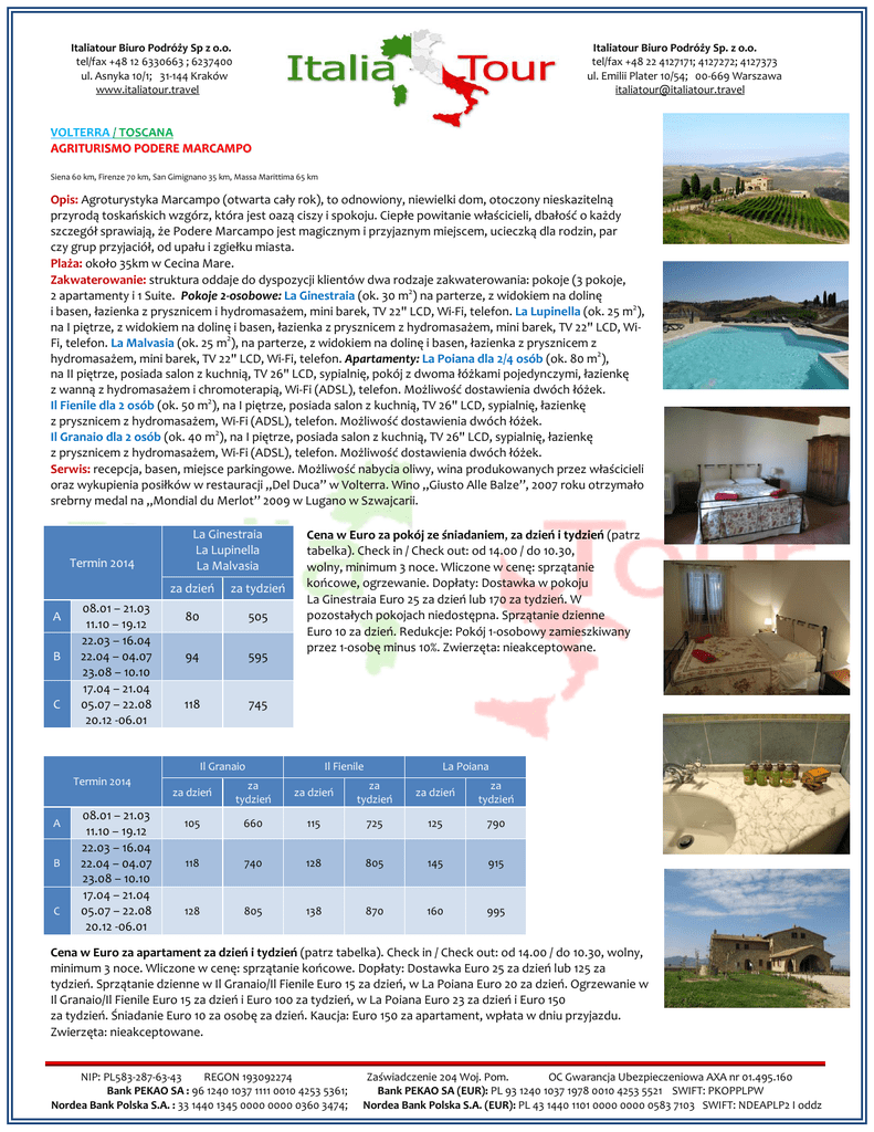 Italiatour Biuro Podróży Sp z o.o. tel/fax +48 12 6330663 ; 6237400 ul. Asnyka 10/1; 31-144 Kraków www.italiatour.travel Italiatour Biuro Podróży Sp. z o.o. tel/fax +48 22 4127171; 4127272; 4127373 ul. Emilii Plater 10/54; 00-669 Warszawa [email protected] VOLTERRA / TOSCANA AGRITURISMO PODERE MARCAMPO Siena 60 km, Firenze 70 km, San Gimignano 35 km, Massa Marittima 65 km Opis: Agroturystyka Marcampo (otwarta cały rok), to odnowiony, niewielki dom, otoczony nieskazitelną przyrodą toskańskich wzgórz, która jest oazą ciszy i spokoju. Ciepłe powitanie właścicieli, dbałość o każdy szczegół sprawiają, że Podere Marcampo jest magicznym i przyjaznym miejscem, ucieczką dla rodzin, par czy grup przyjaciół, od upału i zgiełku miasta. Plaża: około 35km w Cecina Mare. Zakwaterowanie: struktura oddaje do dyspozycji klientów dwa rodzaje zakwaterowania: pokoje (3 pokoje, 2 apartamenty i 1 Suite. Pokoje 2-osobowe: La Ginestraia (ok. 30 m2) na parterze, z widokiem na dolinę i basen, łazienka z prysznicem i hydromasażem, mini barek, TV 22" LCD, Wi-Fi, telefon. La Lupinella (ok. 25 m2), na I piętrze, z widokiem na dolinę i basen, łazienka z prysznicem z hydromasażem, mini barek, TV 22" LCD, WiFi, telefon. La Malvasia (ok. 25 m2), na parterze, z widokiem na dolinę i basen, łazienka z prysznicem z hydromasażem, mini barek, TV 22" LCD, Wi-Fi, telefon. Apartamenty: La Poiana dla 2/4 osób (ok. 80 m2), na II piętrze, posiada salon z kuchnią, TV 26" LCD, sypialnię, pokój z dwoma łóżkami pojedynczymi, łazienkę z wanną z hydromasażem i chromoterapią, Wi-Fi (ADSL), telefon. Możliwość dostawienia dwóch łóżek. Il Fienile dla 2 osób (ok. 50 m2), na I piętrze, posiada salon z kuchnią, TV 26" LCD, sypialnię, łazienkę z prysznicem z hydromasażem, Wi-Fi (ADSL), telefon. Możliwość dostawienia dwóch łóżek. Il Granaio dla 2 osób (ok. 40 m2), na I piętrze, posiada salon z kuchnią, TV 26" LCD, sypialnię, łazienkę z prysznicem z hydromasażem, Wi-Fi (ADSL), telefon. Możliwość dostawienia dwóch łóżek. Serwis: recepcja, basen, miejsce parkingowe. Możliwość nabycia oliwy, wina produkowanych przez właścicieli oraz wykupienia posiłków w restauracji „Del Duca” w Volterra. Wino „Giusto Alle Balze”, 2007 roku otrzymało srebrny medal na „Mondial du Merlot” 2009 w Lugano w Szwajcarii. Termin 2014 A B C 08.01 – 21.03 11.10 – 19.12 22.03 – 16.04 22.04 – 04.07 23.08 – 10.10 17.04 – 21.04 05.07 – 22.08 20.12 -06.01 La Ginestraia La Lupinella La Malvasia za dzień za tydzień 80 505 94 595 118 745 Cena w Euro za pokój ze śniadaniem, za dzień i tydzień (patrz tabelka). Check in / Check out: od 14.00 / do 10.30, wolny, minimum 3 noce. Wliczone w cenę: sprzątanie końcowe, ogrzewanie. Dopłaty: Dostawka w pokoju La Ginestraia Euro 25 za dzień lub 170 za tydzień. W pozostałych pokojach niedostępna. Sprzątanie dzienne Euro 10 za dzień. Redukcje: Pokój 1-osobowy zamieszkiwany przez 1-osobę minus 10%. Zwierzęta: nieakceptowane. Il Granaio Termin 2014 A B C 08.01 – 21.03 11.10 – 19.12 22.03 – 16.04 22.04 – 04.07 23.08 – 10.10 17.04 – 21.04 05.07 – 22.08 20.12 -06.01 Il Fienile La Poiana za dzień za tydzień za dzień za tydzień za dzień za tydzień 105 660 115 725 125 790 118 740 128 805 145 915 128 805 138 870 160 995 Cena w Euro za apartament za dzień i tydzień (patrz tabelka). Check in / Check out: od 14.00 / do 10.30, wolny, minimum 3 noce. Wliczone w cenę: sprzątanie końcowe. Dopłaty: Dostawka Euro 25 za dzień lub 125 za tydzień. Sprzątanie dzienne w Il Granaio/Il Fienile Euro 15 za dzień, w La Poiana Euro 20 za dzień. Ogrzewanie w Il Granaio/Il Fienile Euro 15 za dzień i Euro 100 za tydzień, w La Poiana Euro 23 za dzień i Euro 150 za tydzień. Śniadanie Euro 10 za osobę za dzień. Kaucja: Euro 150 za apartament, wpłata w dniu przyjazdu. Zwierzęta: nieakceptowane. NIP: PL583-287-63-43 REGON 193092274 Bank PEKAO SA : 96 1240 1037 1111 0010 4253 5361; Nordea Bank Polska S.A. : 33 1440 1345 0000 0000 0360 3474; Zaświadczenie 204 Woj. Pom. OC Gwarancja Ubezpieczeniowa AXA nr 01.495.160 Bank PEKAO SA (EUR): PL 93 1240 1037 1978 0010 4253 5521 SWIFT: PKOPPLPW Nordea Bank Polska S.A. (EUR): PL 43 1440 1101 0000 0000 0583 7103 SWIFT: NDEAPLP2 I oddz