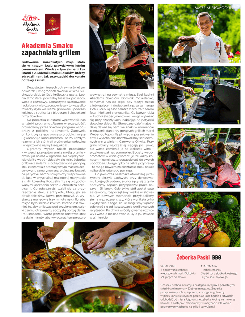 MATERIAŁ PROMOCYJNY Akademia Smaku zapachniała grillem Grillowanie smakowitych mięs stało się w naszym kraju prawdziwym letnim ceremoniałem. Wiedzą o tym eksperci kulinarni z Akademii Smaku Sokołów, którzy zdradzili nam, jak przyrządzić doskonałe potrawy z rusztu. Degustacja mięsnych potraw na świeżym powietrzu, w ogrodach dworku w Woli Suchożebrskiej, to iście królewska uczta. Letnia atmosfera, powitalny kieliszek prosecco, wesołe rozmowy, zamaszyste szatkowanie i odgłosy skwierczącego mięsa – to wszystko towarzyszyło wielkiemu grillowaniu podczas kolejnego spotkania z blogerami i ekspertami firmy Sokołów. Na początku ci ostatni wprowadzili nas w tajniki programu „Razem w przyszłość”, prowadzony przez Sokołów program współpracy z polskimi hodowcami. Zapewnia on kontrolę całego procesu produkcji mięsa i gwarantuje konsumentom, że za każdym razem na ich stół trafi wyśmienita wołowina i wieprzowina najwyższej jakości. Ogromny wybór takich produktów – w wersji przygotowanej z myślą o grillu – czekał już na nas w ogrodzie. Na nieprzyzwoicie obfity wybór składały się m.in. żeberka grillowe z ziołami i słodką czerwoną papryką, stek z rozbratla z aromatycznym masłem czosnkowym, zamarynowany, zrolowany boczek na patyczku bambusowym czy wieprzowina de luxe w oryginalnej malinowej marynacie z chili i kolendrą. Podzieliliśmy się przygotowanymi uprzednio przez kuchmistrza przepisami. Co odważniejsi wzięli się za przyrządzanie steku z antrykotu, który, jak się dowiedzieliśmy, łatwo przesmażyć. A wystarczą mu ledwie trzy minuty na grillu, aby mięso było średnio krwiste. Istotne jest również to, aby grillować pod przykryciem, dzięki czemu otrzymamy soczystą porcję dania. Po usmażeniu warto jeszcze odstawić stek na dwie minuty, aby wyrównać temperaturę wewnątrz i na zewnątrz mięsa. Szef kuchni Akademii Sokołów, Dominik Moskalenko, namawiał nas do tego, aby łączyć mięso z intrygującymi dodatkami, np. salsą mango z chili i cebulą albo sałatką z arbuza z serem feta i kiełkami słonecznika. Ci, którzy lubią w kuchni eksperymentować, mogli wykazać się przy szaszłykach, nabijając na patyczki dowolne składniki. Słoneczny dzień najbardziej dawał się nam we znaki w momencie pilnowania dań przy gorących grillach marki Weber od top-grille.pl, więc w poszukiwaniu chwili wytchnienia kosztowaliśmy schłodzonych win z winiarni Czerwona Oliwka. Przy grillu Polacy najczęściej sięgają po piwo, ale warto zamienić je na kieliszek wina – przekonywał nas sommelier. Bogaty wybór aromatów w winie gwarantuje, że każdy koneser mięsnej uczty dopasuje coś do swoich upodobań. Uwaga tylko na ostre przyprawy – te mogą bowiem zniekształcić smak nawet najbardziej udanego pairingu. Co jakiś czas beztroską atmosferę przerywały okrzyki zachwytu przy dekorowaniu kolejnych potraw, a unoszący się z grilla apetyczny zapach przyspieszał pracę naszych ślinianek. Gdy tylko stół został suto zastawiony, rozpoczęliśmy wielkie ucztowanie. W pewnym momencie przyłapaliśmy się na niezręcznej ciszy, która wynikała tylko i wyłącznie z tego, że ie mogliśmy wprost oderwać się od kosztowania ugrillowanych rarytasów. Po chwili wróciły gwarne rozmowy i wesołe biesiadowanie. Było jak zawsze wyśmienicie! Żeberka Paski BBQ SKŁADNIKI: 1 opakowanie żeberek wieprzowych marki Sokołów sól, pieprz do smaku MARYNATA: 1 ząbek czosnku 3 łyżki sosu słodko-kwaśnego 3 łyżki sosu sojowego Czosnek drobno siekamy, a następnie łączymy z pozostałymi składnikami marynaty. Dobrze mieszamy. Żeberka przyprawiamy solą i pieprzem, a następnie gotujemy w piecu konwekcyjnym na parze, aż kość będzie z łatwością odchodzić od mięsa. Ugotowane żeberka kroimy na mniejsze kawałki, a następnie marynujemy w marynacie. Na koniec podgrzewamy żeberka na grillu i serwujemy!