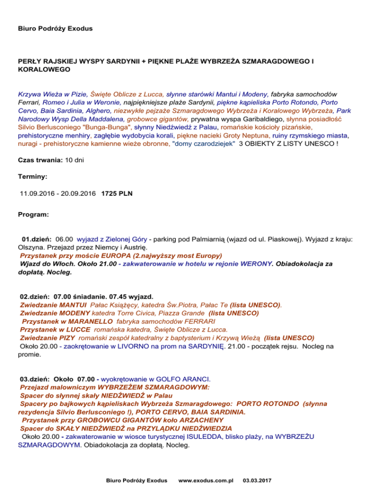 Biuro Podróży Exodus PERŁY RAJSKIEJ WYSPY SARDYNII + PIĘKNE PLAŻE WYBRZEŻA SZMARAGDOWEGO I KORALOWEGO Krzywa Wieża w Pizie, Święte Oblicze z Lucca, słynne starówki Mantui i Modeny, fabryka samochodów Ferrari, Romeo i Julia w Weronie, najpiękniejsze plaże Sardynii, piękne kąpieliska Porto Rotondo, Porto Cervo, Baia Sardinia, Alghero, niezwykłe pejzaże Szmaragdowego Wybrzeża i Koralowego Wybrzeża, Park Narodowy Wysp Della Maddalena, grobowce gigantów, prywatna wyspa Garibaldiego, słynna posiadłość Silvio Berlusconiego "Bunga-Bunga", słynny Niedźwiedź z Palau, romańskie kościoły pizańskie, prehistoryczne menhiry, zagłębie wydobycia korali, piękne nacieki Groty Neptuna, ruiny rzymskiego miasta, nuragi - prehistoryczne kamienne wieże obronne, "domy czarodziejek" 3 OBIEKTY Z LISTY UNESCO ! Czas trwania: 10 dni Terminy: 11.09.2016 - 20.09.2016 1725 PLN Program: 01.dzień: 06.00 wyjazd z Zielonej Góry - parking pod Palmiarnią (wjazd od ul. Piaskowej). Wyjazd z kraju: Olszyna. Przejazd przez Niemcy i Austrię. Przystanek przy moście EUROPA (2.najwyższy most Europy) Wjazd do Włoch. Około 21.00 - zakwaterowanie w hotelu w rejonie WERONY. Obiadokolacja za dopłatą. Nocleg. 02.dzień: 07.00 śniadanie. 07.45 wyjazd. Zwiedzanie MANTUI Pałac Książęcy, katedra Św.Piotra, Pałac Te (lista UNESCO). Zwiedzanie MODENY katedra Torre Civica, Piazza Grande (lista UNESCO) Przystanek w MARANELLO fabryka samochodów FERRARI Przystanek w LUCCE romańska katedra, Święte Oblicze z Lucca. Zwiedzanie PIZY romański zespół katedralny z baptysterium i Krzywą Wieżą (lista UNESCO) Około 20.00 - zaokrętowanie w LIVORNO na prom na SARDYNIĘ. 21.00 - początek rejsu. Nocleg na promie. 03.dzień: Około 07.00 - wyokrętowanie w GOLFO ARANCI. Przejazd malowniczym WYBRZEŻEM SZMARAGDOWYM: Spacer do słynnej skały NIEDŹWIEDŹ w Palau Spacery po bajkowych kąpieliskach Wybrzeża Szmaragdowego: PORTO ROTONDO (słynna rezydencja Silvio Berlusconiego !), PORTO CERVO, BAIA SARDINIA. Przystanek przy GROBOWCU GIGANTÓW koło ARZACHENY Spacer do SKAŁY NIEDŹWIEDŹ na PRZYLĄDKU NIEDŹWIEDZIA Około 20.00 - zakwaterowanie w wiosce turystycznej ISULEDDA, blisko plaży, na WYBRZEŻU SZMARAGDOWYM. Obiadokolacja za dopłatą. Nocleg. Biuro Podróży Exodus www.exodus.com.pl 03.03.2017 04.- 05.dzień: śniadanie. Czas wolny - plażowanie Możliwość udziału w fakultatywnej wycieczce statkiem do Parku Narodowego ARCHIPELAG DELLA MADDALENA 3 wyspy, kąpiel w morzu i obiad na pokładzie. Powrót do hotelu. Obiadokolacja za dopłatą. Nocleg. 06.dzień: 07.00 - śniadanie. 07.45 wyjazd. Przystanek przy PLAŻY POSADA najlepsza plaża Włoch. Przystanek w NUORO (SARDYŃSKIE ATENY) w BARBAGII KRAINIE DŁUGOWIECZNOŚCI" Zwiedzanie ORISTANO bazylika Santa Giusta, katedra. Przystanek na PÓŁWYSPIE SINIS ruiny starożytnego fenickiego miasta THARROS, starożytne kościoły San Giovanni i San Salvatore. Przystanek w S'ARCHITTU - piękna zatoka i piękne skały. Zwiedzanie BOSY - katedra św.Piotra, zamek Serravalle, dzielnica Sa Costa, jedna z najlepszych plaż Włoch. Przejazd malowniczym WYBRZEŻEM ZACHODNIM Około 20.00 - zakwaterowanie w wiosce turystycznej w ALGHERO, przy plaży, na WYBRZEŻU KORALOWYM. Obiadokolacja za dopłatą. Nocleg. 07.- 08.dzień: śniadanie. Czas wolny - plażowanie Możliwość udziału w fakultatywnej wycieczki do katalońskiego miasta ALGHERO i stamtąd statkiem do imponującego, skalistego przylądka CAPO CACCIA i do pięknej, nadmorskiej jaskini naciekowe GROTTA di NETTUNO. Powrót do hotelu. Obiadokolacja za dopłatą. Nocleg. 09.dzień: 07.00 śniadanie. 07.45 wyjazd. Zwiedzanie DOMÓW CZARODZIEJEK ANGHELU RUJU Zwiedzanie SASSARI - katedra św.Mikołaja, kościół Sta.Maria z Betlejem, fontanna Di Rosello. Przystanek przy kościele S.TRINITA di SACCARIA Przystanek przy kościele S.MICHELE di SALVENERO Zwiedzanie NURAGU SANTU ANTINE Około 19.00 - zaokrętowanie w GOLFO ARANCI na prom do LIVORNO. 20.30 - początek rejsu. Nocleg na promie. 10.dzień: około 07.00 - wyokrętowanie w LIVORNO. Przejazd przez Włochy, Szwajcarię, Austrię i Niemcy. Wjazd do kraju: Olszyna. Około 02.00 rozwiązanie imprezy w Zielonej Górze parking pod Palmiarnią. W cenie: autokar: wysokopokładowy, klimatyzacja, WC, video, napoje zimne i gorące (płatne) około 3550 km nocne przeprawy promowe Livorno - Golfo Aranci i Golfo Aranci - Livorno noclegi: 2 x kabina 4-osob.z łaz/WC na promach, 2 x 3 noce w wioskach tyrystycznych***-pokoje 2,3-osob.z łaz/WC wyżywienie: 7 x śniadanie (6 x wzmocnione) pilot BP EXODUS ubezpieczenie NW, KL, bagaż podatek VAT Dodatkowe opłaty: Biuro Podróży Exodus www.exodus.com.pl 03.03.2017 7 obiadokolacji (na życzenie, 6 z wodą i winem)- 385 zł wycieczki fakultatywne statkiem(na życzenie): Archipelag Della Maddalena - 35 Grota Neptuna wstępy do obiektów turystycznych - około 40 napoje do obiadokolacji w Weronie Uwaga: Uwaga: przy długich przejazdach autokar zatrzymuje się na 15-minutowe postoje każdorazowo po około 4-godzinnej jeździe. Nie bierzemy odpowiedzialności za punkty programu nie zrealizowane z przyczyn obiektywnych. Biuro Podróży Exodus www.exodus.com.pl 03.03.2017