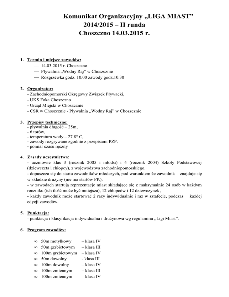 Komunikat Organizacyjny „LIGA MIAST” 2014/2015 – II runda Choszczno 14.03.2015 r. 1. Termin i miejsce zawodów: 14.03.2015 r. Choszczno Pływalnia „Wodny Raj” w Choszcznie Rozgrzewka godz. 10.00 zawody godz.10.30 2. Organizator: - Zachodniopomorski Okręgowy Związek Pływacki, - UKS Foka Choszczno - Urząd Miejski w Choszcznie - CSR w Choszcznie - Pływalnia „Wodny Raj” w Choszcznie 3. Przepisy techniczne: - pływalnia długość – 25m, - 6 torów, - temperatura wody – 27.8° C, - zawody rozgrywane zgodnie z przepisami PZP. - pomiar czasu ręczny 4. Zasady uczestnictwa: - uczniowie klas 3 (rocznik 2005 i młodsi) i 4 (rocznik 2004) Szkoły Podstawowej (dziewczęta i chłopcy), z województwa zachodniopomorskiego. - dopuszcza się do startu zawodników młodszych, pod warunkiem że zawodnik znajduje się w składzie drużyny (nie ma startów PK), - w zawodach startują reprezentacje miast składające się z maksymalnie 24 osób w każdym roczniku (ich ilość może być mniejsza), 12 chłopców i 12 dziewczynek , - każdy zawodnik może startować 2 razy indywidualnie i raz w sztafecie, podczas każdej edycji zawodów. 5. Punktacja: - punktacja i klasyfikacja indywidualna i drużynowa wg regulaminu „Ligi Miast”. 6. Program zawodów: • • • • • • • 50m motylkowy 50m grzbietowym 100m grzbietowym 50m dowolny 100m dowolny 100m zmiennym 100m zmiennym – klasa IV – klasa III – klasa IV - klasa III – klasa IV – klasa III – klasa IV • • 4x 50 m zmiennym 4x 50 m zmiennym – klasa III mieszana( 2 chłopców, 2 dziewczynki) – klasa IV mieszana( 2 chłopców, 2 dziewczynki) 7. Nagrody: medale za miejsca 1-3; dyplomy za miejsca 1-6 we wszystkich konkurencjach indywidualnych oraz dyplomy za miejsca 1-3 w sztafetach. Nagrody po całym cyklu (3 edycjach): Wyróżnienia dla nauczycieli /trenerów/ trzech najlepszych szkół lub miast; Puchary dla zwycięskich miast; Po 3 edycjach zawodnicy sklasyfikowani na miejscach od 1 do 8, w punktacji ogólnej zostaną nagrodzeni; 8. Koszty: - opłata startowa 25 zł od zawodnika – pokrywa szkoła, klub, samorząd z tego ( 5 zł na nagrody indywidualne po całym cyklu ) - opłata startowa płatna na konto GBS Choszczno nr 7683 59 0005 0032 8872 2000 0001 lub bezpośrednio przed zawodami. - pływalnia i opłatę sędziów pokrywa organizator, - koszty udziału dzieci (dojazdy) pokrywają jednostki delegujące, 9. Zgłoszenia Obowiązuje forma elektroniczna- Splash Entry Edytor , do pobrania ze strony www.megatiming.pl oraz www.foka.choszczno.edu.pl zgłoszenia należy przesłać na adres zawody @marlin-gryfino.pl w nieprzekraczalnym terminie do dnia 09.03.2015 r. 10. Postanowienia końcowe W sprawach nie ujętych w regulaminie decyduje Sędzia Główny zawodów w porozumieniu z Naczelnikiem Zawodów. Prawo interpretacji regulaminu przysługuje organizatorowi. Podczas trwania zawodów obowiązuje regulamin wewnętrzny pływalni Organizator nie ponosi odpowiedzialności z tytułu ubezpieczeń zdrowotnych i następstw nieszczęśliwych wypadków. Klucze do szafek w przebieralni pobiera opiekun grupy. Opiekun odpowiedzialny jest za zdanie kluczy oraz za zachowanie zawodników w czasie trwania zawodów oraz porządek w szatniach. Zgłoszenie drużyny jest równoznaczne z akceptacją regulaminu. Wyniki zawodów ogłoszone na www.megatiming.pl po zakończeniu zawodów. Istnieje możliwość wykupienia posiłków bezpośrednio w Restauracja PROMENADA ul. Chrobrego 33, 73-200 Choszczno tel./fax: 95 765 33 00, kom.: 723 968 209, 603-697-027 e-mail: [email protected] (około 50 m od basenu). Organizator zawodów nie pośredniczy w sprawach związanych z zamówieniem posiłków. Naczelnik Zawodów Jacek Klucznik Tel. 504-147-356 po 15.00 lub 502 324 687