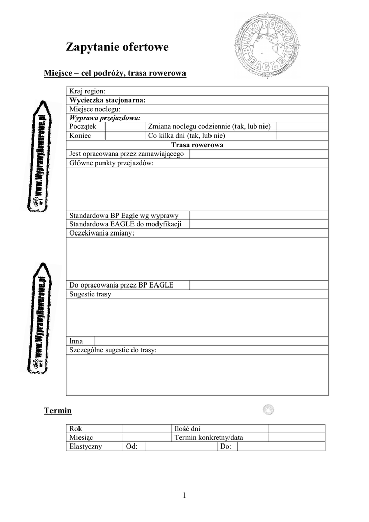 Zapytanie ofertowe Miejsce – cel podróŜy, trasa rowerowa Kraj region: Wycieczka stacjonarna: Miejsce noclegu: Wyprawa przejazdowa: Początek Zmiana noclegu codziennie (tak, lub nie) Koniec Co kilka dni (tak, lub nie) Trasa rowerowa Jest opracowana przez zamawiającego Główne punkty przejazdów: Standardowa BP Eagle wg wyprawy Standardowa EAGLE do modyfikacji Oczekiwania zmiany: Do opracowania przez BP EAGLE Sugestie trasy Inna Szczególne sugestie do trasy: Termin Rok Miesiąc Elastyczny Od: Ilość dni Termin konkretny/data Do: 1 Uczestnicy Liczba Stała Planowana: zmienna Od: Do: Liczba osób w poszczególnych grupach wiekowych: do 11 lat 19 – 30 lat 12 – 15 lat 31 - 50 lat 16 - 18 lat 51 - 70 lat 19 – 30 lat PowyŜej 71 lat Charakter grupy ( klub, firma, szkoła, parafia, rodzina, przyjaciele itp. Program Charakter wycieczki: Krajoznawczy MTB Edukacyjny Szosowy Religijny Trekkingowy Treningowy Downhill Oczekiwania programowe: Wyczynowy Incentive Osoby niepełnosprawne Inny Szczególne punkty programu: Szczególne zainteresowania grupy: Dodatkowe atrakcje: Oczekiwana skala trudności wg BP EAGLE (od 1-5 rowerków) Preferowany rodzaj i tempo jazdy Doświadczenie grupy, wcześniejsze wycieczki 2 osób osób Kadra Uczestnicząca kadra zamawiającego (np. wychowawca, pilot, prezes klubu, ksiądz itp.) Oczekiwana kadra: Pilot Przewodnik (lokalny) Trener Bez kadry (Liczba) MasaŜysta Kierowca Kucharz Inny Transport Miejsce noclegu Transport uczestników (dojazd,odjazd) samolot prom pociąg autobus mikrobus Miejsce zbiórki grupy Miejsce docelowe transportu sam. osobowy bez transportu własny inny Transport rowerów Liczba rowerów Miejsce odbioru rowerów Rowery uczestników Zwrotu rowerów Rowery z wypoŜyczalni EAGLE Liczba Rowery z wypoŜyczalni lokalnej Rodzaj Bez transportu rowerów Wielkość Transport i asekuracja osób na trasie Tylko bagaŜe Bez transportu BagaŜe i okazjonalnie 2/3 osoby Inne BagaŜe i transport całej grupy na niektórych odcinkach Noclegi Hotele Namioty na kempingach Bez noclegów Hostele/hotele turystyczne/gosp. agroturystyczne Bungalowy na kempingach Inne 3 WyŜywienie Śniadania w hotelach/ obiady w restauracjach Śniadania i obiadokolacje z lokalnych produktów przygotowywane przez EAGLE We własnym zakresie Inne Szczególne upodobania kulinarne: Dodatkowe elementy Ubezpieczenie Koszty leczenia 10 000 Euro Odpowiedzialności cywilnej Koszty leczenia wyŜsze – kwota KradzieŜ rowerów Następstw nieszczęśliwych KradzieŜ bagaŜy wypadków Mapy dokładne dla kadry GPS dla kaŜdego Apteczka poglądowe dla kaŜdego Inne Sprzęt turystyczny i rowerowy Kaski Namioty Dętki/zestaw naprawczy Sprzęt kuchenny Klucz uniwersalny Kuchnia gazowa, butla Komplet kluczy Sztućce i talerze profesjonalny jednorazowe Sakwy rowerowe Stół i krzesła Zamknięcie rowerowe Inny sprzęt kuchenny Inne rowerowe Uwagi dodatkowe: Sugestie cenowe Zamawiający ofertę: Imię i nazwisko Mail Telefon kontaktowy Adres Firma, szkoła, klub, inne 4