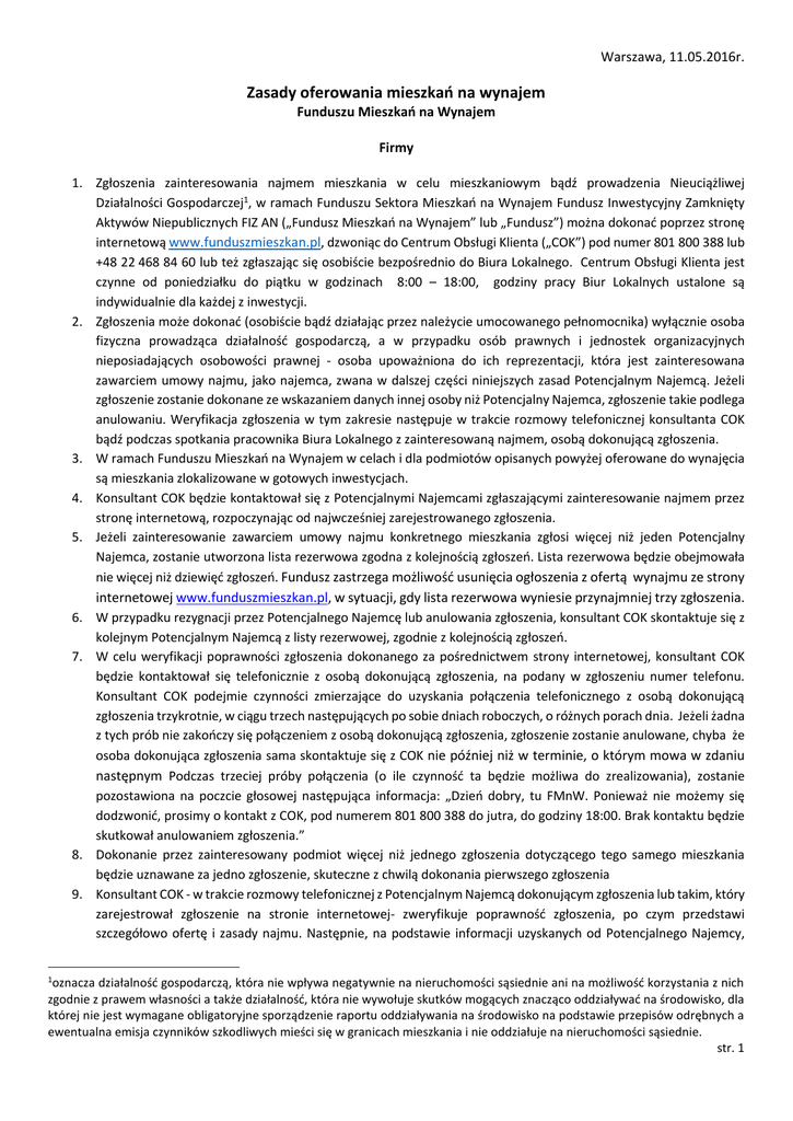 Warszawa, 11.05.2016r. Zasady oferowania mieszkań na wynajem Funduszu Mieszkań na Wynajem Firmy 1. Zgłoszenia zainteresowania najmem mieszkania w celu mieszkaniowym bądź prowadzenia Nieuciążliwej Działalności Gospodarczej1, w ramach Funduszu Sektora Mieszkań na Wynajem Fundusz Inwestycyjny Zamknięty Aktywów Niepublicznych FIZ AN („Fundusz Mieszkań na Wynajem” lub „Fundusz”) można dokonać poprzez stronę internetową www.funduszmieszkan.pl, dzwoniąc do Centrum Obsługi Klienta („COK”) pod numer 801 800 388 lub +48 22 468 84 60 lub też zgłaszając się osobiście bezpośrednio do Biura Lokalnego. Centrum Obsługi Klienta jest czynne od poniedziałku do piątku w godzinach 8:00 – 18:00, godziny pracy Biur Lokalnych ustalone są indywidualnie dla każdej z inwestycji. 2. Zgłoszenia może dokonać (osobiście bądź działając przez należycie umocowanego pełnomocnika) wyłącznie osoba fizyczna prowadząca działalność gospodarczą, a w przypadku osób prawnych i jednostek organizacyjnych nieposiadających osobowości prawnej - osoba upoważniona do ich reprezentacji, która jest zainteresowana zawarciem umowy najmu, jako najemca, zwana w dalszej części niniejszych zasad Potencjalnym Najemcą. Jeżeli zgłoszenie zostanie dokonane ze wskazaniem danych innej osoby niż Potencjalny Najemca, zgłoszenie takie podlega anulowaniu. Weryfikacja zgłoszenia w tym zakresie następuje w trakcie rozmowy telefonicznej konsultanta COK bądź podczas spotkania pracownika Biura Lokalnego z zainteresowaną najmem, osobą dokonującą zgłoszenia. 3. W ramach Funduszu Mieszkań na Wynajem w celach i dla podmiotów opisanych powyżej oferowane do wynajęcia są mieszkania zlokalizowane w gotowych inwestycjach. 4. Konsultant COK będzie kontaktował się z Potencjalnymi Najemcami zgłaszającymi zainteresowanie najmem przez stronę internetową, rozpoczynając od najwcześniej zarejestrowanego zgłoszenia. 5. Jeżeli zainteresowanie zawarciem umowy najmu konkretnego mieszkania zgłosi więcej niż jeden Potencjalny Najemca, zostanie utworzona lista rezerwowa zgodna z kolejnością zgłoszeń. Lista rezerwowa będzie obejmowała nie więcej niż dziewięć zgłoszeń. Fundusz zastrzega możliwość usunięcia ogłoszenia z ofertą wynajmu ze strony internetowej www.funduszmieszkan.pl, w sytuacji, gdy lista rezerwowa wyniesie przynajmniej trzy zgłoszenia. 6. W przypadku rezygnacji przez Potencjalnego Najemcę lub anulowania zgłoszenia, konsultant COK skontaktuje się z kolejnym Potencjalnym Najemcą z listy rezerwowej, zgodnie z kolejnością zgłoszeń. 7. W celu weryfikacji poprawności zgłoszenia dokonanego za pośrednictwem strony internetowej, konsultant COK będzie kontaktował się telefonicznie z osobą dokonującą zgłoszenia, na podany w zgłoszeniu numer telefonu. Konsultant COK podejmie czynności zmierzające do uzyskania połączenia telefonicznego z osobą dokonującą zgłoszenia trzykrotnie, w ciągu trzech następujących po sobie dniach roboczych, o różnych porach dnia. Jeżeli żadna z tych prób nie zakończy się połączeniem z osobą dokonującą zgłoszenia, zgłoszenie zostanie anulowane, chyba że osoba dokonująca zgłoszenia sama skontaktuje się z COK nie później niż w terminie, o którym mowa w zdaniu następnym Podczas trzeciej próby połączenia (o ile czynność ta będzie możliwa do zrealizowania), zostanie pozostawiona na poczcie głosowej następująca informacja: „Dzień dobry, tu FMnW. Ponieważ nie możemy się dodzwonić, prosimy o kontakt z COK, pod numerem 801 800 388 do jutra, do godziny 18:00. Brak kontaktu będzie skutkował anulowaniem zgłoszenia.” 8. Dokonanie przez zainteresowany podmiot więcej niż jednego zgłoszenia dotyczącego tego samego mieszkania będzie uznawane za jedno zgłoszenie, skuteczne z chwilą dokonania pierwszego zgłoszenia 9. Konsultant COK - w trakcie rozmowy telefonicznej z Potencjalnym Najemcą dokonującym zgłoszenia lub takim, który zarejestrował zgłoszenie na stronie internetowej- zweryfikuje poprawność zgłoszenia, po czym przedstawi szczegółowo ofertę i zasady najmu. Następnie, na podstawie informacji uzyskanych od Potencjalnego Najemcy, 1 oznacza działalność gospodarczą, która nie wpływa negatywnie na nieruchomości sąsiednie ani na możliwość korzystania z nich zgodnie z prawem własności a także działalność, która nie wywołuje skutków mogących znacząco oddziaływać na środowisko, dla której nie jest wymagane obligatoryjne sporządzenie raportu oddziaływania na środowisko na podstawie przepisów odrębnych a ewentualna emisja czynników szkodliwych mieści się w granicach mieszkania i nie oddziałuje na nieruchomości sąsiednie. str. 1 10. 11. 12. 13. 14. 15. 16. 17. konsultant COK dokona wstępnej oceny spełnienia przez Potencjalnego Najemcę warunków umożliwiających zawarcie umowy najmu. W szczególności ocenie podlegać będzie zdolność do regulowania zobowiązań wynikających z umowy najmu, w zakresie możliwości poniesienia przez Potencjalnego Najemcę kosztów związanych z zawarciem przedmiotowej umowy (w tym kosztów notarialnych, wpłaty wymaganej kaucji, kosztów ubezpieczenia przedmiotu najmu) jak i z jej wykonywaniem. Jeżeli po dokonaniu weryfikacji poprawności zgłoszenia Potencjalny Najemca nie będzie mógł kontynuować rozmowy z konsultantem COK, zostanie uzgodniony odpowiedni dla zgłaszającego termin kolejnej rozmowy wówczas zastosowanie będą miały zasady określone w pkt 7. W przypadku pozytywnej weryfikacji Potencjalnego Najemcy, o której mowa w pkt 9 powyżej na jego rzecz zostaje dokonana wstępna rezerwacja mieszkania. Najemca jednocześnie zostanie poinformowany czy w danym momencie, po spełnieniu przesłanek określonych poniżej, możliwe jest zawarcie umowy najmu lokalu mieszkalnego czy niezbędne będzie wpierw podpisanie umowy rezerwacyjnej tego lokalu. Potencjalny Najemca posiadający wstępną