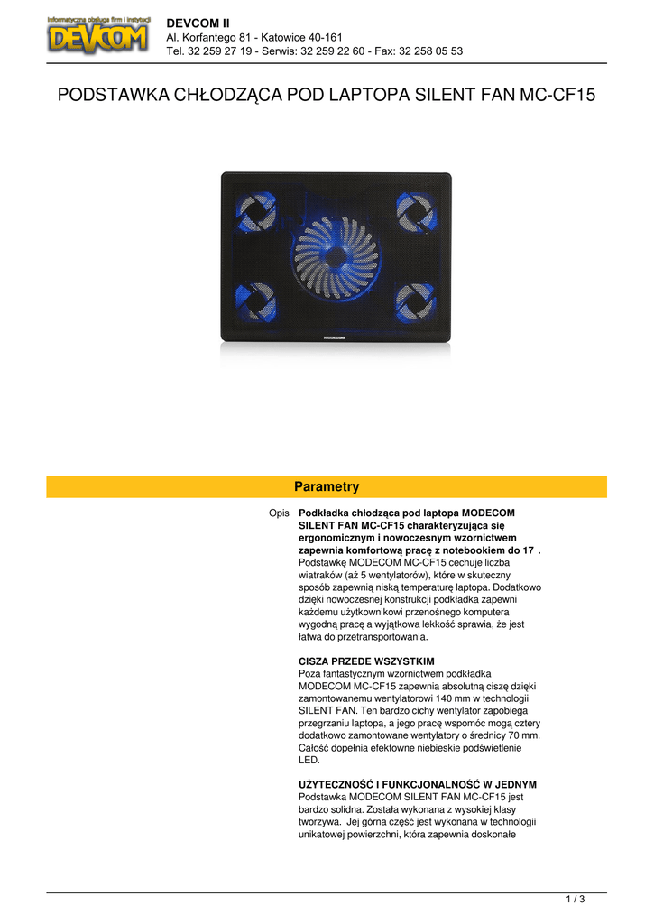 DEVCOM II Al. Korfantego 81 - Katowice 40-161 Tel. 32 259 27 19 - Serwis: 32 259 22 60 - Fax: 32 258 05 53 PODSTAWKA CHŁODZĄCA POD LAPTOPA SILENT FAN MC-CF15 Parametry Opis Podkładka chłodząca pod laptopa MODECOM SILENT FAN MC-CF15 charakteryzująca się ergonomicznym i nowoczesnym wzornictwem zapewnia komfortową pracę z notebookiem do 17”. Podstawkę MODECOM MC-CF15 cechuje liczba wiatraków (aż 5 wentylatorów), które w skuteczny sposób zapewnią niską temperaturę laptopa. Dodatkowo dzięki nowoczesnej konstrukcji podkładka zapewni każdemu użytkownikowi przenośnego komputera wygodną pracę a wyjątkowa lekkość sprawia, że jest łatwa do przetransportowania. CISZA PRZEDE WSZYSTKIM Poza fantastycznym wzornictwem podkładka MODECOM MC-CF15 zapewnia absolutną ciszę dzięki zamontowanemu wentylatorowi 140 mm w technologii SILENT FAN. Ten bardzo cichy wentylator zapobiega przegrzaniu laptopa, a jego pracę wspomóc mogą cztery dodatkowo zamontowane wentylatory o średnicy 70 mm. Całość dopełnia efektowne niebieskie podświetlenie LED. UŻYTECZNOŚĆ I FUNKCJONALNOŚĆ W JEDNYM Podstawka MODECOM SILENT FAN MC-CF15 jest bardzo solidna. Została wykonana z wysokiej klasy tworzywa. Jej górna część jest wykonana w technologii unikatowej powierzchni, która zapewnia doskonałe 1/3 DEVCOM II Al. Korfantego 81 - Katowice 40-161 Tel. 32 259 27 19 - Serwis: 32 259 22 60 - Fax: 32 258 05 53 odprowadzenie ciepła emitowanego przez rozgrzany laptop. Podkładka zaprojektowana została z myślą o najwyższym komforcie użytkowania. W modelu tym zastosowana szereg rozwiązań technologicznych, dzięki którym praca z komputerem przenośnym to czysta przyjemność. Na szczególną uwagę zasługują dwie składane nóżki, które umożliwiają zmianę poziomu kąta nachylenia stolika. Z kolei, umieszczony na jednym z boków podwójny port USB (HUB USB), umożliwia komfortowe podłączenie do laptopa, bez konieczności blokowania portu USB. Dodatkowo, w celu zwiększenia stabilności podkładki, w spodniej jej części zostały umieszczone, cztery gumowane antypoślizgowe podkładki. Bardzo lekka waga oraz kompaktowy design, sprawiają, że MODECOM SILENT FAN MC-CF15 jest produktem bardzo wygodnym w transporcie. NAJWAŻNIEJSZE CECHY PRODUKTU: - Unikatowa powierzchnia zapewniająca maksymalne chłodzenie - Jeden bardzo cichy wentylator 140mm - Cztery dodatkowe wentylatory 70mm - Możliwość uruchomienia jednego, czterech lub pięciu wentylatorów - Podświetlane wentylatory - Nowoczesna budowa pozwala na zmianę kąta nachylenia - Antypoślizgowe gumowe podkładki - Dwa złącza USB Przekątna ekranu Chłodzenie Wentylator Wentylator Liczba wentylatorów 17'' Tak 7 cm 14 cm 5 Przepływ powietrza 56 Regulacja obrotów Nie Głośność 21 Hub USB 2 porty Materiał Tworzywo sztuczne USB 5V Kolor Czarny Wymiary 390 x 290 x 25 mm. Waga 700 Pozostałe parametry WENTYLATOR 140mm: - Napięcie znamionowe 5VDC - Prąd znamionowy 0,15 +/- 0,02A - Prędkość obrotowa 1000 +/- 100RPM - Łożyskowanie Hydrodynamiczne WENTYLATOR 70mm: - Napięcie znamionowe 5VDC - Prąd znamionowy 0,08 +/- 0,02A - Prędkość obrotowa 1800 +/- 100RPM 2/3 DEVCOM II Al. Korfantego 81 - Katowice 40-161 Tel. 32 259 27 19 - Serwis: 32 259 22 60 - Fax: 32 258 05 53 - Łożyskowanie Hydrodynamiczne 3/3 Powered by TCPDF (www.tcpdf.org)