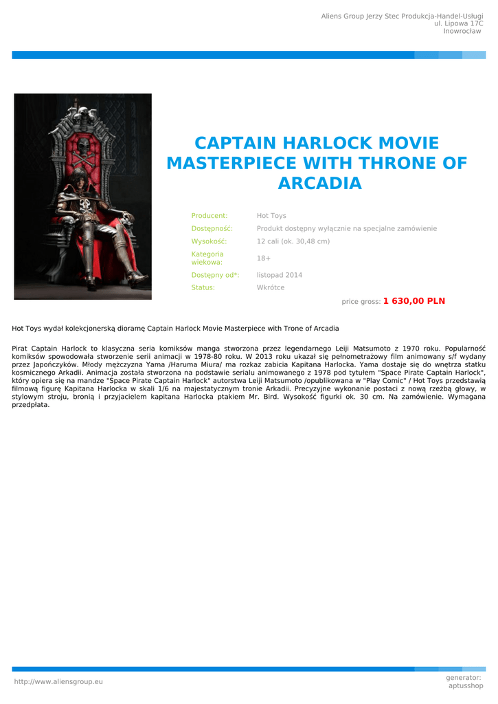 Aliens Group Jerzy Stec Produkcja-Handel-Usługi ul. Lipowa 17C Inowrocław CAPTAIN HARLOCK MOVIE MASTERPIECE WITH THRONE OF ARCADIA Producent: Hot Toys Dostępność: Produkt dostępny wyłącznie na specjalne zamówienie Wysokość: 12 cali (ok. 30,48 cm) Kategoria wiekowa: 18+ Dostępny od*: listopad 2014 Status: Wkrótce price gross: 1 630,00 PLN Hot Toys wydał kolekcjonerską dioramę Captain Harlock Movie Masterpiece with Trone of Arcadia Pirat Captain Harlock to klasyczna seria komiksów manga stworzona przez legendarnego Leiji Matsumoto z 1970 roku. Popularność komiksów spowodowała stworzenie serii animacji w 1978-80 roku. W 2013 roku ukazał się pełnometrażowy film animowany s/f wydany przez Japończyków. Młody mężczyzna Yama /Haruma Miura/ ma rozkaz zabicia Kapitana Harlocka. Yama dostaje się do wnętrza statku kosmicznego Arkadii. Animacja została stworzona na podstawie serialu animowanego z 1978 pod tytułem "Space Pirate Captain Harlock", który opiera się na mandze "Space Pirate Captain Harlock" autorstwa Leiji Matsumoto /opublikowana w "Play Comic" / Hot Toys przedstawią filmową figurę Kapitana Harlocka w skali 1/6 na majestatycznym tronie Arkadii. Precyzyjne wykonanie postaci z nową rzeżbą głowy, w stylowym stroju, bronią i przyjacielem kapitana Harlocka ptakiem Mr. Bird. Wysokość figurki ok. 30 cm. Na zamówienie. Wymagana przedpłata. http://www.aliensgroup.eu generator: aptusshop