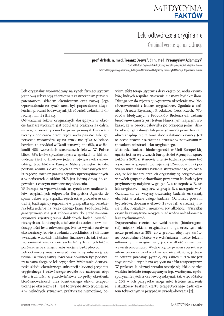 Leki odtwórcze a oryginalne Original versus generic drugs prof. dr hab. n. med. Tomasz Drewa1, dr n. med. Przemysław Adamczyk2 1 2 Lek oryginalny wprowadzany na rynek farmaceutyczny jest nową substancją chemiczną z zastrzeżonym prawem patentowym, składem chemicznym oraz nazwą. Jego wprowadzenie na rynek musi być poprzedzone długoletnimi pracami badawczymi, jak również badaniami klinicznymi I, II i III fazy. Odtwarzanie leków oryginalnych dostępnych w obrocie farmaceutycznym jest popularną praktyką na całym świecie, stosowaną szeroko przez przemysł farmaceutyczny i popieraną przez rządy wielu państw. Leki generyczne wprowadza się na rynek nie tylko w Polsce, bowiem na przykład w Danii stanowią one 65%, a w Holandii 48% wszystkich stosowanych leków. W Polsce blisko 65% leków sprzedawanych w aptekach to leki odtwórcze i jest to kwotowo jeden z największych rynków takiego typu leków w Europie. Należy pamiętać, że taka polityka wynika z określonych założeń finansowych wielu rządów, również państw wysoko uprzemysłowionych, a w państwach o niskim PKB jest jedyną drogą do zapewnienia chorym nowoczesnego leczenia. W Europie za wprowadzenie na rynek zamienników leków oryginalnych odpowiada Europejska Agencja do spraw Leków w przypadku rejestracji w procedurze centralnej bądź agendy regionalne w przypadku wprowadzenia leku jedynie na rynek danego kraju. Producent leku generycznego nie jest zobowiązany do przedstawienia organowi rejestrującemu dokładnych badań przedklinicznych ani klinicznych, a jedynie do ustalenia tzw. biodostępności leku odtwórczego. Ma to wymiar zarówno ekonomiczny, bowiem badania przedkliniczne i kliniczne wymagają wysokich nakładów finansowych, jak i etyczny, ponieważ nie ponawia się badań tych samych leków, porównując je z innymi substancjami bądź placebo. Lek odtwórczy musi zawierać taką samą substancję aktywną i w takiej samej ilości oraz powinien być podawany tą samą drogą co lek oryginalny. Wykazanie identyczności składu chemicznego substancji aktywnej preparatu oryginalnego i odtwórczego zwykle nie nastręcza zbyt wielu trudności, w przeciwieństwie do próby określenia biorównoważności oraz identycznego efektu terapeutycznego obu leków [1]. Jest to zwykle dużo trudniejsze, a w niektórych sytuacjach praktycznie niemożliwe, boReprint z Vol. 7/Nr 4(25)/2014 Oddział Urologii Ogólnej i Onkologicznej, Specjalistyczny Szpital Miejski w Toruniu Katedra Medycyny Regeneracyjnej, Collegium Medicum w Bydgoszczy, Uniwersytet Mikołaja Kopernika w Toruniu wiem efekt terapeutyczny zależy często od wielu czynników, których wspólne znaczenie nie może być określone. Dlatego też do rejestracji wystarcza określenie tzw. biorównoważności z lekiem oryginalnym. Zgodnie z definicją Urzędu Rejestracji Produktów Leczniczych, Wyrobów Medycznych i Produktów Biobójczych badanie biorównoważności jest testem klinicznym mającym wykazać, że w osoczu człowieka po przyjęciu jednej dawki leku (oryginalnego lub generycznego) przez ten sam okres znajduje się ta sama ilość substancji czynnej. Jest to ocena znacznie skrócona i prostsza w porównaniu ze sposobem rejestracji leku oryginalnego. Metodyka badania biodostępności w Unii Europejskiej oparta jest na wytycznych Europejskiej Agencji do spraw Leków z 2001 r. Stanowią one, że badanie powinno być wykonane w grupach (co najmniej 12-osobowych) i powinno mieć charakter badania skrzyżowanego, co oznacza, że lek badany oraz lek oryginalny są przyjmowane w dwóch grupach ochotników, przy czym lek badany jest przyjmowany najpierw w grupie A, a następnie w B, zaś lek oryginalny – najpierw w grupie B, a następnie w A. Oznacza to, że wszyscy uczestnicy badania otrzymają oba leki w trakcie całego badania. Ochotnicy powinni być zdrowi, dobrani wiekowo (18–55 lat), o średniej masie ciała, niepalący i nieużywający alkoholu. Wszystkie czynniki zewnętrzne mogące mieć wpływ na badanie należy wyeliminować. Dopuszczalna różnica we wchłanianiu (biodostępności) między lekiem oryginalnym a generycznym nie może przekroczyć 20%, co z grubsza obejmuje zarówno potencjalne różnice we wchłanianiu między lekiem odtwórczym i oryginalnym, jak i wielkość zmienności wewnątrzosobniczej. Wydaje się, że pewien rozrzut wyników porównania obu leków jest nieunikniony, jednakże otwarte pozostaje pytanie, czy zakres ± 20% nie jest zbyt szeroki i czy nie ma wpływu na efekt terapeutyczny. W praktyce klinicznej szeroko stosuje się leki o bardzo wąskim indeksie terapeutycznym (np. warfaryna, cyklosporyna, fenytoina czy lewotyroksyna), tak więc różnice ± 20% w ich przypadku mogą mieć istotne znaczenie i skutkować brakiem efektu terapeutycznego bądź efektem toksycznym w przypadku przedawkowania [2]. Copyright © Medical Education. Wszelkie prawa zastrzeżone. Redakcja nie ponosi odpowiedzialności za treść reklam i ogłoszeń. 2 Leki odtwórcze a oryginalne T. Drewa, P. Adamczyk Biodostępność leku oryginalnego i odtwórczego może być różna także z powodu rodzaju substancji pomocniczych zastosowanych w obu lekach. Substancje te z zasady nie mogą zmieniać efektu biologicznego leku, gdyż są jedynie nośnikiem, za pomocą którego lek dociera do tkanek docelowych. Mogą one wpływać na trwałość substancji czynnej oraz na miejsce i długość czasu wchłaniania. Dlatego też z powodu obecności określonych substancji pomocniczych wpływ identycznej substancji w leku oryginalnym i odtwórczym na organizm może być zgoła różny. Warto również zauważyć, że producenci leków generycznych uciekają się do różnego typu modyfikacji substancji czynnej, dzięki czemu mogą na przykład uzyskać jej większą stabilność czy też wchłanialność. Znaczenie może mieć również optymalizacja opłacalności, bowiem forma niektórych związków chemicznych wpływa na koszt ich syntezy. Właś