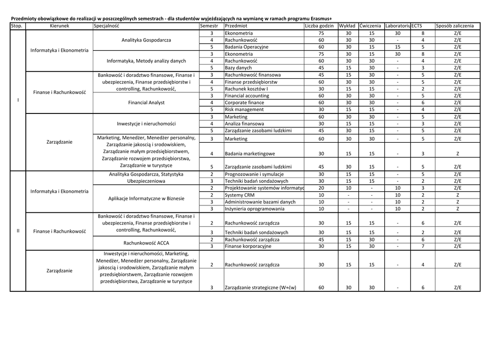 Przedmioty obowiązkowe do realizacji w poszczególnych semestrach - dla studentów wyjeżdzających na wymianę w ramach programu Erasmus+ Stop. Kierunek Specjalność Semestr Przedmiot Liczba godzin 3 Ekonometria 75 Analityka Gospodarcza 4 Rachunkowość 60 5 Badania Operacyjne 60 Informatyka i Ekonometria 3 Ekonometria 75 Informatyka, Metody analizy danych 4 Rachunkowość 60 5 Bazy danych 45 3 Rachunkowość finansowa 45 Bankowość i doradztwo finansowe, Finanse i 4 Finanse przedsiębiorstw 60 ubezpieczenia, Finanse przedsiębiorstw i 5 Rachunek kosztów I 30 controlling, Rachunkowość, Finanse i Rachunkowość 3 Financial accounting 60 I Financial Analyst 4 Corporate finance 60 5 Risk management 30 3 Marketing 60 Inwestycje i nieruchomości 4 Analiza finansowa 30 5 Zarządzanie zasobami ludzkimi 45 Marketing, Menedżer, Menedżer personalny, 3 Marketing 60 Zarządzanie Zarządzanie jakoscią i srodowiskiem, Zarządzanie małym przedsiębiorstwem, 4 Badania marketingowe 30 Zarządzanie rozwojem przedsiębiorstwa, Zarządzanie w turystyce 5 Zarządzanie zasobami ludzkimi 45 Analityka Gospodarcza, Statystyka Ubezpieczeniowa Informatyka i Ekonometria Aplikacje Informatyczne w Biznesie II Finanse i Rachunkowość Bankowość i doradztwo finansowe, Finanse i ubezpieczenia, Finanse przedsiębiorstw i controlling, Rachunkowość, Rachunkowość ACCA Zarządzanie Inwestycje i nieruchomości, Marketing, Menedżer, Menedżer personalny, Zarządzanie jakoscią i srodowiskiem, Zarządzanie małym przedsiębiorstwem, Zarządzanie rozwojem przedsiębiorstwa, Zarządzanie w turystyce Wykład Ćwiczenia Laboratorium ECTS 30 15 30 8 30 30 4 30 15 15 5 30 15 30 8 30 30 4 15 30 3 15 30 5 30 30 5 15 15 2 30 30 5 30 30 6 15 15 4 30 30 5 15 15 3 30 15 5 Sposób zaliczenia Z/E Z/E Z/E Z/E Z/E Z/E Z/E Z/E Z/E Z/E Z/E Z/E Z/E Z/E Z/E 30 30 - 5 Z/E 15 15 - 3 Z 2 3 2 2 3 3 Prognozowanie i symulacje Techniki badań sondażowych Projektowanie systemów informatycznych Systemy CRM Administrowanie bazami danych Inżynieria oprogramowania 30 30 20 10 10 10 30 15 15 10 - 15 15 15 - 10 10 10 10 5 5 2 3 2 2 2 Z/E Z/E Z/E Z/E Z Z Z 2 Rachunkowość zarządcza 30 15 15 - 6 Z/E 3 2 3 Techniki badań sondażowych Rachunkowość zarządcza Finanse korporacyjne 30 45 30 15 15 15 15 30 30 - 2 6 7 Z/E Z/E Z/E 2 Rachunkowość zarządcza 30 15 15 - 4 Z/E 3 Zarządzanie strategiczne (W+ćw) 60 30 30 - 6 Z/E