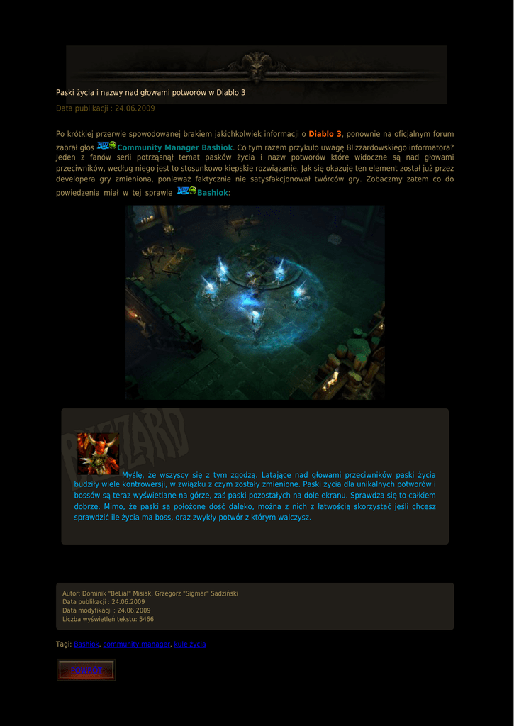 Paski życia i nazwy nad głowami potworów w Diablo 3 Data publikacji : 24.06.2009 Po krótkiej przerwie spowodowanej brakiem jakichkolwiek informacji o Diablo 3, ponownie na oficjalnym forum zabrał głos Community Manager Bashiok. Co tym razem przykuło uwagę Blizzardowskiego informatora? Jeden z fanów serii potrząsnął temat pasków życia i nazw potworów które widoczne są nad głowami przeciwników, według niego jest to stosunkowo kiepskie rozwiązanie. Jak się okazuje ten element został już przez developera gry zmieniona, ponieważ faktycznie nie satysfakcjonował twórców gry. Zobaczmy zatem co do powiedzenia miał w tej sprawie Bashiok: Myślę, że wszyscy się z tym zgodzą. Latające nad głowami przeciwników paski życia budziły wiele kontrowersji, w związku z czym zostały zmienione. Paski życia dla unikalnych potworów i bossów są teraz wyświetlane na górze, zaś paski pozostałych na dole ekranu. Sprawdza się to całkiem dobrze. Mimo, że paski są położone dość daleko, można z nich z łatwością skorzystać jeśli chcesz sprawdzić ile życia ma boss, oraz zwykły potwór z którym walczysz. Autor: Dominik "BeLial" Misiak, Grzegorz "Sigmar" Sadziński Data publikacji : 24.06.2009 Data modyfikacji : 24.06.2009 Liczba wyświetleń tekstu: 5466 Tagi: Bashiok, community manager, kule życia POWRÓT DRUKUJ PDF POLEĆ ZNAJOMEMU Komentarz (13) dodaj komentarz Blizzard zawsze przywiązuje wagę nawet do takich drobnostek i właśnie dlatego gry Blizzarda są tak dobre. Szczerze w Diablo 2 te paski nie były dla mnie jakimś utrudnieniem, jednak ich nowy system wyświetlania w Diablo 3 prezentował się na gameplayu całkiem nieźle i myślę, że polepszy on komfort gry.~Masuo 2009/06/24 10:20 Masuo: Właśnie mowa jest o tym że system z gameplay'a został zmieniony i bardziej upodobniony do tego z d2, choć nie do końca~Met 2009/06/24 15:23 Hmm Chodziło mi o paski życia bossów, nie przyglądałem się paskom zwykłych potworów. Na gameplayu ostatni boss ma pasek na górze ekranu, tak jak to mówi Bashiok. Rozumiem, więc, że w stosunku do gameplayu zmieniły się paski życia normalnych potworów.~Masuo 2009/06/24 16:18 Tak, paski życia potworów zwykłych są teraz zamieszczone na dole interfejsu. Natomiast paski bossów są tam gdzie były (najprawdopodobniej)~BeLial BattleNet Network 2009/06/24 16:28 Paski życia nad głowami potworów były jedną z pierwszych rzeczy na jakie zwróciłem uwagę podczas oglądania pierwszego gameplaya. W zasadzie nie obchodziło mnie to za bardzo, ale i tak wydaje mi się że aktualne rozwiązanie jest jednak lepsze. Tylko po co różnicować miejsce pojawiania się paska zwykłego potwora i bossa? Nie lepiej dać wszystko w jedno miejsce, tak jak w Diablo 2 a pasek jakiegoś ważnego potwora zrobić ew. większy albo w innym kolorze (np. złotym). Wydaje mi się, że takie skaczące z góry na dół napisy nie są najlepszym, rozwiązaniem (ale i tak są niezłym).~konq 2009/06/24 17:41 Pasek stanu życia na górze ekranu dla silniejszych potworów to dobry pomysł, ponieważ silniejsze jednostki będą wyróżnione, ten pasek również będzie lepiej widoczny. Gracz będzie lepiej uświadomiony, że walczy z silniejszą jednostką.~fan diablo 3 2009/06/24 19:34 Taa, podobnego zdania jestem. Wyróżniony pasek życia dla bossów to świetny pomysł. Wiadome że po samym wyglądzie możemy wywnioskować że walczymy z bossem, jednak już na gameplayu było pokazane jak fajnie wygląda paseczek z życiem bossów, dobrze że to akurat zostawili. Widać że starają się dopieścić Diablo 3 na maxa :)~BeLial BattleNet Network 2009/06/24 22:41 normalnei skandal , wlasnie dostalem bana na konto w d2 a nie urzywalem niczego nielegalnego , zwykal czysta zainstalowana gra....... i pewnie nie moge sie do nikogo z tym odwolac ? nic to pewnie nie da... widac blizzard juz pracuje nad tym zeby powywalac jak najwiecej ludzi z d2 tak zeby na d3 byli chetni gracze ..... :/~tess 2009/06/25 02:14 jasssne... Blizz nie banuje za nic, może masz jakiegoś map hacka...~MHT 2009/06/25 08:41 niemam i nigdy nie urzywalem hakow , botow , loaderow.... nic~tess 2009/06/25 12:57 może się pomylili - napisz do nich - może sprawdzą. Spróbować można~kollr 2009/06/25 13:10 tess- blizz nie musi sie posuwac do czegos takiego bo jak wyjdzie diablo III i bedzie dobre to wiekszosc graczy D2 sie przezuci na D3 a po jakims czasie juz nikt w D2 nie bedzie gral bo blizz nie bedzie wspierał juz gry, normalna kolej rzeczy, a ty tu wysnuwasz jakies smieszne teorie spiskowe^^ a co do twojego konta to moze zrobiles jakis przekret tylko sie niechcesz przyznac, bo skoro nic nie zrobiles to czemu nie napiszesz do nich?. Moze jestes czysty i poprostu sie pomylili a to sie im zdarza bo ja miałem zablokowana postać rzekomo za uzywanie programu podnoszacego automatycznie przedmioty... po 3 dniach zwrocili mi postac z ładnymi przeprosinami:)~Danon666 2009/06/25 15:58 (wybacznie ale nie moge sie powstrzymac^^) tess, zapomnialeś dodać że nigdy nie "uRZywałeś" słownika...~z nudów... 2009/06/25 19:46 dodaj komentarz