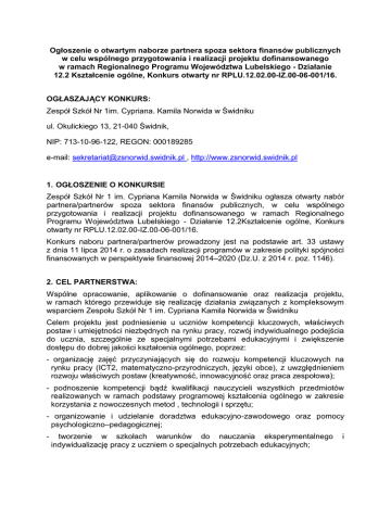 Ogłoszenie o otwartym naborze partnera spoza sektora finansów publicznych w celu wspólnego przygotowania i realizacji projektu dofinansowanego w ramach Regionalnego Programu Województwa Lubelskiego - Działanie 12.2 Kształcenie ogólne, Konkurs otwarty nr RPLU.12.02.00-IZ.00-06-001/16. OGŁASZAJĄCY KONKURS: Zespół Szkół Nr 1im. Cypriana. Kamila Norwida w Świdniku ul. Okulickiego 13, 21-040 Świdnik, NIP: 713-10-96-122, REGON: 000189285 e-mail: [email protected] , http://www.zsnorwid.swidnik.pl 1. OGŁOSZENIE O KONKURSIE Zespół Szkół Nr 1 im. Cypriana Kamila Norwida w Świdniku ogłasza otwarty nabór partnera/partnerów spoza sektora finansów publicznych, w celu wspólnego przygotowania i realizacji projektu dofinansowanego w ramach Regionalnego Programu Województwa Lubelskiego - Działanie 12.2Kształcenie ogólne, Konkurs otwarty nr RPLU.12.02.00-IZ.00-06-001/16. Konkurs naboru partnera/partnerów prowadzony jest na podstawie art. 33 ustawy z dnia 11 lipca 2014 r. o zasadach realizacji programów w zakresie polityki spójności finansowanych w perspektywie finansowej 2014–2020 (Dz.U. z 2014 r. poz. 1146). 2. CEL PARTNERSTWA: Wspólne opracowanie, aplikowanie o dofinansowanie oraz realizacja projektu, w ramach którego przewiduje się realizację działania związanych z kompleksowym wsparciem Zespołu Szkół Nr 1 im. Cypriana Kamila Norwida w Świdniku Celem projektu jest podniesienie u uczniów kompetencji kluczowych, właściwych postaw i umiejętności niezbędnych na rynku pracy, rozwój indywidualnego podejścia do ucznia, szczególnie ze specjalnymi potrzebami edukacyjnymi i zwiększenie dostępu do dobrej jakości kształcenia ogólnego, poprzez: - organizację zajęć przyczyniających się do rozwoju kompetencji kluczowych na rynku pracy (ICT2, matematyczno-przyrodniczych, języki obce), z uwzględnieniem rozwoju właściwych postaw (kreatywność, innowacyjność oraz praca zespołowa); - podnoszenie kompetencji bądź kwalifikacji nauczycieli wszystkich przedmiotów realizowanych w ramach podstawy programowej kształcenia ogólnego w zakresie korzystania z nowoczesnych metod , technologii i sprzętu; - organizowanie i udzielanie doradztwa edukacyjno-zawodowego oraz pomocy psychologiczno–pedagogicznej; - tworzenie w szkołach warunków do nauczania eksperymentalnego indywidualizację pracy z uczniem o specjalnych potrzebach edukacyjnych; i Podniesienie jakości usług edukacyjnych związane jest z zapewnieniem dzieciom i młodzieży, w tym w szczególności dzieciom i młodzieży niepełnosprawnym, warunków kształcenia odpowiednio do rozpoznanych indywidualnych potrzeb rozwojowych i edukacyjnych oraz ich możliwości psychofizycznych, zgodnie z obowiązującymi przepisami prawa. Szczegółowe informacje o Działaniu 12.2 dostępne są w dokumentach dotyczących konkursu nr RPLU.12.02.00-IZ.00-06-001/16, ogłoszonego w ramach Regionalnego Programu Województwa Lubelskiego na lata 2014-2020, publikowanych na stronie internetowej: http://rpo.lubelskie.pl/nabor-236-12_2_ksztalcenie_ogolne.html 3. WYMAGANIA / OCZEKIWANIA W STOSUNKU DO PARTNERA Działalność potencjalnego partnera musi być zgodna z celami partnerstwa; Partner zadeklaruje wniesienie wkładu w realizację zadań i celu partnerstwa w postaci know–how, zasobów ludzkich, zasobów organizacyjnych i technicznych lub finansowych, którymi dysponuje w celu realizacji zadań / działań w projekcie. Partner musi posiadać udokumentowane doświadczenie w pozyskiwaniu i należytej realizacji projektów współfinansowanych ze środków Unii Europejskiej w ramach Europejskiego Funduszu Społecznego lub innych środków publicznych, realizowanych jako beneficjent (wnioskodawca) lub partner, we współpracy ze szkołami / placówkami oświatowymi prowadzącymi kształcenie w oparciu o podstawę programową kształcenia ogólnego i/lub ich organami prowadzącymi, w zakresie zbieżnym z celami projektu; Bardzo dobra znajomość zagadnień z zakresu: Wytycznych w zakresie realizacji przedsięwzięć z udziałem środków Europejskiego Funduszu Społecznego w obszarze edukacji na lata 2014-2020 oraz Wytycznych w zakresie kwalifikowalności wydatków w ramach Europejskiego Funduszu Rozwoju Regionalnego, Europejskiego Funduszu Społecznego oraz Funduszu Spójności na lata 2014-2020 oraz innych kluczowych zagadnień związanych z realizacją projektów/działań o przedmiotowym zakresie. 4. KRYTERIA WYBORU PARTNERA Kryteria dostępu: Do postępowania i oceny ofert zostaną zakwalifikowane wyłącznie podmioty, które łącznie spełniają następujące wymagania: 1. Prowadzona działalności potencjalnego partnera jest zgodna z zakresem i celami partnerstwa. 2. Podmiot nie zalega z opłaceniem składek wobec Zakładu Ubezpieczeń Społecznychlub Kasy Rolniczego Ubezpieczenia Społecznego. 3. Podmiot nie zalega z opłaceniem podatków i opłat wobec Urzędu Skarbowego. 4. Podmiot nie podlega wykluczeniu z ubiegania się o dofinansowanie na podstawie m.in.: 1) art. 207 ust. 4 ustawy z 21.06.2013 r. o finansach publicznych (Dz.U. z 2013 r. poz. 885); 2) art. 12 ust. 1 pkt 1 ustawy z dnia 15 czerwca 2012 r. o skutkach powierzania wykonywania pracy cudzoziemcom przebywającym wbrew przepisom na terytorium Rzeczypospolitej Polskiej (Dz. U. 2012 r. poz. 769); 3) art. 9 ust. 1 pkt 2a ustawy z dnia 28 października 2002 r. o odpowiedzialności podmiotów zbiorowych za czyny zabronione pod groźbą kary (t.j. Dz. U. 2012 r. poz. 768 z późn. zm.). 5. Podmiot posiada przynajmniej 3 (trzy)-letnie udokumentowane doświadczenie w pozyskiwaniu i należytej realizacji projektów współfinansowanych ze środków Unii Europejskiej w ramach Europejskiego Funduszu Społecznego lub innych środków publicznych, realizowanych jako beneficjent (wnioskodawca) lub partner, we współpracy z szkołami / placówkami oświatowymi prowadzącymi kształcenie w oparciu o podstawę programową kształcenia ogólnego i/lub ich organami p