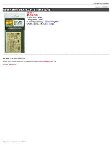 Informacje o produkcie Utworzono 03-03-2017 Aber 48046 Sd.Kfz.234/2 Puma (1/48) Cena : 49,90 PLN Producent : Aber Dostępność : Jest Stan magazynowy : bardzo wysoki Średnia ocena : brak recenzji Aber 48046 Sd.Kfz.234/2 Puma (1/48) Wysokiej jakości elementy fototrawione do modeli plastikowych firmy Tamiya lub Italeri. Skala 1/48 Producent: Aber (Polska) Wygenerowano w programie www.oscGold.com Polecamy! Informacje o produkcie Ważne informacje: Prosimy o dokładne zapoznanie się z zasadami działania naszego sklepu. To bardzo ważne i pozwoli na uniknięcie nieporozumień związanych z koniecznością oczekiwania na przesyłkę. Wszystkie zamówienia realizujemy w kolejności zgłoszeń. Wybranie "przesyłka priorytetowa" jako sposobu wysyłki nie oznacza, że paczka zostanie wysłana na drugi dzień. To tylko rodzaj usługi pocztowej. Firma Jadar-Model jest właścicielem dwóch sklepów. Jeden z nich to sklep internetowy, drugi zaś jest prawdziwy i mieści się w Warszawie, stolicy Polski. Te same modele i akcesoria oferowane w sklepie internetowym sprzedawane są w jednocześnie w obu sklepach. Ponieważ nasza oferta jest bardzo duża nie mamy magazynu z wielką ilością tych samych przedmiotów. Może zdarzyć się, że model, który chcesz kupić został sprzedany w drugim sklepie. Wtedy zostaniesz powiadomiony emailem, że realizacja Twojego zamówienia będzie dłuższa, ponieważ musimy uzupełnić magazyn i czekamy na dostawę od producenta. Prosimy o cierpliwość i wyrozumiałość. Nie ponosimy odpowiedzialności za różnicę w zawartości pudełka w stosunku do prezentowanego zdjęcia. Zdjęcia są zazwyczaj reklamówkami i mogą zawierać również inne części, które nie wchodzą w skład danego produktu. Salon Modelarski Jadar-Model Ul. Jagiellońska 58, 03-468 Warszawa (przy Pl.Hallera) tel.(0 22) 403-34-30 (w sprawie zamówień prosimy dzwonić: (0 22) 620-05-39) Tutaj jesteśmy - kliknij poniższy link: Warszawa, Jagiellońska 58 sklep jest czynny w godz.: pon.-pt. 11.oo 19.oo sobota 10.oo 14.oo Wygenerowano w programie www.oscGold.com