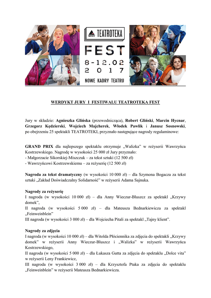 WERDYKT JURY I FESTIWALU TEATROTEKA FEST Jury w składzie: Agnieszka Glińska (przewodnicząca), Robert Gliński, Marcin Hycnar, Grzegorz Kędzierski, Wojciech Majcherek, Włodek Pawlik i Janusz Sosnowski, po obejrzeniu 25 spektakli TEATROTEKI, przyznało następujące nagrody regulaminowe: GRAND PRIX dla najlepszego spektaklu otrzymuje „Walizka” w reżyserii Wawrzyńca Kostrzewskiego. Nagrodę w wysokości 25 000 zł Jury przyznało: - Małgorzacie Sikorskiej-Miszczuk – za tekst sztuki (12 500 zł) - Wawrzyńcowi Kostrzewskiemu – za reżyserię (12 500 zł) Nagroda za tekst dramatyczny (w wysokości 10 000 zł) – dla Szymona Bogacza za tekst sztuki „Zakład Doświadczalny Solidarność” w reżyserii Adama Sajnuka. Nagrody za reżyserię I nagroda (w wysokości 10 000 zł) – dla Anny Wieczur-Bluszcz za spektakl „Krzywy domek”, II nagroda (w wysokości 5 000 zł) – dla Mateusza Bednarkiewicza za spektakl „Feinweinblein” III nagroda (w wysokości 3 000 zł) – dla Wojciecha Pitali za spektakl „Tajny klient”. Nagrody za zdjęcia I nagroda (w wysokości 10 000 zł) – dla Witolda Płóciennika za zdjęcia do spektakli „Krzywy domek” w reżyserii Anny Wieczur-Bluszcz i „Walizka” w reżyserii Wawrzyńca Kostrzewskiego, II nagroda (w wysokości 5 000 zł) – dla Łukasza Gutta za zdjęcia do spektaklu „Dolce vita” w reżyserii Leny Frankiewicz, III nagroda (w wysokości 3 000 zł) – dla Krzysztofa Ptaka za zdjęcia do spektaklu „Feinweinblein” w reżyserii Mateusza Bednarkiewicza. Nagrody za scenografię I nagroda (w wysokości 10 000 zł) – dla Ewy Gdowiok za spektakle „Krzywy domek” w reżyserii Anny Wieczur-Bluszcz i „Walizka” w reżyserii Wawrzyńca Kostrzewskiego, II nagroda (w wysokości 5 000 zł) – dla Agnieszki Zawadowskiej za spektakl „Feinweinblein” w reżyserii Mateusza Bednarkiewicza, III nagroda (w wysokości 3 000 zł) – dla Katarzyny Adamczyk za spektakl „Zakład Doświadczalny Solidarność” w reżyserii Adama Sajnuka. Nagroda za muzykę oryginalną lub opracowanie muzyczne (w wysokości 10 000 zł) - dla Tomasza Łuca za muzykę do spektakli „Wizyta” w reżyserii Agnieszki Maskovic i „Nad” w reżyserii Mariusza Bielińskiego. Nagroda za montaż (w wysokości 10 000 zł) – dla Jakuba Motylewskiego za spektakl „Zakład Doświadczalny Solidarność” w reżyserii Adama Sajnuka. Nagroda za pierwszoplanową rolę kobiecą (w wysokości 10 000 zł) – dla Barbary Wypych za rolę w spektaklu „Krzywy domek” w reżyserii Anny Wieczur-Bluszcz, Nagroda za pierwszoplanową rolę męską (w wysokości 10 000 zł) – dla Krzysztofa Stroińskiego za rolę w spektaklu „Nad” w reżyserii Mariusza Bielińskiego. Nagroda za drugoplanową rolę kobiecą (w wysokości 5 000 zł) – dla Ewy Dałkowskiej za rolę w spektaklu „Feinweinblein” w reżyserii Mateusza Bednarkiewicza. Nagroda za drugoplanową rolę męską (w wysokości 5 000 zł) – dla Krzysztofa Globisza za rolę w spektaklu „Walizka” w reżyserii Wawrzyńca Kostrzewskiego. Nagroda Rektora Akademii Teatralnej im. Aleksandra Zelwerowicza w Warszawie za reżyserię dla absolwenta Wydziału Reżyserii tej uczelni (w wysokości 3 000 zł) – dla Agaty Puszcz za spektakl „Cukier Stanik”. Agnieszka Glińska (przewodnicząca) Robert Gliński Marcin Hycnar Grzegorz Kędzierski Wojciech Majcherek Włodek Pawlik Janusz Sosnowski Warszawa, dnia 10 lutego 2017