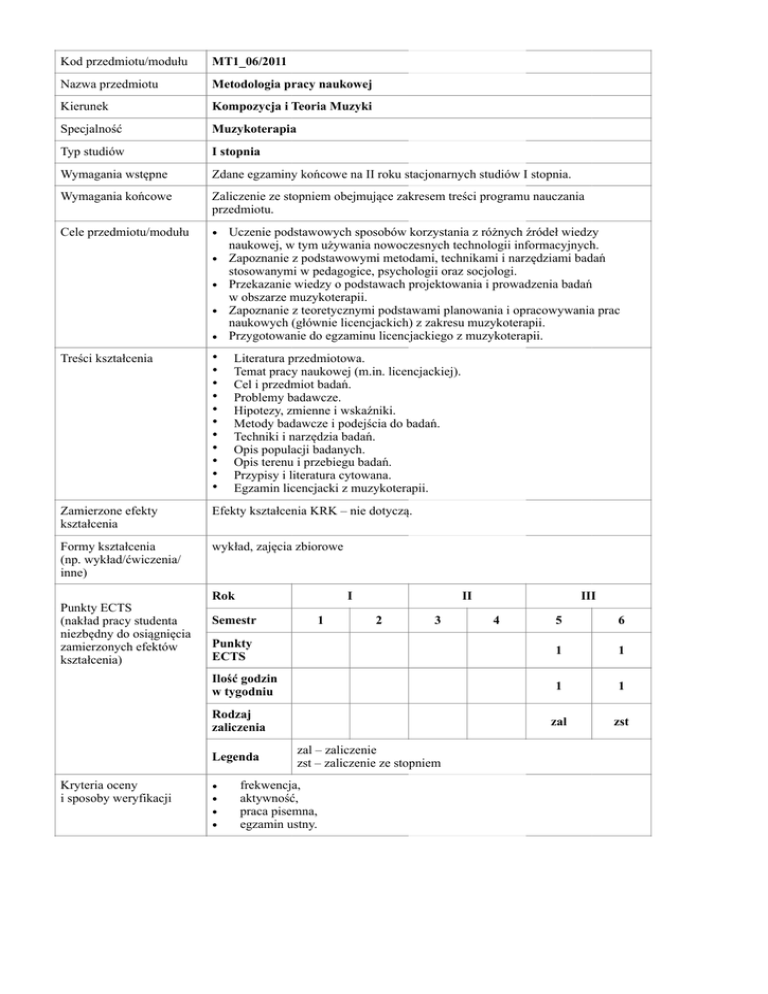 Kod przedmiotu/modułu MT1_06/2011 Nazwa przedmiotu Metodologia pracy naukowej Kierunek Kompozycja i Teoria Muzyki Specjalność Muzykoterapia Typ studiów I stopnia Wymagania wstępne Zdane egzaminy końcowe na II roku stacjonarnych studiów I stopnia. Wymagania końcowe Zaliczenie ze stopniem obejmujące zakresem treści programu nauczania przedmiotu. Cele przedmiotu/modułu • Uczenie podstawowych sposobów korzystania z różnych źródeł wiedzy naukowej, w tym używania nowoczesnych technologii informacyjnych. • Zapoznanie z podstawowymi metodami, technikami i narzędziami badań stosowanymi w pedagogice, psychologii oraz socjologi. • Przekazanie wiedzy o podstawach projektowania i prowadzenia badań w obszarze muzykoterapii. • Zapoznanie z teoretycznymi podstawami planowania i opracowywania prac naukowych (głównie licencjackich) z zakresu muzykoterapii. • Przygotowanie do egzaminu licencjackiego z muzykoterapii. Treści kształcenia • • • • • • • • • • • Zamierzone efekty kształcenia Efekty kształcenia KRK – nie dotyczą. Formy kształcenia (np. wykład/ćwiczenia/ inne) wykład, zajęcia zbiorowe ! Punkty ECTS (nakład pracy studenta niezbędny do osiągnięcia zamierzonych efektów kształcenia) Literatura przedmiotowa. Temat pracy naukowej (m.in. licencjackiej). Cel i przedmiot badań. Problemy badawcze. Hipotezy, zmienne i wskaźniki. Metody badawcze i podejścia do badań. Techniki i narzędzia badań. Opis populacji badanych. Opis terenu i przebiegu badań. Przypisy i literatura cytowana. Egzamin licencjacki z muzykoterapii. Rok I Semestr 1 II 2 3 5 6 Punkty ECTS 1 1 Ilość godzin w tygodniu 1 1 zal zst Rodzaj zaliczenia Legenda Kryteria oceny i sposoby weryfikacji III • • • • zal – zaliczenie zst – zaliczenie ze stopniem frekwencja, aktywność, praca pisemna, egzamin ustny. 4 Literatura • • • • • • • • • • Ciczkowski W., Prace promocyjne z pedagogiki. Skrypt uczestników seminariów licencjackiego, magisterskiego i doktoranckiego, Wydawnictwo Uniwersytetu Warmińsko-Mazurskiego, Olsztyn 2000. Clanchy J., Ballard B., Jak pisać. Poradnik maturzysty i studenta, Wydawnictwo Eremis, Warszawa 2001. Dudkiewicz W., Podstawy metodologii badań do pracy magisterskiej, licencjackiej z pedagogiki, wyd. V, Wydawnictwo Stachurski, Kielce 2001. Kemp A. (red.), Zarys metodyki badań naukowych w pedagogice muzycznej, WSP, Zielona Góra 1997. Konarzewski K., Jak uprawiać badania oświatowe. Metodologia praktyczna, WSiP, Warszawa 2000. Łobocki M., Metody i techniki badań pedagogicznych, Oficyna Wydawnicza „Impuls”, Kraków 2000. Łobocki M., Wprowadzenie do metodologii badań pedagogicznych, Oficyna Wydawnicza „Impuls”, Kraków 2001. Maszke A. W., Metodologiczne podstawy badań pedagogicznych, wyd. II zmienione, Wydawnictwo Uniwersytetu Rzeszowskiego, Rzeszów 2004. Pilch T., Bauman T., Zasady badań pedagogicznych. Strategie ilościowe i jakościowe, wydanie II, Wydawnictwo Akademickie „Żak”, Warszawa 2001. Wojcik K., Piszę pracę magisterską. Przewodnik dla autorów akademickich prac promocyjnych (licencjackich, magisterskich, doktorskich), Oficyna Wydawnicza Szkoły Głównej Handlowej, Warszawa 2002. Język wykładowy polski Prowadzący dr Paweł Cylulko Uwagi