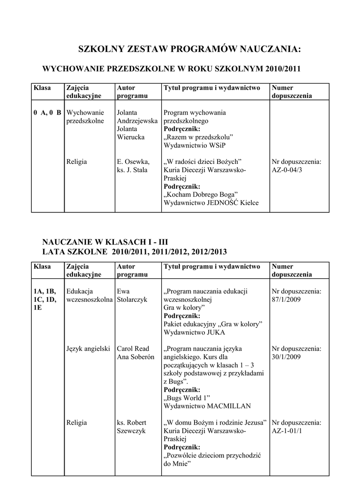 SZKOLNY ZESTAW PROGRAMÓW NAUCZANIA: WYCHOWANIE PRZEDSZKOLNE W ROKU SZKOLNYM 2010/2011 Klasa Zajęcia edukacyjne 0 A, 0 B Wychowanie przedszkolne Religia Autor programu Tytuł programu i wydawnictwo Jolanta Andrzejewska Jolanta Wierucka Program wychowania przedszkolnego Podręcznik: „Razem w przedszkolu” Wydawnictwio WSiP E. Osewka, ks. J. Stala „W radości dzieci Bożych” Kuria Diecezji WarszawskoPraskiej Podręcznik: „Kocham Dobrego Boga” Wydawnictwo JEDNOŚĆ Kielce Numer dopuszczenia Nr dopuszczenia: AZ-0-04/3 NAUCZANIE W KLASACH I - III LATA SZKOLNE 2010/2011, 2011/2012, 2012/2013 Klasa Zajęcia edukacyjne Autor programu Tytuł programu i wydawnictwo Numer dopuszczenia 1A, 1B, 1C, 1D, 1E Edukacja Ewa wczesnoszkolna Stolarczyk „Program nauczania edukacji wczesnoszkolnej Gra w kolory” Podręcznik: Pakiet edukacyjny „Gra w kolory” Wydawnictwo JUKA Nr dopuszczenia: 87/1/2009 Język angielski Carol Read Ana Soberón „Program nauczania języka angielskiego. Kurs dla początkujących w klasach 1 – 3 szkoły podstawowej z przykładami z Bugs”. Podręcznik: „Bugs World 1” Wydawnictwo MACMILLAN Nr dopuszczenia: 30/1/2009 Religia „W domu Bożym i rodzinie Jezusa” Nr dopuszczenia: Kuria Diecezji WarszawskoAZ-1-01/1 Praskiej Podręcznik: „Pozwólcie dzieciom przychodzić do Mnie” ks. Robert Szewczyk 2 A, 2 E Edukacja Jolanta wczesnoszkolna Faliszewska „Program edukacji wczesnoszkolnej Nr dopuszczenia: w klasach I – III szkoły 80/2/2010 podstawowej” Podręcznik: Pakiet edukacyjny „Odkrywam siebie. Ja i moja szkoła” Wydawnictwo MAC 2 B, 2 C, Edukacja Ewa 2 D, wczesnoszkolna Stolarczyk „Program nauczania edukacji wczesnoszkolnej Gra w kolory” Podręcznik: Pakiet edukacyjny „Gra w kolory” Wydawnictwo JUKA Nr dopuszczenia: 1/87/2010 2 A, 2 B, Język angielski Carol Read 2 C, 2 D, Ana Soberón 2E „Program nauczania języka angielskiego. Kurs dla początkujących w klasach 1 – 3 szkoły podstawowej z przykładami z Bugs”. Podręcznik: „Bugs world 2a” Wydawnictwo MACMILLAN Nr dopuszczenia: 152/06 2 A, 2 B, Religia 2 C, 2 D, 2E ks. Robert Szewczyk „W domu Bożym i rodzinie Jezusa” Nr dopuszczenia: Kuria Diecezji WarszawskoAZ-1-01/1 Praskiej Podręcznik: „Przyjdźcie do Mnie wszyscy” Wydawnictwo Kuria Diecezji Warszawsko-Praskiej 3 A, 3 B, Kształcenie 3 C, 3 D, zintegrowane 3 E, 3 F Małgorzata Piotrowska Ewa Szymańska Pakiet edukacyjny „Już w Szkole” Podręcznik: „Już w szkole” Wydawnictwo „Nowa Era” Nr dopuszczenia: DKW-4014-149/9 Język angielski Carol Read Ana Soberón „Program nauczania języka angielskiego. Kurs dla początkujących w klasach 1 – 3 szkoły podstawowej z przykładami z Bugs”. Podręcznik: „Bugs 3” Wydawnictwo MACMILLAN Nr dopuszczenia: 152/06 Religia „W domu Bożym i rodzinie Jezusa” Nr dopuszczenia: AZ-1-01/1 Kuria Diecezji WarszawskoPraskiej Podręcznik: ks. Robert Szewczyk „Abyście szli i owoc przynosili” Wydawnictwo Kuria Diecezji Warszawsko-Praskiej Program Profilaktyki Szkoły Podstawowej nr 7 w Legionowie obowiązujący od roku szkolnego 2009/2010. Program wychowawczy szkoły obowiązujący od roku szkolnego 2004/2005. Pozytywna opinia Rady Pedagogicznej z dnia 11.06.2010r. Dopuszczam do użytku szkolnego Dyrektor szkoły Małgorzata Marszałek