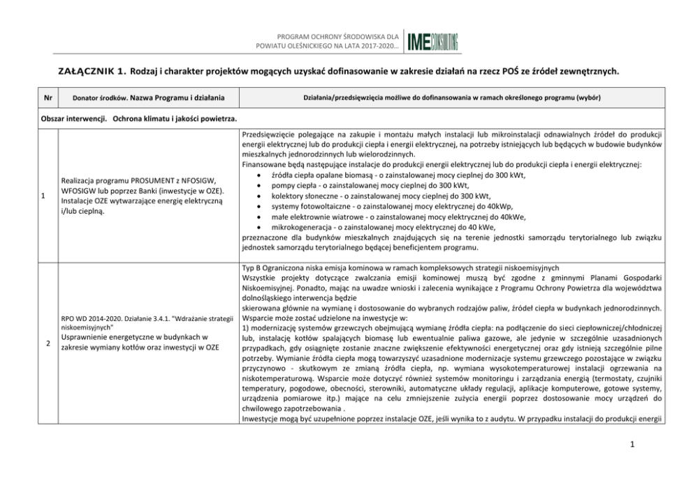 PROGRAM OCHRONY ŚRODOWISKA DLA POWIATU OLEŚNICKIEGO NA LATA 2017-2020… ZAŁĄCZNIK 1. Rodzaj i charakter projektów mogących uzyskać dofinasowanie w zakresie działań na rzecz POŚ ze źródeł zewnętrznych. Nr Donator środków. Nazwa Programu i działania Działania/przedsięwzięcia możliwe do dofinansowania w ramach określonego programu (wybór) Obszar interwencji. Ochrona klimatu i jakości powietrza. Realizacja programu PROSUMENT z NFOSIGW, WFOSIGW lub poprzez Banki (inwestycje w OZE). Instalacje OZE wytwarzające energię elektryczną i/lub cieplną. 1 RPO WD 2014-2020. Działanie 3.4.1. "Wdrażanie strategii niskoemisyjnych" 2 Usprawnienie energetyczne w budynkach w zakresie wymiany kotłów oraz inwestycji w OZE Przedsięwzięcie polegające na zakupie i montażu małych instalacji lub mikroinstalacji odnawialnych źródeł do produkcji energii elektrycznej lub do produkcji ciepła i energii elektrycznej, na potrzeby istniejących lub będących w budowie budynków mieszkalnych jednorodzinnych lub wielorodzinnych. Finansowane będą następujące instalacje do produkcji energii elektrycznej lub do produkcji ciepła i energii elektrycznej: źródła ciepła opalane biomasą - o zainstalowanej mocy cieplnej do 300 kWt, pompy ciepła - o zainstalowanej mocy cieplnej do 300 kWt, kolektory słoneczne - o zainstalowanej mocy cieplnej do 300 kWt, systemy fotowoltaiczne - o zainstalowanej mocy elektrycznej do 40kWp, małe elektrownie wiatrowe - o zainstalowanej mocy elektrycznej do 40kWe, mikrokogeneracja - o zainstalowanej mocy elektrycznej do 40 kWe, przeznaczone dla budynków mieszkalnych znajdujących się na terenie jednostki samorządu terytorialnego lub związku jednostek samorządu terytorialnego będącej beneficjentem programu. Typ B Ograniczona niska emisja kominowa w ramach kompleksowych strategii niskoemisyjnych Wszystkie projekty dotyczące zwalczania emisji kominowej muszą być zgodne z gminnymi Planami Gospodarki Niskoemisyjnej. Ponadto, mając na uwadze wnioski i zalecenia wynikające z Programu Ochrony Powietrza dla województwa dolnośląskiego interwencja będzie skierowana głównie na wymianę i dostosowanie do wybranych rodzajów paliw, źródeł ciepła w budynkach jednorodzinnych. Wsparcie może zostać udzielone na inwestycje w: 1) modernizację systemów grzewczych obejmującą wymianę źródła ciepła: na podłączenie do sieci ciepłowniczej/chłodniczej lub, instalację kotłów spalających biomasę lub ewentualnie paliwa gazowe, ale jedynie w szczególnie uzasadnionych przypadkach, gdy osiągnięte zostanie znaczne zwiększenie efektywności energetycznej oraz gdy istnieją szczególnie pilne potrzeby. Wymianie źródła ciepła mogą towarzyszyć uzasadnione modernizacje systemu grzewczego pozostające w związku przyczynowo - skutkowym ze zmianą źródła ciepła, np. wymiana wysokotemperaturowej instalacji ogrzewania na niskotemperaturową. Wsparcie może dotyczyć również systemów monitoringu i zarządzania energią (termostaty, czujniki temperatury, pogodowe, obecności, sterowniki, automatyczne układy regulacji, aplikacje komputerowe, gotowe systemy, urządzenia pomiarowe itp.) mające na celu zmniejszenie zużycia energii poprzez dostosowanie mocy urządzeń do chwilowego zapotrzebowania . Inwestycje mogą być uzupełnione poprzez instalacje OZE, jeśli wynika to z audytu. W przypadku instalacji do produkcji energii 1 PROGRAM OCHRONY ŚRODOWISKA DLA POWIATU OLEŚNICKIEGO NA LATA 2017-2020… Nr Donator środków. Nazwa Programu i działania Działania/przedsięwzięcia możliwe do dofinansowania w ramach określonego programu (wybór) elektrycznej np. fotowoltaicznej czy wykorzystującej siłę wiatru dopuszcza się mikroinstalacje których moc powinna być obliczona na zaspokojenie zapotrzebowania na energię elektryczną w modernizowanym budynku, na podstawie średniorocznego zużycia za poprzedni rok i uwzględniającego oszczędności uzyskane w wyniku realizacji projektu. Dopuszcza się oddawanie („akumulację”) do sieci energetycznej okresowych nadwyżek. Inwestycje muszą przyczyniać się do zmniejszenia emisji CO2 i innych zanieczyszczeń powietrza oraz do znacznego zwiększenia oszczędności energii. W związku z tym, głównym zadaniem będzie sukcesywna likwidacja nieekologicznych źródeł ciepła, wymiana na nowe a tym samym zmniejszanie emisji zanieczyszczeń do powietrza. Wspierane będą działania związane z modernizacją systemów grzewczych (wymiana źródła ciepła wraz z podłączeniem, połączona z odchodzeniem od wysokoemisyjnych paliw stałych), mających na celu redukcję emisji „kominowej” w budynkach jednorodzinnych, które mogą być uzupełniane poprzez instalację OZE (z wyłączeniem źródeł w układzie wysokosprawnej kogeneracji i trigeneracji) na potrzeby modernizowanych budynków. Wsparcie będzie realizowane w ramach programów o charakterze prosumenckim (odbiorcą końcowym pomocy byliby wówczas mieszkańcy), inicjowanych przez JST lub innych beneficjentów. 2 PROGRAM OCHRONY ŚRODOWISKA DLA POWIATU OLEŚNICKIEGO NA LATA 2017-2020… Nr 3 Donator środków. Nazwa Programu i działania Efektywność energetyczna w budynkach użyteczności publicznej RPO WD 2014-2020. Działanie 3.3. "Efektywność energetyczna w budynkach użyteczności publicznej" Działania/przedsięwzięcia możliwe do dofinansowania w ramach określonego programu (wybór) Projekty związane z kompleksową modernizacją energetyczną budynków użyteczności publicznej i mieszkalnych wielorodzinnych opartych o system zarządzania energią dotyczące m.in.: ocieplenia (termomodernizacji) obiektów (ocieplenie ścian, stropów, fundamentów, stropodachów lub dachów, modernizacja lub wymiana stolarki okiennej i drzwiowej lub wymiana oszkleń w budynkach na efektywne energetycznie, likwidacja liniowych i punktowych mostków cieplnych montaż urządzeń zacieniających okna (np. rolety, żaluzje); modernizacji sy