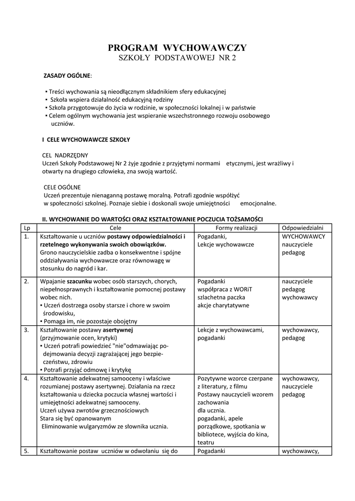 PROGRAM WYCHOWAWCZY SZKOŁY PODSTAWOWEJ NR 2 ZASADY OGÓLNE: ▪ Treści wychowania są nieodłącznym składnikiem sfery edukacyjnej ▪ Szkoła wspiera działalność edukacyjną rodziny ▪ Szkoła przygotowuje do życia w rodzinie, w społeczności lokalnej i w państwie ▪ Celem ogólnym wychowania jest wspieranie wszechstronnego rozwoju osobowego uczniów. I CELE WYCHOWAWCZE SZKOŁY CEL NADRZĘDNY Uczeń Szkoły Podstawowej Nr 2 żyje zgodnie z przyjętymi normami etycznymi, jest wrażliwy i otwarty na drugiego człowieka, zna swoją wartość. CELE OGÓLNE Uczeń prezentuje nienaganną postawę moralną. Potrafi zgodnie współżyć w społeczności szkolnej. Poznaje siebie i doskonali swoje umiejętności emocjonalne. Lp 1. 2. 3. 4. 5. II. WYCHOWANIE DO WARTOŚCI ORAZ KSZTAŁTOWANIE POCZUCIA TOŻSAMOŚCI Cele Formy realizacji Kształtowanie u uczniów postawy odpowiedzialności i Pogadanki, rzetelnego wykonywania swoich obowiązków. Lekcje wychowawcze Grono nauczycielskie zadba o konsekwentne i spójne oddziaływania wychowawcze oraz równowagę w stosunku do nagród i kar. Wpajanie szacunku wobec osób starszych, chorych, niepełnosprawnych i kształtowanie pomocnej postawy wobec nich. ▪ Uczeń dostrzega osoby starsze i chore w swoim środowisku, ▪ Pomaga im, nie pozostaje obojętny Kształtowanie postawy asertywnej (przyjmowanie ocen, krytyki) ▪ Uczeń potrafi powiedzieć "nie"odmawiając podejmowania decyzji zagrażającej jego bezpieczeństwu, zdrowiu ▪ Potrafi przyjąć odmowę i krytykę Kształtowanie adekwatnej samooceny i właściwe rozumianej postawy asertywnej. Działania na rzecz kształtowania u dziecka poczucia własnej wartości i umiejętności adekwatnej samooceny. Uczeń używa zwrotów grzecznościowych Stara się być opanowanym Eliminowanie wulgaryzmów ze słownika ucznia. Kształtowanie postaw uczniów w odwołaniu się do Odpowiedzialni WYCHOWAWCY nauczyciele pedagog Pogadanki współpraca z WORiT szlachetna paczka akcje charytatywne nauczyciele pedagog wychowawcy Lekcje z wychowawcami, pogadanki wychowawcy, pedagog Pozytywne wzorce czerpane z literatury, z filmu Postawy nauczycieli wzorem zachowania dla ucznia. pogadanki, apele porządkowe, spotkania w bibliotece, wyjścia do kina, teatru Pogadanki wychowawcy, nauczyciele pedagog wychowawcy, 6. 7. 8. 10 11. podstawowych wartości moralnych i norm prawa szkolnego. Zapobieganie i eliminowanie zachowań agresywnych. ▪ Uczeń rozpoznaje dobro i zło ▪ Uczeń dostrzega i prawidłowo reaguje na zachowania naruszające przyjęte normy moralne i normy prawa szkolnego, sam zachowuje się zgodnie z przyjętymi normami Uczeń rozwija postawę empatii wobec innych , postawę zaangażowania w ochronę wspólnej własności , uczciwości. Wpajanie szacunku i chęci naśladowania autorytetów ▪ Uczeń szanuje autorytety, dostrzega je. ▪ Dąży do ich naśladowania Lekcje wychowawcze projekty zajęcia profilaktyczne współpraca z rodzicami pedagog nauczyciele SU Pogadanki, pozytywne wzorce, czerpane z literatury, filmu, z otoczenia, zachowania nauczycieli, rodziców Kształtowanie postaw wzajemnej życzliwości, Prelekcje pedagoga tolerancji, wrażliwości szkolnego, udział ▪ Uczeń potrafi przyznać rację rodzicom, w życiu zespołu klasowego, nauczycielowi, kolegom i przeciwnikom rodziny ▪ Przyznaje się do własnych błędów współpraca z Worit, ▪ Szanuje zdanie i poglądy innych spektakle teatralne, ▪ Rozumie i akceptuje odmienność kolegów projekty w zakresie wyglądu, wyników w nauce Lekcje, czy niepełnosprawności warsztaty z pedagogiem Uczenie umiejętności radzenia sobie z trudnymi uczuciami: gniewu, wstydu Uczeń potrafi opanować swoje uczucia gniewu, wstydu Potrafi o nich mówić Kształtowanie poczucia patriotyzmu i tożsamości Kontakt z pedagogiem narodowej i Poradnią Psychologiczno Dbałość o oprawę patriotyczną uroczystości szkolnych, Pedagogiczną reprezentowanie szkoły podczas obchodów patriotycznych uroczystości miejskich, organizacja szkolnych uroczystości patriotycznych głównie z okazji świat narodowych, opieka nad grobem Powstańców Śląskich wychowawcy, pedagog, rodzice, nauczyciele Sztuka efektywnej komunikacji. Rozwijanie konfliktów na drodze mediacji i kompromisu. ▪ Potrafi stosować różny typ komunikatu ▪ Słucha uważnie i ze zrozumieniem ▪ Rozumie nadawany do niego komunikat Propagowanie zdrowego stylu życia - przeciwdziałanie alkoholizmowi i narkomanii, zażywaniu środków psychoaktywnych (dopalaczy) Lekcje, pogadanki tydzień profilaktyki warsztaty z komunikacji Wychowawcy, nauczyciele, pedagog SU konkursy plastyczne akcje tydzień profilaktyki pogadanki, lekcje wychowawcze projekty nauczyciele pedagog wychowawcy wychowawcy, pedagog, rodzice, nauczyciele SU Wychowawcy, pedagog, nauczyciele, dyrektor III. IMPREZY I UROCZYSTOŚCI SZKOLNE, AKCJE PODEJMOWANE I PRZEPROWADZANE PRZEZ UCZNIÓW - Załącznik - Kalendarz imprez na każdy rok szkolny. IV. SAMORZĄDNOŚĆ UCZNIÓW Lp. 1 Cele Wdrażanie do zaangażowania społecznego Uczeń aktywnie uczestniczy w życiu klasy i społeczności szkolnej oraz społeczności lokalnej Formy realizacji Działalność pozalekcyjna, w kołach zainteresowań, pracy na rzecz szkoły i środowiska działalność w SU wolontariat Godziny wychowawcze Odpowiedzialni dyrektor, wychowawcy, nauczyciele 2 Przybliżanie uczniom mechanizmów demokratycznego podejmowania decyzji poprzez wybór swoich przedstawicieli do samorządów klasowych i samorządu szkolnego Opracowywanie wspólne regulaminu SU przeprowadzenie wyborów do SU Zapoznanie się z możliwościami odwołania się do Samorządu Uczniowskiego w sprawach konfliktowych i spornych Zebrania Samorządu Uczniowskiego Godziny wychowawcze Skrzynka pytań i wniosków. wychowawcy, opiekun SU wychowawcy, opiekun SU Cele Wychowanie do demokracji ▪ Uczeń potrafi podjąć decyzję, ▪ Czuje się odpowiedzialny za powierzone mu obowiązki Kształtowanie pos