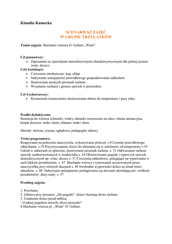 Klaudia Kamecka SCENARIUSZ ZAJĘĆ W GRUPIE TRZYLATKÓW Temat zajęcia: Słuchanie wiersza D. Gellner „Wiatr” Cel poznawczy: • Zapoznanie ze zjawiskami atmosferycznymi charakterystycznymi dla późnej jesieni: wiatr, deszcz; Cele kształcące: • Ćwiczenia ortofoniczne: kap, chlap • Nabywanie umiejętności prawidłowego gospodarowania oddechem • Ilustrowanie prostych piosenek ruchem • WyraŜanie ruchami i gestem zjawisk w przyrodzie. Cel wychowawczy: • Rozumienie konieczności dostosowania ubioru do temperatury i pory roku. Środki dydaktyczne: Ilustracja do wiersza (chmurki, wiatr), chmurki zawieszone na nitce, chusta animacyjna, krople deszczu: mała i duŜa, chmura: mała i duŜa. Metody: słowna, czynna, oglądowa, pedagogiki zabawy Treści programowe: Reagowanie na polecenia nauczyciela, wykonywanie poleceń. s.9.Uczenie prawidłowego oddychania. s.19 Przyzwyczajanie dzieci do ubierania się w zaleŜności od temperatury s.19 Udział w zabawach ze śpiewem, ilustrowanie piosenek ruchem. s. 31 Odtwarzanie ruchem zjawisk zaobserwowanych w środowisku s. 34 Obserwowanie pogody i typowych zjawisk atmosferycznych np. wiatr, deszcz s. 37 Ćwiczenia oddechowe, polegające na wprawianiu w ruch lekkich przedmiotów. s. 47 Słuchanie wierszy i rymowanek recytowanych przez nauczycielkę przy róŜnych okazjach s. 48 Swobodne wypowiedzi dzieci na temat treści obrazków. s. 48 Nabywanie umiejętności posługiwania się słowami określającymi: wielkość przedmiotów: duŜy-mały. s. 57 Przebieg zajęcia: 1. Powitanie. 2. Zabawa przy piosence „Zła pogoda”- dzieci ilustrują słowa ruchem. 3. Usadzenie dzieci przed tablicą. - O jakiej pogodzie mówiły słowa piosenki? 4.Słuchanie wiersza pt. „Wiatr” D. Gellner. Wiatr Tam za lasem, Tam za górką Wiatr dokuczał Małym chmurkom. AŜ się chmurki Rozpłakały I deszcz padał Przez dzień cały. - Komu dokuczał wiatr? -Co zrobiły chmurki? 5.Rozwiązanie zagadki słuchowej (deszcz, wiatr). 6. Ćwiczenia oddechowe: wprawianie w ruch chmurek z kartonu zawieszonych na nitce. 7. Przerwa: rysowanie deszczu w powietrzu i na dywanie. 8.Praca z obrazkiem, opisywanie ubioru dwóch dziewczynek, rozumienie konieczności dostosowania ubioru do panujących zjawisk atmosferycznych. 9. Zabawa z chustą animacyjną. * Dzieci stoją w kręgu, trzymając chustę animacyjną. * Na hasło: „drobny deszczyk”- delikatnie poruszają chustą. * Na hasło: „duŜy deszcz” –dynamicznie poruszają chustą. * Na hasło: „burza” –chowają się pod chustą. 10. Podziękowanie i poŜegnanie.