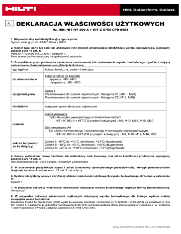 PL DEKLARACJA WŁAŚCIWOŚCI UŻYTKOWYCH No. Hilti HIT-HY 200-A + HIT-Z 0756-CPD-0454 1. Niepowtarzalny kod identyfikacyjny typu wyrobu: System iniekcyjny Hilti HIT-HY 200-A + HIT-Z 2. Numer typu, partii lub serii lub jakikolwiek inny element umożliwiający identyfikację wyrobu budowlanego, wymagany zgodnie z art. 11 ust. 4: Patrz ETA-12/0006 (15.03.2013), załącznik 1. Patrz numer partii umieszczony na opakowaniu/ produkcie. 3. Przewidziane przez producenta zamierzone zastosowanie lub zastosowania wyrobu budowlanego zgodnie z mającą zastosowanie zharmonizowaną specyfikacją techniczną: typ ogólny kotwa chemiczna, system iniekcyjny do stosowania w beton (C20/25 do C50/60) spękany : M8 - M20 niespękany : M8 - M20 opcja/kategoria Opcja 1 Przystosowana do zjawisk sejsmicznych: Kategoria C1 (M8 - M20) Przystosowana do zjawisk sejsmicznych: Kategoria C2 (M12, M16) obciążenie statyczne, quasi-statyczne, sejsmiczne stal ocynkowana Tylko do użytku wewnętrznego w środowisku suchym HIT-HY 200-A + HIT-Z (z prętem kotwiącym ) : M8, M10, M12, M16, M20 materiał Stal nierdzewna A4 Do użytku wewnętrznego i zewnętrznego w środowisku małoagresywnym HIT-HY 200-A + HIT-Z-R (z prętem kotwiącym) : M8, M10, M12, M16, M20 zakres temperatur (o ile dotyczy) Zakres I: -40°C do +40°C (chwilowe), +24°C(długotrwałe) Zakres II: -40°C do +80°C (chwilowe), +50°C(długotrwałe) Zakres III: -40°C do +120°C (chwilowe), +72°C(długotrwałe) 4. Nazwa, zastrzeżona nazwa handlowa lub zastrzeżony znak towarowy oraz adres kontaktowy producenta, wymagany zgodnie z art. 11 ust. 5: Hilti Aktiengesellschaft, 9494 Schaan, Fürstentum Liechtenstein 5. W stosownych przypadkach nazwa i adres kontaktowy upoważnionego przedstawiciela, którego pełnomocnictwo obejmuje zadania określone w art. 12 ust. 2: nie dotyczy 6. System lub systemy oceny i weryfikacji stałości właściwości użytkowych wyrobu budowlanego określone w załączniku V: System 1 7. W przypadku deklaracji właściwości użytkowych dotyczącej wyrobu budowlanego objętego Normą zharmonizowaną: nie dotyczy 8. W przypadku deklaracji właściwości użytkowych dotyczącej wyrobu budowlanego, dla którego wydana została europejska ocena techniczna: Deutsches Institut für Bautechnik (DIBt) wydał Europejską Aprobatę Techniczną ETA-12/0006 (15.03.2013) na podstawie ETAG 001 Część 1, 5 załącznik E, jednostka notyfikowana 0756-CPD wykonała zadania strony trzeciej opisane w Aneksie V w Systemie 1 oceny zgodności i wydała Certyfikat Zgodności Nr 0756-CPD-0454. DoP_pl_01-00_05042013_Hilti HIT-HY 200-A + HIT-Z 0756-CPD-0454 9. Deklarowane właściwości użytkowe: Zasadnicze charakterystyki Metoda projektowania Właściwości użytkowe EOTA TR 029, metoda A ETA-12/0006 załącznik 8 EOTA TR 045 (sejsmiczne) ETA-12/0006 załącznik 11, 13 EOTA TR 029, metoda A ETA-12/0006 załącznik 10 EOTA TR 045 (sejsmiczne) ETA-12/0006 załącznik 12, 14 EOTA TR 029, metoda A ETA-12/0006 załącznik 3 EOTA TR 029, metoda A ETA-12/0006 załącznik 9, 10 EOTA TR 045 (sejsmiczne) ETA-12/0006 załącznik 11 - 14 Zharmonizowana specyfikacja techniczna charakterystyczna nośność na rozciąganie charakterystyczna nośność na ścinanie minimalny rozstaw i minimalna odległość od krawędzi przemieszczenie w kontekście stanu granicznego użytkowania ETAG 001 Część 1, 5 załącznik E 10. Właściwości użytkowe wyrobu określone w pkt 1 i 2 są zgodne z właściwościami użytkowymi deklarowanymi w pkt 9. Niniejsza deklaracja właściwości użytkowych wydana zostaje na wyłączną odpowiedzialność producenta określonego w pkt 4. W imieniu producenta podpisał: Raimund Zaggl Kierownik Działu Dział Techniki Kotwienia Seppo Perämäki Kierownik Działu Jakości Dział Techniki Kotwienia Hilti Aktiengesellschaft Schaan, lipiec 2013 DoP_pl_01-00_05042013_Hilti HIT-HY 200-A + HIT-Z 0756-CPD-0454