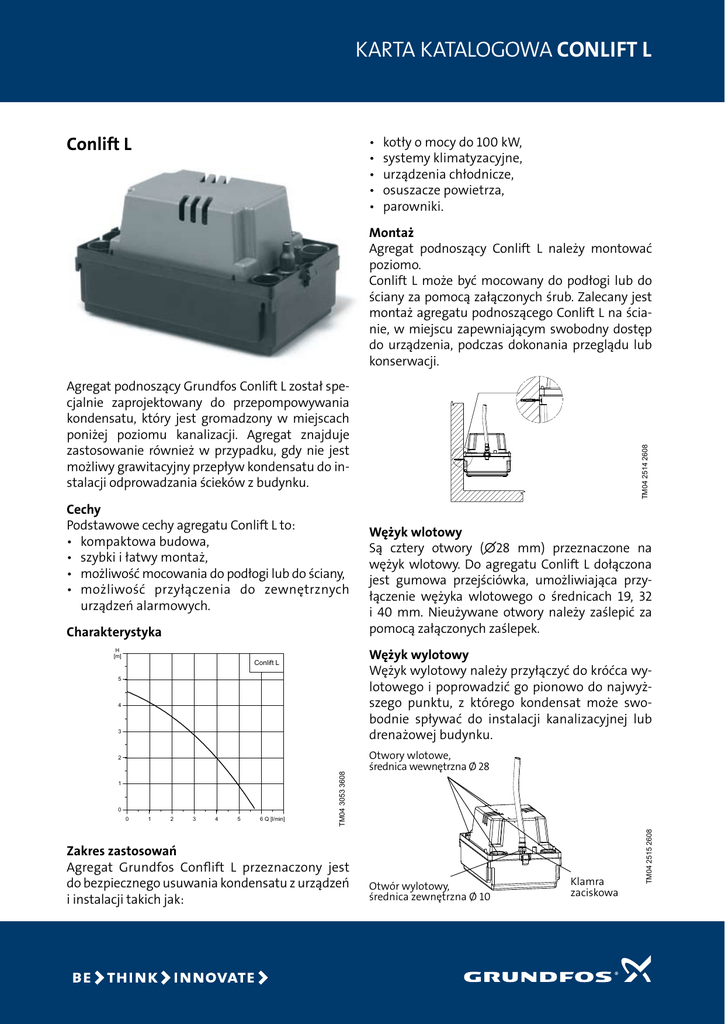 KARTA KATALOGOWA Conlift L Conlift L • • • • • kotły o mocy do 100 kW, systemy klimatyzacyjne, urządzenia chłodnicze, osuszacze powietrza, parowniki. Montaż Agregat podnoszący Conlift L należy montować poziomo. Conlift L może być mocowany do podłogi lub do ściany za pomocą załączonych śrub. Zalecany jest montaż agregatu podnoszącego Conlift L na ścianie, w miejscu zapewniającym swobodny dostęp do urządzenia, podczas dokonania przeglądu lub konserwacji. Cechy Podstawowe cechy agregatu Conlift L to: • kompaktowa budowa, • szybki i łatwy montaż, • możliwość mocowania do podłogi lub do ściany, • możliwość przyłączenia do zewnętrznych urządzeń alarmowych. Charakterystyka Wężyk wylotowy Wężyk wylotowy należy przyłączyć do króćca wylotowego i poprowadzić go pionowo do najwyższego punktu, z którego kondensat może swobodnie spływać do instalacji kanalizacyjnej lub drenażowej budynku. Conlift L 5 4 3 0 0 1 2 3 4 5 6 Q [l/min] TM04 3053 3608 2 1 Wężyk wlotowy Są cztery otwory (∅28 mm) przeznaczone na wężyk wlotowy. Do agregatu Conlift L dołączona jest gumowa przejściówka, umożliwiająca przyłączenie wężyka wlotowego o średnicach 19, 32 i 40 mm. Nieużywane otwory należy zaślepić za pomocą załączonych zaślepek. Zakres zastosowań Agregat Grundfos Conflift L przeznaczony jest do bezpiecznego usuwania kondensatu z urządzeń i instalacji takich jak: Otwory wlotowe, średnica wewnętrzna Ø 28 Otwór wylotowy, średnica zewnętrzna Ø 10 Klamra zaciskowa TM04 2515 2608 H [m] TM04 2514 2608 Agregat podnoszący Grundfos Conlift L został specjalnie zaprojektowany do przepompowywania kondensatu, który jest gromadzony w miejscach poniżej poziomu kanalizacji. Agregat znajduje zastosowanie również w przypadku, gdy nie jest możliwy grawitacyjny przepływ kondensatu do instalacji odprowadzania ścieków z budynku. Bycie odpowiedzialnym to nasz fundament Myślenie o przyszłości otwiera możliwości Innowacje są istotą Zastosowane materiały Podłączenie alarmu Alarm zewnętrzny można podłączyć za pomocą przewodu sygnalizacji alarmowej. Przewód jest przystosowany do napięcia 230 V AC i prądu 0,5 A. Część Materiał Zbiornik PP Pokrywa zbiornika PP Pokrywa silnika PP | Część | Wał | Wężyk wylotowy | Wirnik Materiał Stal PCV PP Rysunek wymiarowy TM04 2516 2608 Długość przewodów Długość przewodu sygnalizacji alarmowej i przewodu zasilającego: 1,3 m. Wysokość podnoszenia Maksymalnie 4,5 m (patrz charakterystyka). Wydajność Maksymalnie 342 l/godz. (patrz charakterystyka). Temperatura cieczy • Wartość średnia temperatury: +35 °C • W krótkich okresach czasu: do +80 °C przez 1,5 min. Temperatura otoczenia Podczas pracy: od +5 °C do +50 °C. Podczas składowania w pomieszczeniach suchych: • zbiornik pusty: od -10 °C do +50 °C, • zbiornik z kondensatem: powyżej 0 °C (ze względu na ryzyko wystąpienia mrozu). Tabliczka znamionowa Agregat podnoszący Conlift L posiada następujące certyfikaty: CE, VDE i GOST. 220-240 V 60 W Type: Conlift L 50 Hz IP20 S3 15% Model: 96845663 EN 60335-2-41 19 / 06 / 2008 N 001 O TM04 2958 3408 Dane techniczne: Dane elektryczne: Zasilanie 1 x 230 V AC ±6 %, 50 Hz, PE. Patrz tabliczka znamionowa. Wartość pH kondensatu Pobór mocy P1 = 60 W Maksymalna gęstość cieczy Pobór prądu I = 0,52 A Stopień ochrony Zabezpieczenie Bezpiecznik zwłoczny 10 A na zasilaniu i wyłącznik różnicowo-prądowy zgodnie z IEC 345. 2,5 lub więcej. 1000 kg/m³ IP X4 Masa 2,0 kg Zbiornik • Pojemność całkowita: 2,1 l, • Pojemność użytkowa: 0,5 l. Wymiary Wys. x Dł. x Szer. = 146 x 277x 160 mm. Patrz rysunek wymiarowy. 96886378 1008 GPL 1250511 Grundfos Pompy Sp. z o.o. ul. Klonowa 23 Baranowo k. Poznania 62-081 Przeźmierowo PL Tryb pracy S3 (praca przerywana): 15% zgodnie z normą DIN EN 0530 T1 (tzn. pracuje przez 1,5 minuty i jest wyłączony przez 8,5 minuty). Maksymalnie 10 załączeń/wyłączeń na godzinę. Zabezpieczenie silnika • Łącznik termiczny +120 °C, • Klasa izolacji: F. Zastrzega sie prawo do zmian. tel.: 061 650 13 00, fax: 061 650 13 50 [email protected] www.grundfos.pl