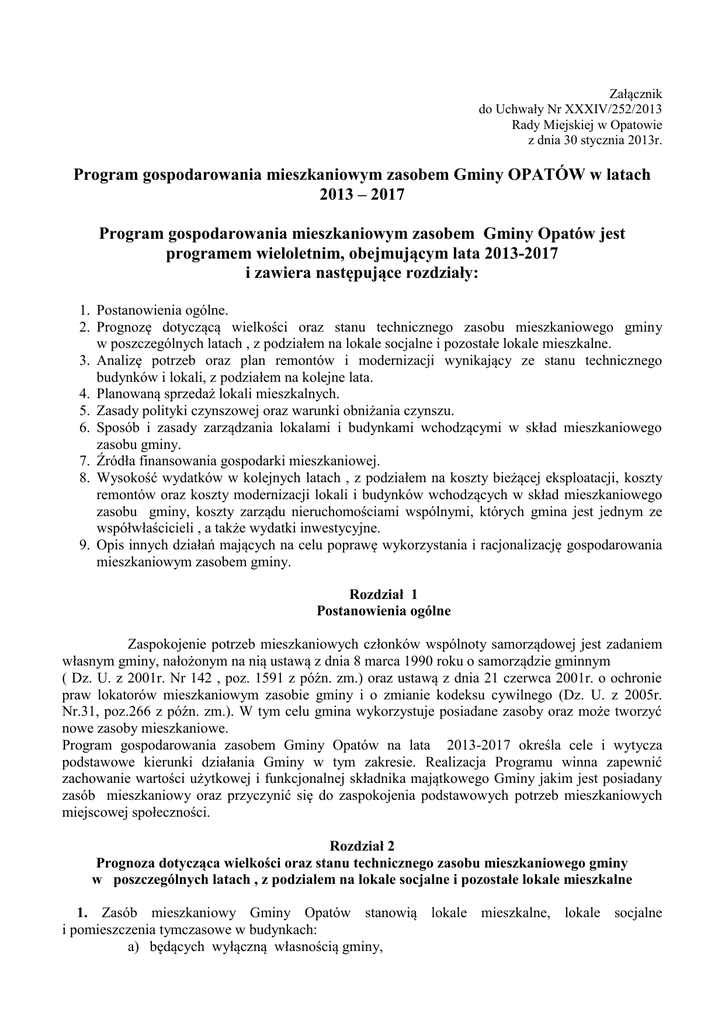 Załącznik do Uchwały Nr XXXIV/252/2013 Rady Miejskiej w Opatowie z dnia 30 stycznia 2013r. Program gospodarowania mieszkaniowym zasobem Gminy OPATÓW w latach 2013 – 2017 Program gospodarowania mieszkaniowym zasobem Gminy Opatów jest programem wieloletnim, obejmującym lata 2013-2017 i zawiera następujące rozdziały: 1. Postanowienia ogólne. 2. Prognozę dotyczącą wielkości oraz stanu technicznego zasobu mieszkaniowego gminy w poszczególnych latach , z podziałem na lokale socjalne i pozostałe lokale mieszkalne. 3. Analizę potrzeb oraz plan remontów i modernizacji wynikający ze stanu technicznego budynków i lokali, z podziałem na kolejne lata. 4. Planowaną sprzedaż lokali mieszkalnych. 5. Zasady polityki czynszowej oraz warunki obniżania czynszu. 6. Sposób i zasady zarządzania lokalami i budynkami wchodzącymi w skład mieszkaniowego zasobu gminy. 7. Źródła finansowania gospodarki mieszkaniowej. 8. Wysokość wydatków w kolejnych latach , z podziałem na koszty bieżącej eksploatacji, koszty remontów oraz koszty modernizacji lokali i budynków wchodzących w skład mieszkaniowego zasobu gminy, koszty zarządu nieruchomościami wspólnymi, których gmina jest jednym ze współwłaścicieli , a także wydatki inwestycyjne. 9. Opis innych działań mających na celu poprawę wykorzystania i racjonalizację gospodarowania mieszkaniowym zasobem gminy. Rozdział 1 Postanowienia ogólne Zaspokojenie potrzeb mieszkaniowych członków wspólnoty samorządowej jest zadaniem własnym gminy, nałożonym na nią ustawą z dnia 8 marca 1990 roku o samorządzie gminnym ( Dz. U. z 2001r. Nr 142 , poz. 1591 z późn. zm.) oraz ustawą z dnia 21 czerwca 2001r. o ochronie praw lokatorów mieszkaniowym zasobie gminy i o zmianie kodeksu cywilnego (Dz. U. z 2005r. Nr.31, poz.266 z późn. zm.). W tym celu gmina wykorzystuje posiadane zasoby oraz może tworzyć nowe zasoby mieszkaniowe. Program gospodarowania zasobem Gminy Opatów na lata 2013-2017 określa cele i wytycza podstawowe kierunki działania Gminy w tym zakresie. Realizacja Programu winna zapewnić zachowanie wartości użytkowej i funkcjonalnej składnika majątkowego Gminy jakim jest posiadany zasób mieszkaniowy oraz przyczynić się do zaspokojenia podstawowych potrzeb mieszkaniowych miejscowej społeczności. Rozdział 2 Prognoza dotycząca wielkości oraz stanu technicznego zasobu mieszkaniowego gminy w poszczególnych latach , z podziałem na lokale socjalne i pozostałe lokale mieszkalne 1. Zasób mieszkaniowy Gminy Opatów stanowią lokale mieszkalne, lokale socjalne i pomieszczenia tymczasowe w budynkach: a) będących wyłączną własnością gminy, b) Wspólnot Mieszkaniowych z udziałem gminy. 2. Według stanu na dzień 31.XII.2012 r. w skład mieszkaniowego zasobu Gminy Opatów wchodzi 328 lokali mieszkalnych w 48 budynkach o łącznej powierzchni użytkowej 12.335,67 m2, w tym: a) 156 lokali o łącznej powierzchni użytkowej 6.390,76 m2, w 22 budynkach 18 Wspólnot Mieszkaniowych, b) 172 lokale o łącznej powierzchni użytkowej 5.944,91 m2, w 26 budynkach stanowiących w całości własność Gminy Opatów, c) w ogólnej liczbie 328 lokali gminnych znajduje się 11 lokali socjalnych o łącznej powierzchni użytkowej 263,60 m2, oraz 2 pomieszczenia tymczasowe o łącznej powierzchni użytkowej 39,80 m2, Tabela I - Wykaz lokali mieszkalnych w budynkach Wspólnot Mieszkaniowych z udziałem Gminy Opatów Lp Adres budynku Ilość mieszkań 1 1 2 3 4 5 6 7 8 9 10 11 12 13 14 15 16 17 18 19 20 21 22 2 Kopernika 1 Kopernika 3a Kopernika 9 Kopernika 11 Kopernika 32 Kopernika 34 Kościuszki 29 Kościuszki 31 Partyzantów 6 Partyzantów 8 Gen. Roweckiego 1 Słowackiego 5 Starowałowa 1 Szeroka 28 Szeroka 32 Wąska 27 Sienkiewicza 7 Sienkiewicza 7/9 A Sienkiewicza 7/9 B Sienkiewicza 7/9 C Sienkiewicza 7/9 D Plac Obr. Pokoju 19 3 12 13 11 2 13 15 2 3 6 12 12 6 5 1 6 1 9 4 4 4 7 8 156 22 Łącznie w tym 2 pomieszcz. tymczasowe Powierzchnia użytkowa mieszkań w m2 4 533,10 558,98 502,00 88,50 482,50 556,00 76,00 110,00 274,53 511,04 470,20 276,90 213,30 26,00 227,50 26,00 409,49 199,40 107,00 127,90 284,70 329,72 6.390,76 39,80 Tabela II - Wykaz lokali mieszkalnych w budynkach stanowiących w całości własność Gminy Opatów Lp Adres budynku Ilość mieszkań Powierzchnia użytkowa mieszkań w m2 1 2 3 4 1 Szeroka 30 6 318,31 2 Kolegiacka 15 10 413,75 3 1-go Maja 52 16 512,00 4 1-go Maja 54 16 512,00 5 1-go Maja 54A 15 532,00 6 1-go Maja 56 16 512,00 7 1-go Maja 58 16 512,00 8 1-go Maja 60 8 264,87 9 1-go Maja 62 8 263,34 10 Armii Krajowej 19 3 79,38 11 Cegielniana 3 1 27,37 12 Leszka Czarnego 10 2 76,51 13 Kościuszki 47 6 246,74 14 Legionów 8 5 149,60 15 Plac Obr. Pokoju 28 5 196,20 16 Słowackiego 1 9 308,80 17 Słowackiego 8 4 132,00 18 Starowałowa 3 3 95,00 19 Starowałowa 4 7 133,00 20 Starowałowa 35 1 50,00 21 16-go Stycznia 8 3 142,40 22 16-go Stycznia 12 2 50,50 23 Sienkiewicza 5A 2 94,47 24 Sienkiewicza 5B 2 69,19 25 Sienkiewicza 7/9 E 3 115,60 26 Wąska 23 3 137,88 Łącznie: 172 5.944,91 26 Tabela III - Wykaz lokali socjalnych Lp Adres budynku Ilość mieszkań 1 1 2 3 4 5 6 7 8 2 Legionów 8 Starowałowa 4 Słowackiego 8 Sienkiewicza 7/9 B Sienkiewicza 7/9 C 1 Maja 60 1 Maja 62 Pl.Obr.Pokoju 28 Razem: 3 1 3 1 1 1 2 1 1 11 Powierzchnia użytkowa lok. socjalnych w m2 4 15,50 47,30 28,00 13,00 34,65 74,15 29,00 22,00 263,60 Tabela IV - Wykaz pomieszczeń tymczasowych Lp Adres budynku Ilość mieszkań 1 1 2 Sienkiewicza 7/9 D Razem: 3 2 2 Powierzchnia użytkowa pomieszcz. w m2 4 39,80 39,80 3. Wiek i stan techniczny budynków jest zróżnicowany. Budynki 16 Wspólnot Mieszkaniowych to bloki mieszkalne w dobrym stanie technicznym . Część z nich wymaga przeprowadzenia bieżących remontów i modernizacji, natomiast pozostałe 5 budynków dwóch Wspólnot Mieszkaniowych (Sienkiewicza 7/9 i Pl.Obr.Pokoju 19) to stare budownictwo , gdzie potrzeby remontowe i modernizacyjne są znacznie większe. W gor