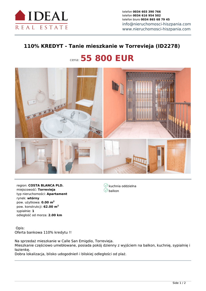telefon 0034 603 390 766 telefon 0034 616 954 502 telefon biuro 0034 865 68 79 45 [email protected] www.nieruchomosci-hiszpania.com 110% KREDYT - Tanie mieszkanie w Torrevieja (ID2278) cena: region: COSTA BLANCA PLD. miejscowość: Torrevieja typ nieruchomości: Apartament rynek: wtórny pow. użytkowa: 0.00 m2 pow. konstrukcji: 62.00 m2 sypialnie: 1 odległość od morza: 2.00 km 55 800 EUR kuchnia oddzielna balkon Opis: Oferta bankowa 110% kredytu !! Na sprzedaż mieszkanie w Calle San Emigdio, Torrevieja. Mieszkanie częściowo umeblowane, posiada pokój dzienny z wyjściem na balkon, kuchnię, sypialnię i łazienkę. Dobra lokalizacja, blisko udogodnień i bliskiej odległości od plaż. Side 1 / 2 www.nieruchomosci-hiszpania.com Side 2 / 2 Powered by TCPDF (www.tcpdf.org)