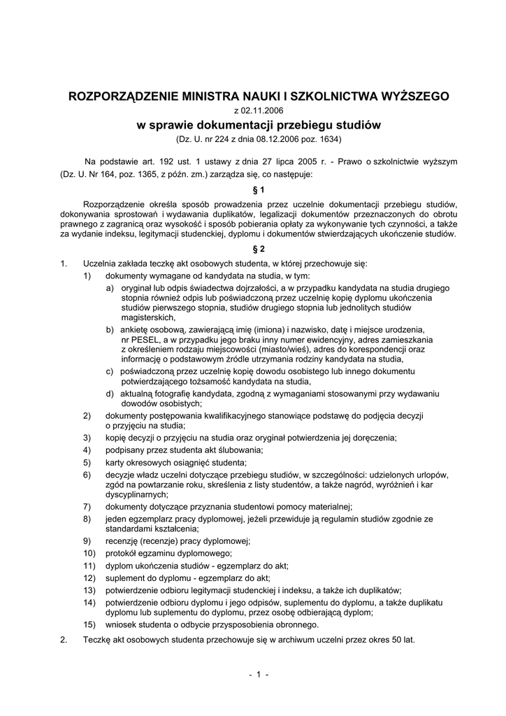 ROZPORZĄDZENIE MINISTRA NAUKI I SZKOLNICTWA WYŻSZEGO z 02.11.2006 w sprawie dokumentacji przebiegu studiów (Dz. U. nr 224 z dnia 08.12.2006 poz. 1634) Na podstawie art. 192 ust. 1 ustawy z dnia 27 lipca 2005 r. - Prawo o szkolnictwie wyższym (Dz. U. Nr 164, poz. 1365, z późn. zm.) zarządza się, co następuje: §1 Rozporządzenie określa sposób prowadzenia przez uczelnie dokumentacji przebiegu studiów, dokonywania sprostowań i wydawania duplikatów, legalizacji dokumentów przeznaczonych do obrotu prawnego z zagranicą oraz wysokość i sposób pobierania opłaty za wykonywanie tych czynności, a także za wydanie indeksu, legitymacji studenckiej, dyplomu i dokumentów stwierdzających ukończenie studiów. §2 1. Uczelnia zakłada teczkę akt osobowych studenta, w której przechowuje się: 1) dokumenty wymagane od kandydata na studia, w tym: a) oryginał lub odpis świadectwa dojrzałości, a w przypadku kandydata na studia drugiego stopnia również odpis lub poświadczoną przez uczelnię kopię dyplomu ukończenia studiów pierwszego stopnia, studiów drugiego stopnia lub jednolitych studiów magisterskich, b) ankietę osobową, zawierającą imię (imiona) i nazwisko, datę i miejsce urodzenia, nr PESEL, a w przypadku jego braku inny numer ewidencyjny, adres zamieszkania z określeniem rodzaju miejscowości (miasto/wieś), adres do korespondencji oraz informację o podstawowym źródle utrzymania rodziny kandydata na studia, c) poświadczoną przez uczelnię kopię dowodu osobistego lub innego dokumentu potwierdzającego tożsamość kandydata na studia, d) aktualną fotografię kandydata, zgodną z wymaganiami stosowanymi przy wydawaniu dowodów osobistych; 2) dokumenty postępowania kwalifikacyjnego stanowiące podstawę do podjęcia decyzji o przyjęciu na studia; 3) kopię decyzji o przyjęciu na studia oraz oryginał potwierdzenia jej doręczenia; 4) podpisany przez studenta akt ślubowania; 5) karty okresowych osiągnięć studenta; 6) decyzje władz uczelni dotyczące przebiegu studiów, w szczególności: udzielonych urlopów, zgód na powtarzanie roku, skreślenia z listy studentów, a także nagród, wyróżnień i kar dyscyplinarnych; 7) dokumenty dotyczące przyznania studentowi pomocy materialnej; 8) jeden egzemplarz pracy dyplomowej, jeżeli przewiduje ją regulamin studiów zgodnie ze standardami kształcenia; 9) recenzję (recenzje) pracy dyplomowej; 10) protokół egzaminu dyplomowego; 11) dyplom ukończenia studiów - egzemplarz do akt; 12) suplement do dyplomu - egzemplarz do akt; 13) potwierdzenie odbioru legitymacji studenckiej i indeksu, a także ich duplikatów; 14) potwierdzenie odbioru dyplomu i jego odpisów, suplementu do dyplomu, a także duplikatu dyplomu lub suplementu do dyplomu, przez osobę odbierającą dyplom; 15) wniosek studenta o odbycie przysposobienia obronnego. PP CZSK 2. Teczkę akt osobowych studenta przechowuje się w archiwum uczelni przez okres 50 lat. - 1 - 9. ROZPORZĄDZENIE MINISTRA NAUKI I SZKOLNICTWA WYŻSZEGO z 02.11.2006 w sprawie dokumentacji przebiegu studiów (Dz. U. nr 224 z dnia 08.12.2006 poz. 1634) §3 1. W przypadku przeniesienia się studenta do innej uczelni dokumenty dotyczące przebiegu studiów przesyła się na wniosek uczelni, do której student się przeniósł. 2. W uczelni, którą student opuścił, pozostaje kopia pisma, przy którym przesłano dokumenty oraz ich wykaz. §4 1. Po immatrykulacji student otrzymuje: 1) indeks, którego wzór jest określony w załączniku nr 1 do rozporządzenia; 2) legitymację studencką, której wzór jest określony w załączniku nr 2 do rozporządzenia, albo 3) elektroniczną legitymację studencką, której wzór jest określony w załączniku nr 3 do rozporządzenia. 2. Ilekroć w rozporządzeniu jest mowa bez bliższego określenia o legitymacji studenckiej, należy przez to rozumieć również elektroniczną legitymację studencką. 3. Legitymację studencką może otrzymać również student zagranicznej uczelni odbywający w polskiej uczelni część studiów pierwszego lub drugiego stopnia albo jednolitych studiów magisterskich. §5 1. Legitymacja studencka jest dokumentem poświadczającym status studenta. 2. Prawo do posiadania legitymacji studenckiej mają studenci do dnia ukończenia studiów, zawieszenia w prawach studenta lub skreślenia z listy studentów. Student, który utracił prawo do posiadania legitymacji studenckiej, obowiązany jest zwrócić ją uczelni. 3. W przypadku zniszczenia lub utraty legitymacji studenckiej student jest obowiązany do niezwłocznego zawiadomienia uczelni. 4. Ważność legitymacji studenckiej potwierdza się co semestr przez umieszczenie daty ważności i okrągłej pieczęci z godłem państwa, a elektronicznej legitymacji studenckiej - przez aktualizację danych w układzie elektronicznym oraz umieszczenie w kolejno oznaczonych polach hologramu, którego wzór jest określony w załączniku nr 4 do rozporządzenia. PP CZSK §6 1. Elektroniczna legitymacja studencka może być używana w uczelni, w szczególności jako: karta dostępu do biblioteki, karta dostępu do urządzeń technicznych i laboratoriów. 2. Za zgodą uczelni elektroniczna legitymacja studencka może być używana także poza uczelnią. §7 Uczelnia ma obowiązek zachowania szczególnych zasad bezpieczeństwa systemu wydawania i użytkowania legitymacji studenckiej. Uczelnia ponosi odpowiedzialność za bezpieczeństwo informacji zamieszczonych w legitymacji studenckiej. §8 1. Indeks stanowi własność studenta. Wydanie indeksu i legitymacji odnotowuje się w rejestrze wydanych indeksów i legitymacji, w którym wpisuje się: imię (imiona) i nazwisko studenta, któremu wydano indeks i legitymację, numer albumu oraz datę wydania dokumentów. Rejestr może być prowadzony w formie elektronicznej. 2. W przypadku studiowania na więcej niż jednym kierunku lub kontynuowania studiów na studiach drugiego stopnia student otrzymuje odrębny indeks