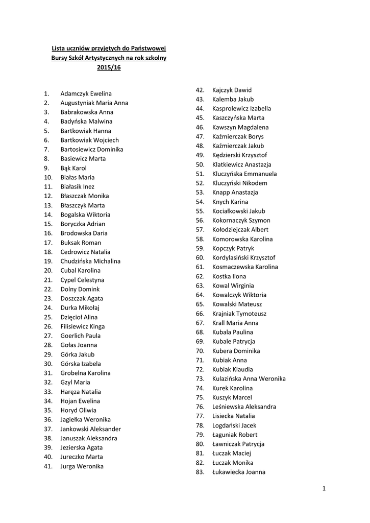 Lista uczniów przyjętych do Państwowej Bursy Szkół Artystycznych na rok szkolny 2015/16 1. 2. 3. 4. 5. 6. 7. 8. 9. 10. 11. 12. 13. 14. 15. 16. 17. 18. 19. 20. 21. 22. 23. 24. 25. 26. 27. 28. 29. 30. 31. 32. 33. 34. 35. 36. 37. 38. 39. 40. 41. Adamczyk Ewelina Augustyniak Maria Anna Babrakowska Anna Badyńska Malwina Bartkowiak Hanna Bartkowiak Wojciech Bartosiewicz Dominika Basiewicz Marta Bąk Karol Białas Maria Białasik Inez Błaszczak Monika Błaszczyk Marta Bogalska Wiktoria Boryczka Adrian Brodowska Daria Buksak Roman Cedrowicz Natalia Chudzińska Michalina Cubal Karolina Cypel Celestyna Dolny Domink Doszczak Agata Durka Mikołaj Dzięcioł Alina Filisiewicz Kinga Goerlich Paula Gołas Joanna Górka Jakub Górska Izabela Grobelna Karolina Gzyl Maria Haręza Natalia Hojan Ewelina Horyd Oliwia Jagiełka Weronika Jankowski Aleksander Januszak Aleksandra Jezierska Agata Jureczko Marta Jurga Weronika 42. 43. 44. 45. 46. 47. 48. 49. 50. 51. 52. 53. 54. 55. 56. 57. 58. 59. 60. 61. 62. 63. 64. 65. 66. 67. 68. 69. 70. 71. 72. 73. 74. 75. 76. 77. 78. 79. 80. 81. 82. 83. Kajczyk Dawid Kalemba Jakub Kasprolewicz Izabella Kaszczyńska Marta Kawszyn Magdalena Kaźmierczak Borys Kaźmierczak Jakub Kędzierski Krzysztof Klatkiewicz Anastazja Kluczyńska Emmanuela Kluczyński Nikodem Knapp Anastazja Knych Karina Kociałkowski Jakub Kokornaczyk Szymon Kołodziejczak Albert Komorowska Karolina Kopczyk Patryk Kordylasiński Krzysztof Kosmaczewska Karolina Kostka Ilona Kowal Wirginia Kowalczyk Wiktoria Kowalski Mateusz Krajniak Tymoteusz Krall Maria Anna Kubala Paulina Kubale Patrycja Kubera Dominika Kubiak Anna Kubiak Klaudia Kulazińska Anna Weronika Kurek Karolina Kuszyk Marcel Leśniewska Aleksandra Lisiecka Natalia Logdański Jacek Łaguniak Robert Ławniczak Patrycja Łuczak Maciej Łuczak Monika Łukawiecka Joanna 1 84. 85. 86. 87. 88. 89. 90. 91. 92. 93. 94. 95. 96. 97. 98. 99. 100. 101. 102. 103. 104. 105. 106. 107. 108. 109. 110. 111. 112. 113. 114. 115. 116. 117. 118. 119. 120. 121. 122. 123. 124. 125. 126. 127. 128. 129. Łukawiecka Katarzyna Łuszczewska Wiktoria Łysenko Anna Majewska Melania Małysz Amelia Marach Nicole Marchwiak Marta Marciniak Jagna Marcysiak Marcelina Masłowska Jagoda Merda Karolina Michalska Rozalia Michałowicz Kaja Miękus Nicol Mikuła Aleksandra Miłoś Agata Miśkowiec Dominika Mizera Wojciech Moczulski Jan Molka Adrianna Morawska Magdalena Morawska Weronika Murek Małgorzata Nahorska Aleksandra Ngugen Filip Nowak Anastazja Nowak Olga Ogorzałek Ada Olejnik Antonina Osam - Gyaabin Dominika Osses Maria Anna Pabian Monika Pacholec Szymon Parzych Katarzyna Patroniak Daria Pawlaczyk Miłosz Pazdej Kacper Perlicjan Marcin Piątek Natalia Piechna Wiktoria Piekarz Justyna Piwowarek Aleksandra Piznal Estera Przybylak Ewa Przybylski Marcel Rab Michał 130. 131. 132. 133. 134. 135. 136. 137. 138. 139. 140. 141. 142. 143. 144. 145. 146. 147. 148. 149. 150. 151. 152. 153. 154. 155. 156. 157. 158. 159. 160. 161. 162. 163. 164. 165. 166. 167. 168. 169. 170. 171. 172. 173. 174. 175. Radajewska Julia Radwańska Agata Ralcewicz Wiktoria Ratajewska Izabela Rogowska Wiktoria Rusek Jagoda Ruszkiewicz Maciej Rutkowska Julia Rutkowski Eryk Rutkowski Kamil Rybak Marta Sadowska Martyna Sarnowska Martyna Sikorska Justyna Skalmowska Zuzia Skorodziej Paulina Sławiński Aleksander Słomińska Jagoda Smaga Dominika Sobecka Rozalia Sobisiak Łukasz Sobol Paweł Sołtysiak Natalia Sołtysiak Wanda Aleksandra Sprenger Paulina Spychaj Paulina Stanicka Krystyna Stanicki Stanisław Staniewska Natalia Stankiewicz Karolina Stankowski Jakub Styczyński Jan Suchecka Gabriela Szajek Marianna Szalkowska Monika Szczepanek Kornelia Sztój Kamil Szwarc Maria Magdalena Ślęzak Dominik Tarnawska Aleksandra Telega Michał Tian Li Tkaczyk Paulina Tomkowiak Jakub Traczyk Aleksandra Urbaniak Tobiasz 2 176. 177. 178. 179. 180. 181. 182. 183. 184. 185. 186. 187. 188. 189. 190. 191. 192. Walkowiak Sonia Wieczorek Dominika Wieczorek Klaudia Wnukowska Aleksandra Wojtanowska Weronika Woźniak Olga Woźniak Oliwia Wójcik Laura Wróblewska Julia Wrzeszcz Zuzanna Zadroga Gabriela Zahorska Wiktoria Zalesińska Kalina Zelent Michał Zoszczak Ariel Zwierz Aleksandra Zych Agata Poznań, dnia 6 lipca 2015 r. Przewodnicząca Komisji rekrutacyjnej Agata Ostwald wicedyrektor 3