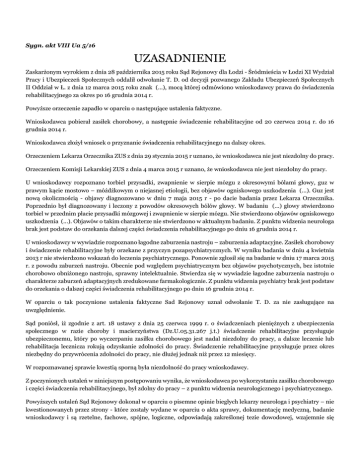 Sygn. akt VIII Ua 5/16 UZASADNIENIE Zaskarżonym wyrokiem z dnia 28 października 2015 roku Sąd Rejonowy dla Łodzi - Śródmieścia w Łodzi XI Wydział Pracy i Ubezpieczeń Społecznych oddalił odwołanie T. D. od decyzji pozwanego Zakładu Ubezpieczeń Społecznych II Oddział w Ł. z dnia 12 marca 2015 roku znak (...), mocą której odmówiono wnioskodawcy prawa do świadczenia rehabilitacyjnego za okres po 16 grudnia 2014 r. Powyższe orzeczenie zapadło w oparciu o następujące ustalenia faktyczne. Wnioskodawca pobierał zasiłek chorobowy, a następnie świadczenie rehabilitacyjne od 20 czerwca 2014 r. do 16 grudnia 2014 r. Wnioskodawca złożył wniosek o przyznanie świadczenia rehabilitacyjnego na dalszy okres. Orzeczeniem Lekarza Orzecznika ZUS z dnia 29 stycznia 2015 r uznano, że wnioskodawca nie jest niezdolny do pracy. Orzeczeniem Komisji Lekarskiej ZUS z dnia 4 marca 2015 r uznano, że wnioskodawca nie jest niezdolny do pracy. U wnioskodawcy rozpoznano torbiel przysadki, zwapnienie w sierpie mózgu z okresowymi bólami głowy, guz w prawym kącie mostowo – móżdżkowym o niejasnej etiologii, bez objawów ogniskowego uszkodzenia (...). Guz jest nową okolicznością - objawy diagnozowano w dniu 7 maja 2015 r - po dacie badania przez Lekarza Orzecznika. Poprzednio był diagnozowany i leczony z powodów okresowych bólów głowy. W badaniu (...) głowy stwierdzono torbiel w przednim płacie przysadki mózgowej i zwapnienie w sierpie mózgu. Nie stwierdzono objawów ogniskowego uszkodzenia (...). Objawów o takim charakterze nie stwierdzono w aktualnym badaniu. Z punktu widzenia neurologa brak jest podstaw do orzekania dalszej części świadczenia rehabilitacyjnego po dniu 16 grudnia 2014 r. U wnioskodawcy w wywiadzie rozpoznano łagodne zaburzenia nastroju – zaburzenia adaptacyjne. Zasiłek chorobowy i świadczenie rehabilitacyjne były orzekane z przyczyn pozapsychiatrycznych. W wyniku badania w dniu 4 kwietnia 2013 r nie stwierdzono wskazań do leczenia psychiatrycznego. Ponownie zgłosił się na badanie w dniu 17 marca 2015 r. z powodu zaburzeń nastroju. Obecnie pod względem psychiatrycznym bez objawów psychotycznych, bez istotnie chorobowo obniżonego nastroju, sprawny intelektualnie. Stwierdza się w wywiadzie łagodne zaburzenia nastroju o charakterze zaburzeń adaptacyjnych zredukowane farmakologicznie. Z punktu widzenia psychiatry brak jest podstaw do orzekania o dalszej części świadczenia rehabilitacyjnego po dniu 16 grudnia 2014 r. W oparciu o tak poczynione ustalenia faktyczne Sad Rejonowy uznał odwołanie T. D. za nie zasługujące na uwzględnienie. Sąd poniósł, iż zgodnie z art. 18 ustawy z dnia 25 czerwca 1999 r. o świadczeniach pieniężnych z ubezpieczenia społecznego w razie choroby i macierzyństwa (Dz.U.05.31.267 j.t.) świadczenie rehabilitacyjne przysługuje ubezpieczonemu, który po wyczerpaniu zasiłku chorobowego jest nadal niezdolny do pracy, a dalsze leczenie lub rehabilitacja lecznicza rokują odzyskanie zdolności do pracy. Świadczenie rehabilitacyjne przysługuje przez okres niezbędny do przywrócenia zdolności do pracy, nie dłużej jednak niż przez 12 miesięcy. W rozpoznawanej sprawie kwestią sporną była niezdolność do pracy wnioskodawcy. Z poczynionych ustaleń w niniejszym postępowaniu wynika, że wnioskodawca po wykorzystaniu zasiłku chorobowego i części świadczenia rehabilitacyjnego, był zdolny do pracy – z punktu widzenia neurologicznego i psychiatrycznego. Powyższych ustaleń Sąd Rejonowy dokonał w oparciu o pisemne opinie biegłych lekarzy neurologa i psychiatry – nie kwestionowanych przez strony - które zostały wydane w oparciu o akta sprawy, dokumentację medyczną, badanie wnioskodawcy i są rzetelne, fachowe, spójne, logiczne, odpowiadają zakreślonej tezie dowodowej, wzajemnie się uzupełniają i potwierdzają własne wnioski. Biegli wyjaśnili, jakiego dokonali rozpoznania i na czym się w tym zakresie się opierali, nadto jaki wpływ miało to rozpoznanie na stwierdzenie zdolności do pracy wnioskodawcy. U wnioskodawcy rozpoznano torbiel przysadki, zwapnienie w sierpie mózgu z okresowymi bólami głowy, guz w prawym kącie mostowo – móżdżkowym o niejasnej etiologii, bez objawów ogniskowego uszkodzenia (...). Przy czym guz jest nową okolicznością - objawy diagnozowano w dniu 7 maja 2015 r. - czyli po upływie znacznego czasu po dacie badania przez Lekarza Orzecznika. Poprzednio był diagnozowany i leczony z powodów okresowych bólów głowy. W badaniu (...) głowy stwierdzono torbiel w przednim płacie przysadki mózgowej i zwapnienie w sierpie mózgu. Nie stwierdzono jednak objawów ogniskowego uszkodzenia (...). Objawów o takim charakterze nie stwierdzono także w aktualnym badaniu, brak jest zatem podstaw do orzekania dalszej części świadczenia rehabilitacyjnego po dniu 16 grudnia 2014 r. U wnioskodawcy w wywiadzie rozpoznano łagodne zaburzenia nastroju – zaburzenia adaptacyjne. Zasiłek chorobowy i świadczenie rehabilitacyjne były orzekane jednak z przyczyn pozapsychiatrycznych. W wyniku badania w dniu 4 kwietnia 2013 r nie stwierdzono wskazań do leczenia psychiatrycznego. Ponownie wnioskodawca zgłosił się na badanie w dniu 17 marca 2015 r. z powodu zaburzeń nastroju. Obecnie pod względem psychiatrycznym bez objawów psychotycznych, bez istotnie chorobowo obniżonego nastroju, sprawny intelektualnie. Stwierdza się w wywiadzie łagodne zaburzenia nastroju o charakterze zaburzeń adaptacyjnych zredukowane farmakologicznie. W konkluzji Sąd Rejonowy uznał, że brak jest podstaw do orzekania o dalszej części świadczenia rehabilitacyjnego po dniu 16 grudnia 2014 r. także z przyczyn psychiatrycznych i przedmiotowe odwołanie oddalił. Apelację wprost od całości powyższego orzeczenia wniósł wnioskodawca, który wyrokowi zarzucił niepełną ocenę wewnętrznej dokumentacji medycznej w związku z przeprowadzonymi badaniami przez lekarzy orzecznik