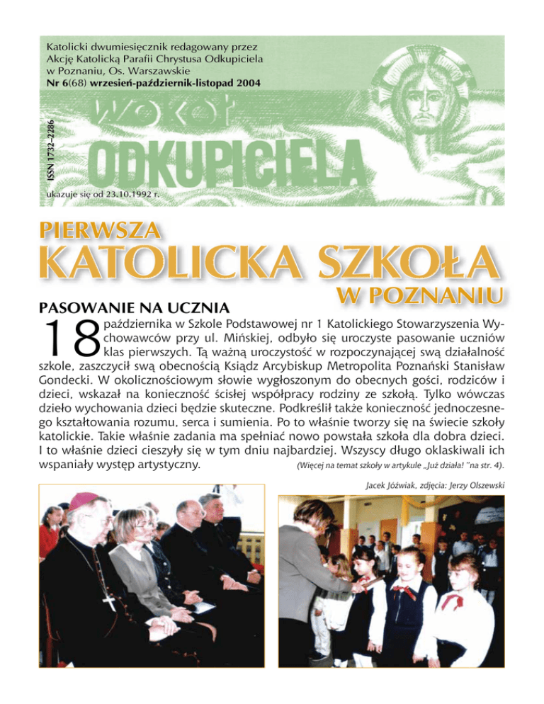 WOKÓŁ ODKUPICIELA NR 6/2004 ISSN 1732–2286 Katolicki dwumiesiêcznik redagowany przez Akcjê Katolick¹ Parafii Chrystusa Odkupiciela w Poznaniu, Os. Warszawskie Nr 6(68) wrzesień-październik-listopad 2004 ukazuje siê od 23.10.1992 r. PIERWSZA KATOLICKA SZKOŁA W POZNANIU PASOWANIE NA UCZNIA 18 października w Szkole Podstawowej nr 1 Katolickiego Stowarzyszenia Wychowawców przy ul. Mińskiej, odbyło się uroczyste pasowanie uczniów klas pierwszych. Tą ważną uroczystość w rozpoczynającej swą działalność szkole, zaszczycił swą obecnością Ksiądz Arcybiskup Metropolita Poznański Stanisław Gondecki. W okolicznościowym słowie wygłoszonym do obecnych gości, rodziców i dzieci, wskazał na konieczność ścisłej współpracy rodziny ze szkołą. Tylko wówczas dzieło wychowania dzieci będzie skuteczne. Podkreślił także konieczność jednoczesnego kształtowania rozumu, serca i sumienia. Po to właśnie tworzy się na świecie szkoły katolickie. Takie właśnie zadania ma spełniać nowo powstała szkoła dla dobra dzieci. I to właśnie dzieci cieszyły się w tym dniu najbardziej. Wszyscy długo oklaskiwali ich wspaniały występ artystyczny. (Więcej na temat szkoły w artykule „Już działa! ”na str. 4). Jacek Jóźwiak, zdjęcia: Jerzy Olszewski –1– WOKÓŁ ODKUPICIELA G NR 6/2004 Aby nie stracić nadziei dy zbliża się Boże Narodzenie, myślimy o życzeniach, jakie pragnęlibyśmy złożyć naszym bliskim i znajomym. Często myślimy także o darach i upominkach dla nich. Wówczas zastanawiamy się, co byłoby im najbardziej potrzebne i na ile stać nas na to. Jako Duszpasterz zastanawiałem się nad darem, jakim w tym roku Boże Narodzenie powinno przynieść moim Parafianom. Wiem, że liczne i rozmaite są ich potrzeby. Są tacy, którzy nie mają pracy, wielu dręczy lęk i niepokój o jutro, wielu doskwiera bieda. Jest jednak coś, czego potrzeba wszystkim. To nadzieja. Wielu ludzi ją traci. Wielu zostało dotkniętych przez zniechęcenie, brak wiary w przyszłość, bezsilność wobec narastających problemów. Jakże potrzebna jest nam nadzieja!!! Jak ją na nowo przywrócić? Na czym ją oprzeć? Zawiedli niekiedy nas ludzie, na których stawialiśmy. Zawiodły programy i obietnice. Na dodatek media codziennie zasypują informacjami o sprzeniewierzeniach, krzywdach, niesprawiedliwości, o agresji, a także o terroryzmie, który rzekomo czyha wszędzie. Ma się wrażenie, że idzie jakieś nieznane „nowe”, że w świecie bierze górę nienawiść, prawo zemsty i odwetu, a więc droga, która prowadzi do nikąd. Gdy wszechobecną stawać się zdaje beznadzieja, oto nad światem rozbrzmiewa orędzie, które z Nieba przychodzi: Nie bójcie się! Zwiastuję wam radość wielką... Dziś w mieście Dawida narodził się wam Zbawiciel.. A to będzie dla was znakiem. Znajdziecie Niemowlę owinięte w pieluszki i leżące w żłobie... Chwała Bogu na wysokościach, a na ziemi pokój ludziom... (Łk 2, 10-14). Rodzi się Bóg-Człowiek! Przychodzi do nas, grzesznych ludzi, którzy nieraz od Niego się odwracamy. Przychodzi nie po to, by sądzić i potępiać, lecz zbawić. Przychodzi szukać tego, co zginęło, co ugrzęzło w złu, co pogrążyło się w rozpaczy. Przychodzi, ponieważ nas kocha. Nikt nie jest Mu obcy ani obojętny. Ze szczególną troską pochyla się nad tymi, którym najciężej. Oto Jezus Chrystus - Emmanuel - Bóg z nami! On jeden jest w stanie podnieść człowieka z upadku, wydobyć go z bezsensu, przywrócić mu godność, wyzwolić z beznadziei, napełnić pokojem. Niech radość i nadzieja, płynące z orędzia Bożego Narodzenia, zagoszczą w Waszych sercach! Podnieście głowy i nabierzcie ducha, bo trzeba iść dalej! Trzeba postępować w dobrym! Trzeba stawać się tym, czym jesteśmy w powołaniu naszym, a więc stawać się synami i córkami Bożymi. Ta nadzieja, oparta na Bogu, zawieźć nie może. Ks. Proboszcz Drodzy Czytelnicy „Wokół Odkupiciela” Na zbliżające się Święta Bożego Narodzenia pragniemy złożyć Wam najserdeczniejsze życzenia: Dobrego zdrowia, długiego życia, Pomyślności, spełnienia marzeń, Zadowolenia, wewnętrznego spokoju, Wytrwałości w dążeniu do jedności z Bogiem i ludźmi. Ks. Proboszcz Wojciech Ks. Wikariusz Marek Redakcja „Wokół Odkupiciela” –2– WOKÓŁ ODKUPICIELA 24 NR 6/2004 Parafialne Święto października – Odpust parafialny ku czci Chrystusa Odkupiciela oraz siódma rocznica konsekracji naszego Kościoła. Podczas uroczystej mszy świętej dziękowaliśmy Bogu za wszystkie łaski i dobrodziejstwa. Prosiliśmy o pokój, o przemianę serc i dobro w naszych rodzinach. Na zakończenie odbyła się Procesja Eucharystyczna wokół placu kościelnego, potem śpiew „Te Deum Laudamus”, a następnie błogosławieństwo Najświętszym Sakramentem. Maria Dworczak Harcerski Apel W sobotę, dnia 18 września w kaplicy Zgromadzenia Sióstr Miłosierdzia św. Wincentego a` Paulo na naszym Osiedlu spotkały się harcerskie drużyny seniorów, które przybyły, aby uczestniczyć w uroczystej Mszy św. odprawionej w intencji poznańskich Harcerzy poległych w II Wojnie Światowej. Harcerze seniorzy z kręgów: „OWAR”, „WIARUSY”, 10 PHD Śródka oraz delegacje z innych kręgów wypełniły całą kaplicę. Mszę św. odprawił ks. prałat Jerzy Adamczak oraz ks. Paweł Kujawa - kapelan Wielkopolskiej Chorągwi ZHP. Po zakończonej Mszy św. zwarta kolumna harcerska wyruszyła na pobliski skwer położony przy Szkole Podstawowej nr 86, gdzie pod obeliskiem upamiętniającym śmierć druha Edwarda Pietrzykowskiego, złożono wiązanki kwiatów i zapalono znicze. Uroczystość zakończył Apel Poległych Harcerek i Harcerzy, którzy odeszli na „wieczną wartę”. JOL –3– WOKÓŁ ODKUPICIELA NR 6/2004 Szkoła Podstawowa Katolickiego Stowarzyszenia Wychowawców JUŻ DZIAŁA ! „Takie będą Rzeczpospolite, jakie ich młodzieży chowanie” (And