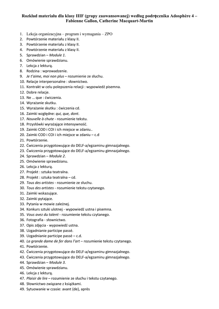 Rozkład materiału dla klasy IIIF (grupy zaawansowanej) według podręcznika Adosphère 4 – Fabienne Gallon, Catherine Macquart-Martin 1. 2. 3. 4. 5. 6. 7. 8. 9. 10. 11. 12. 13. 14. 15. 16. 17. 18. 19. 20. 21. 22. 23. 24. 25. 26. 27. 28. 29. 30. 31. 32. 33. 34. 35. 36. 37. 38. 39. 40. 41. 42. 43. 44. 45. 46. 47. 48. 49. Lekcja organizacyjna – program i wymagania – ZPO Powtórzenie materiału z klasy II. Powtórzenie materiału z klasy II. Powtórzenie materiału z klasy II. Sprawdzian – Module 1. Omówienie sprawdzianu. Lekcja z lekturą. Rodzina : wprowadzenie. Je t’aime, moi non plus – rozumienie ze słuchu. Relacje interpersonalne : słownictwo. Kontrakt w celu polepszenia relacji : wypowiedź pisemna. Dobre relacje. Ne … que : ćwiczenia. Wyrażanie skutku. Wyrażanie skutku : ćwiczenia cd. Zaimki względne: qui, que, dont. Nouvelle à chute - rozumienie tekstu. Przysłówki wyrażające intensywność. Zaimki COD i COI i ich miejsce w zdaniu.. Zaimki COD i COI i ich miejsce w zdaniu – c.d Powtórzenie. Ćwiczenia przygotowujące do DELF-a/egzaminu gimnazjalnego. Ćwiczenia przygotowujące do DELF-a/egzaminu gimnazjalnego. Sprawdzian – Module 2. Omówienie sprawdzianu. Lekcja z lekturą. Projekt : sztuka teatralna. Projekt : sztuka teatralna – cd. Tous des artistes - rozumienie ze słuchu. Tous des artistes - rozumienie tekstu czytanego. Zaimki wskazujące. Zaimki pytające. Pytania w mowie zależnej. Konkurs sztuki ulotnej - wypowiedź ustna i pisemna. Vous avez du talent - rozumienie tekstu czytanego. Fotografia - słownictwo. Opis zdjęcia - wypowiedź ustna. Uzgadnianie participe passé. Uzgadnianie participe passé – c.d. La grande dame de fer dans l’art – rozumienie tekstu czytanego. Powtórzenie. Ćwiczenia przygotowujące do DELF-a/egzaminu gimnazjalnego. Ćwiczenia przygotowujące do DELF-a/egzaminu gimnazjalnego. Sprawdzian – Module 3. Omówienie sprawdzianu. Lekcja z lekturą. Plaisir de lire – rozumienie ze słuchu i tekstu czytanego. Słownictwo związane z książkami. Sytuowanie w czasie: avant (de), après 50. Sytuowanie w czasie – c.d. 51. Wyrażanie opozycji. 52. Wyrażanie opozycji – c.d. 53. Ankieta na temat czytelnictwa. 54. Zaimki względne złożone. 55. Lecture du soir, lecture du matin - rozumienie tekstu czytanego. 56. Wyrażanie strachu, obawy - słownictwo. 57. Sytuowanie w czasie - ćwiczenia. 58. Tryb subjonctif. 59. Subjonctif - ćwiczenia. 60. Subjonctif - ćwiczenia. 61. Moja ulubiona książka - prezentacja. 62. Młodzież i czytelnictwo. 63. Powtórzenie. 64. Ćwiczenia przygotowujące do DELF-a/egzaminu gimnazjalnego. 65. Ćwiczenia przygotowujące do DELF-a/egzaminu gimnazjalnego. 66. Sprawdzian – Module 4. 67. Omówienie sprawdzianu. 68. Projekt : tworzymy okładkę książki lub czasopisma. 69. Lekcja z lekturą. 70. Zawody – słownictwo. 71. Zawody – słownictwo c.d. 72. Wyrażenia: il faut que, ils voudraient que, il vaut mieux que, pour qu’on, il est normal… 73. Pisanie listu. 74. Praca wakacyjna. 75. Le plus-que-parfait 76. Le plus-que-parfait – ćwiczenia. 77. Mowa zależna. 78. Mowa zależna oraz następstwo czasów. 79. Mowa zależna oraz następstwo czasów – c.d. 80. Oryginalne zawody - wypowiedź ustna. 81. Powtórzenie. 82. Ćwiczenia przygotowujące do DELF-a/egzaminu gimnazjalnego. 83. Ćwiczenia przygotowujące do DELF-a/egzaminu gimnazjalnego. 84. Sprawdzian – Module 5. 85. Omówienie sprawdzianu. 86. Lekcja z lekturą. 87. List - rozumienie tekstu czytanego na poziomie egzaminu gimnazjalnego – p. rozszerz. 88. Artykuł - rozumienie tekstu czytanego na poziomie egzaminu gimnazjalnego. 89. List – wypowiedź pisemna. 90. Quand la fiction devient réalité - rozumienie ze słuchu. 91. Wyrażanie opinii negatywnej, wątpliwości, możliwości - wyrażenia. 92. Subjonctif lub indicatif - ćwiczenia. 93. Zaimki dzierżawcze. 94. Plus-que-parfait – ćwiczenia powtórzeniowe. 95. Wynalazki przyszłości. 96. Villes du futur - rozumienie tekstu czytanego. 97. Słownictwo - budynki w mieście. 98. Strona bierna. 99. Strona bierna - ćwiczenia. 100. Strona bierna - ćwiczenia. 101. Moje miasto w przyszłości. 102. Wyrażanie opozycji i przyzwolenia. 103. Wymyślamy przedmiot przyszłości. 104. Powtórzenie. 105. Ćwiczenia przygotowujące do DELF-a/egzaminu gimnazjalnego. 106. Ćwiczenia przygotowujące do DELF-a/egzaminu gimnazjalnego. 107. Sprawdzian – Module 6. 108. Omówienie sprawdzianu. 109. Lekcja z lekturą. 110. Dane osobowe ( opis zewnętrzny, charakter, preferencje) - wyp. ustna. 111. Dom, mieszkanie, otoczenie – słownictwo, wyp. ustna. 112. Życie w mieście/na wsi – wypowiedź ustna. 113. Życie codzienne – rodzina, miłość… - słownictwo, wyp. ustna. 114. Stosunki międzyludzkie – uczucia, emocje – wyp. ustna. 115. Święta i uroczystości – słownictwo, wyp. ustna. 116. Święta i uroczystości – słownictwo, wyp. ustna. 117. Konflikty, problemy (klasa, społeczeństwo) – wyp.ustna. 118. Podróże, transport, rezerwacja miejsc, interesujące miejsca – wyp. ustna. 119. Podróże, transport, rezerwacja miejsc, interesujące miejsca – wyp. ustna. 120. Miejsca – zabytki, miejsca atrakcyjne turystycznie – wyp. ustna. 121. Zdrowie – u lekarza – słownictwo, dialogi. 122. Zdrowie – u lekarza – słownictwo, dialogi. 123. Zainteresowania, czas wolny – wypowiedź ustna. 124. Edukacja – szkoła, przedmioty, problemy szkolne – słownictwo, wyp. ustna. 125. Nauka języków obcych – wyp. ustna. 126. Zakupy – moda, wyprzedaże, kieszonkowe. – wyp.ustna. 127. Zakupy – moda, wyprzedaże, kieszonkowe. – wyp.ustna. 128. Żywność i napoje – posiłki, szkolna stołówka, specjalności regionalne. – wyp. ustna. 129. Żywność i napoje – posiłki, szkolna stołówka, specjalności regionalne. – wyp. ustna. 130. Pogoda – prognoza pogody, klimat, ocieplenie klimatu – wyp. ustna. 131. Świat przyrody – fauna i flora, ekolo