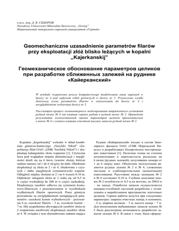 к.т.н. доц. Д. В. СИДОРОВ Narodowy Uniwersytet Mineralno-Surowcowy „Gornyj” Национальный минерально-сырьевой университет «Горный» Geomechaniczne uzasadnienie parametrów filarów przy eksploatacji złóż blisko leżących w kopalni „Kajerkanskij” Геомеханическое обоснование параметров целиков при разработке сближенных залежей на руднике «Кайерканский» W artykule rozpatrzono proces komputerowego modelowania stanu naprężeń w ławicy nr 4 pod wpływem robót górniczych w ławicy nr 2. Przytoczono wyniki ilościowej oceny parametrów filarów w zastosowaniu do ławicy nr 4 z uwzględnieniem wybierania ławicy nr 2. Рассмотрен процесс компьютерного моделирования напряженного состояния рудной пачки № 4 от влияния горных работ в рудной пачке № 2. Приведены результаты количественной оценки параметров целиков применительно к пачке № 4 с учетом влияния очистной выемки запасов рудной пачки № 2. Kopalnia „Kajerkanskij” wchodzi w skład kombinatu górniczo-hutniczego „Norylski Nikiel” (Zapoliarnyj filiał OAO „GMK Norilskij Nikiel”) i eksploatuje kalargońskie złoże wapienne [1]. Użyteczna ława pod względem stopnia dolomityzacji i marglistości dzieli się na 6 ławic (warstw złoża), którym nadano numery od 1 do 6 od góry do dołu. Obiektami eksploatacji są złoża nr 2 i nr 4, zbudowane z czystych i słabo marglistych (cementowych) wapieni. Odległość między złożami nr 2 i nr 4 wynosi 8-10 m. Głębokość zalegania złoża nr 2 waha się od 8,5 m w części wschodniej do 200 m w części zachodniej. Eksploatacja zasobów odbywa się systemem komorowo-filarowym z pozostawieniem w wyrobiskach wydłużonych filarów oporowych. Prace górnicze prowadzone są uwzględnieniem następujących parametrów: szerokość komór wybierkowych – przeważnie 6 m, szerokość filarów – 3 m, wysokość komór – 7 m. Dla uzupełnienia ubywających zasobów złoża nr 2 rozpatrzono możliwość eksploatacji zasobów złoża nr 4. W związku z tym sformułowano zadanie mające Рудник «Кайерканский» входит в состав Заполярного филиала ОАО «ГМК Норильский Никель» и разрабатывает Каларгонское месторождение известняков [1]. Полезная толща по степени доломитизации и мергелистости разделена на 6 пачек (рудных залежей), получивших номера от 1 до 6 сверху вниз. Объектами эксплуатации являются рудные залежи № 2 и № 4, сложенные чистыми и слабомергелистыми (цементными) известняками. Расстояние между залежами № 2 и № 4 составляет 8-10 м. Глубина залегания залежи № 2 колеблется от 8,5 м на востоке, до 200,0 м – на западе. Отработка запасов осуществляется камерно-столбовой системой разработки с оставлением в выработанном пространстве ленточных целиков. Горные работы ведутся при следующих параметрах: ширина очистных камер, в основном, – 6 м, ширина целиков – 3 м, высота камер – 7 м. Для восполнения выбывающих запасов залежи № 2 была рассмотрена возможность разработки запасов залежи № 4. В связи с этим, была сформу- Nr 3(505) MARZEC 2013 13 na celu uzasadnienie parametrów konstruktywnych elementów systemu eksploatacji zasobów złoża nr 4 z uwzględnieniem wpływów eksploatacji złoża nr 2. лирована задача, касающийся обоснования параметров конструктивных элементов системы разработки запасов залежи № 4 с учетом влияния разработки залежи № 2. Tworzenie modelu geomechanicznego Формирование геомеханической модели Masyw górotworu, wobec specyfiki jego kształtowania i budowy, stanowi złożony obiekt badawczy [2]. Specyficzną cechą jego budowy jest obecność zbioru powierzchni kontaktowych, ograniczających strukturalne elementy masywu (bloki, warstwy), których charakter współdziałania w istotnym stopniu wpływa na objawy ciśnienia górotworu. Na pole naprężeń w strefach ciśnienia podporowego wywiera wpływ znaczna ilość różnych czynników. Można je podzielić na górniczo-geologiczne, geometryczne i mechaniczne. Własności plastyczne skał górotworu nie są uwzględniane, ponieważ skały górotworu zwykle nie cechują się własnościami plastycznymi przy ciśnieniach, odpowiadających głębokości eksploatacji w granicach 100-150 m. Dlatego plastyczna część chwilowych (to jest, powstających w momencie przyłożenia obciążenia) odkształceń skał może być pominięta. Szczelinowatość górotworu uwzględnia się poprzez wprowadzenie współczynnika osłabienia strukturalnego, zgodnie z zaleceniami przytoczonymi w pracy [1]. Szczelinowatość górotworu wywiera wpływ na obniżenie granicy wytrzymałości skał. W stanie naturalnym szczeliny zwykle w większości są zamknięte, skoro masyw górotworu znajduje się pod wpływem trójosiowego ciśnienia. Pod