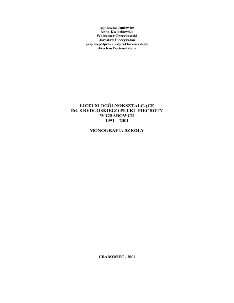 Agnieszka Juniewicz Anna Kwiatkowska Waldemar Orzechowski Jarosław Pieczykolan przy współpracy z dyrektorem szkoły Józefem Pociennikiem LICEUM OGÓLNOKSZTAŁCĄCE IM. 8 BYDGOSKIEGO PUŁKU PIECHOTY W GRABOWCU 1951 – 2001 MONOGRAFIA SZKOŁY GRABOWIEC - 2001 2 Wkrótce po zakończeniu II wojny światowej, zrodziła się wśród niektórych, światlejszych mieszkańców Grabowca myśl utworzenia szkoły średniej, powstał społeczny Komitet Szkolnictwa z Janem Pawelcem, Józefem Otrockim i Stanisławem Czechowskim na czele. Zachowały się materiały świadczące o tym, Ŝe juŜ w 1946 roku podjęto starania na rzecz utworzenia szkoły i poszukiwano kandydata na jej organizatora i dyrektora. Ostatecznie Liceum Ogólnokształcące w Grabowcu powstało dopiero w 1951 roku, a 24 lutego 1950 roku został powołany Komitet Rozbudowy Szkoły w składzie: Przewodniczący – Wójt Gminy Grabowiec Teodor Steć Skarbnik – przewodniczący Gromadzkiej Rady Narodowej Jan Kontek Członkowie – prezes Gminnej Spółdzielni – Piotr Korkosz, sekretarz KG PZPR Paweł Chudoba, komendant Ochotniczej StraŜy PoŜarnej Zygmunt Kabaczyński oraz przedstawiciele Komitetu Rodzicielskiego: Leokadia Romska, Stanisław Czechowski, a takŜe Zygmunt Mączka – sołtys osady. Na siedzibę liceum wybrano budynek siedmioklasowej szkoły powszechnej, wzniesiony przed wybuchem II wojny światowej. Celem przystosowania go dla potrzeb liceum, z inicjatywy nauczyciela matematyki i pierwszego dyrektora Stanisława Rybickiego oraz przy poparciu miejscowej społeczności, budynek rozbudowano i zmodernizowano. W początkowym okresie pracy szkoły patronat nad procesem nauczania sprawował Franciszek Wojnar – wizytator okręgu szkolnego. W 1955 roku w Grabowcu odbyła się pierwsza matura, szkołę opuściło wówczas 19 absolwentów. W roku 1957 z inicjatywy komitetu rodzicielskiego podjęto uchwałę o budowie domu nauczyciela. Konieczność wybudowania mieszkań dla nauczycieli związana była z trudnościami w znalezieniu mieszkania. Budowa była finansowana przez społeczeństwo, materiał budowlany pozyskano z rozbiórki, a prace przy doprowadzeniu budynku do stanu surowego wykonano w czynie społecznym. Prace wykończeniowe wymagały duŜych nakładów finansowych, z powodu braku funduszy dyrekcja szkoły zwróciła się o pomoc do Komitetu Odbudowy Stolicy, który zaproponował zmianę przeznaczenia gmachu na internat z moŜliwością zagospodarowania części pomieszczeń na mieszkania dla nauczycieli. Prace wykończeniowe trwały w latach 1964 – 1966, po ich zakończeniu internat Ŝeński oddano do uŜytku. Pierwszym kierownikiem internatu został Kazimierz Mołczan. Pierwotnie liceum stanowiło wraz ze szkołą podstawową jedenastoklasową placówkę pod nazwą Szkoła Ogólnokształcąca Stopnia Podstawowego i Licealnego w Grabowcu. W 1967 roku, w wyniku reformy oświaty i wprowadzenia ósmej klasy szkoły podstawowej, rozpoczęło działalność jako Liceum Ogólnokształcące w Grabowcu. 22 października 1973 roku Kuratorium Oświaty w Lublinie nadało szkole imię 8 Bydgoskiego Pułku Piechoty. Oficjalne uroczystości zorganizowano 19 stycznia 1974 roku, by uczcić jednocześnie święto pułku. Na uroczystość przybyli frontowi Ŝołnierze, z Głównym Kwatermistrzem Wojska Polskiego generałem dywizji inŜ. Mieczysławem Obiedzińskim, przedstawiciele miasta Bydgoszczy i powiatu hrubieszowskiego. 6 października 1974 roku miało miejsce wręczenie szkole sztandaru, zbiegło się ono z 30 rocznicą powstania 8 Bydgoskiego Pułku Piechoty. W latach 1973 – 1983 liceum, obok szkoły podstawowej i przedszkola, wchodziło w skład Zbiorczej Szkoły Gminnej w Grabowcu. Funkcje gminnych dyrektorów pełnili wówczas: Tadeusz Sagadyn i Marian Hawryluk. W okresie 1977 – 1984 próbowano zmienić profil kształcenia i obok jednego oddziału liceum ogólnokształcącego drugi, równoległy oddział, funkcjonował jako liceum zawodowe o profilu rolniczym. Eksperyment nie zdał jednak egzaminu i ministerstwo musiało się z propozycji wycofać. Od 1984 roku funkcjonowały dwa, równoległe oddziały liceum ogólnokształcącego; o profilu ogólnym i biologiczno-chemicznym, w 1996 roku utworzono trzeci oddział, o profilu ogólnym. Z inicjatywy dyrektora Józefa Pociennika, doszło w latach 1990 - 1992 do rozbudowy internatu, do którego od tego czasu, przyjmowani są równieŜ chłopcy. W latach 1994 – 1996 miała miejsce rozbudowa gmachu szkoły, finansowana w znacznym stopniu przez Ministerstwo Edukacji Narodowej. 18 stycznia 1997 roku nastąpiło uroczyste otwarcie nowej części budynku. Wśród zaproszonych gości, udział w uroczystości wzięli między innymi: wiceminister Edukacji Narodowej Kazimierz Dera, Kanclerz Kurii Zamojsko-Lubaczowskiej, pochodzący z Grabowca ks. prof. Franciszek Greniuk oraz Kurator Oświaty i Wychowania w Zamościu Marian Szostak. Na trzecim, przeznaczonym dla liceum piętrze, urządzono pracownie: informatyczną z dostępem do Internetu, biologiczną, chemiczną i klasopracownię języka niemieckiego. Szkoła posiada równieŜ inne klasopracownie: języka polskiego, języka angielskiego, historyczną, geograficzną, fizyczną, matematyczną a takŜe siłownię i salę gimnastyczną. Od wielu lat prowadzona jest nauka języka rosyjskiego i niemieckiego, a od 1997 roku równieŜ języka angielskiego. Uczniowie szkoły biorą udział 3 w olimpiadach i konkursach przedmiotowych, min. z języka polskiego, historii, biologii, języka angielskiego oraz zawodach sportowych. W okresie pięćdziesięciu lat w szkole pracowało ponad stu nauczycieli, a w latach 1955 – 2001, mury szkoły opuściło 2267 absolwentów. Spośród nich wywodzi się wielu nauczycieli, księŜy, lekarzy, prawników, inŜynierów i wojskowych. Mimo, Ŝe szkoła działa w środowisku wiejskim i często borykała się z róŜnymi trudnościami, zawsze spełniała swoje funkcje dydaktyczno - wychowawcze, u